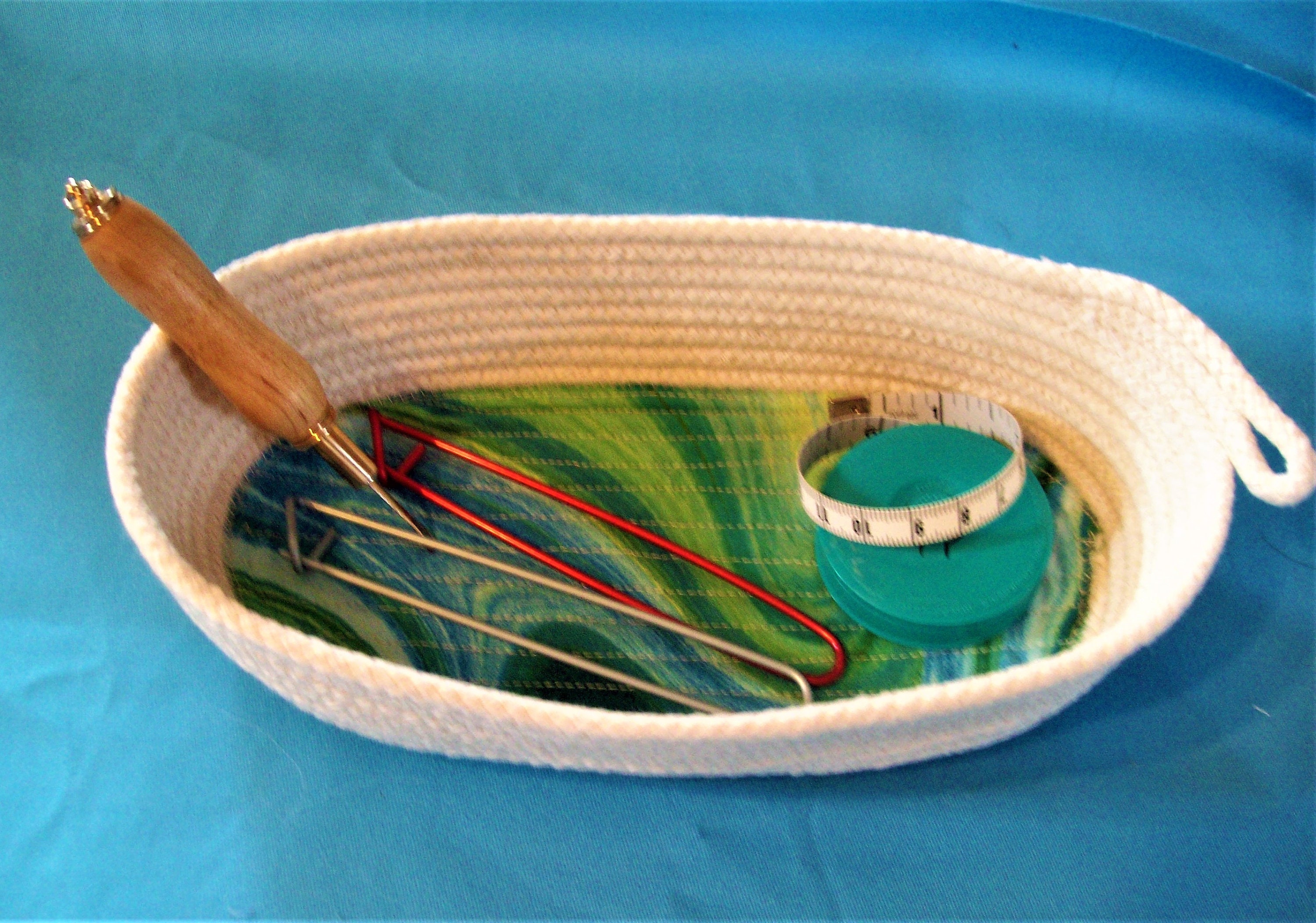 Oval Rope Basket: Teal Geometric Fabric Bottom, Contemporary Key or Eyeglass Dish