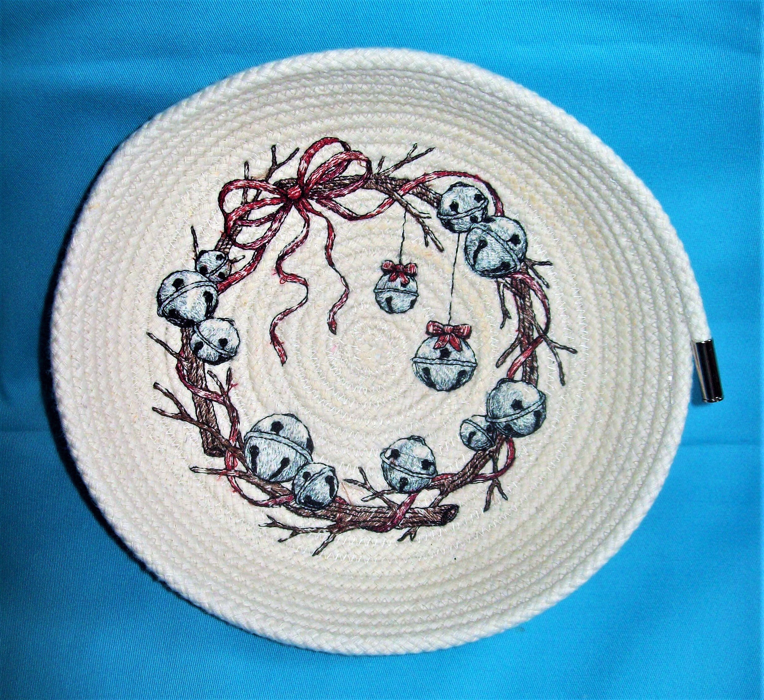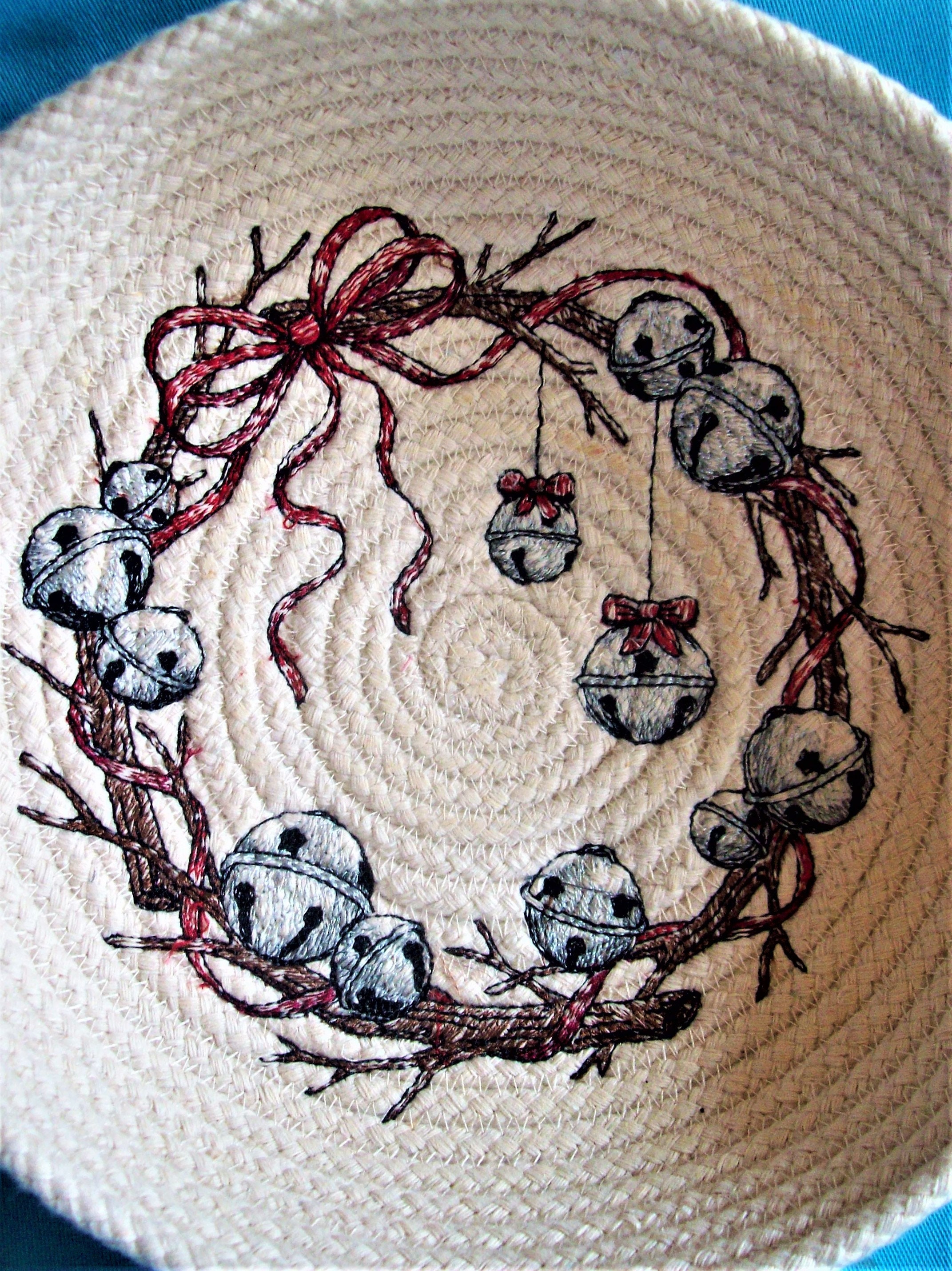 The inside design is stitched directly to the bottom of the coiled bowl on my home embroidery machine.