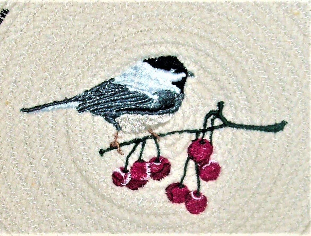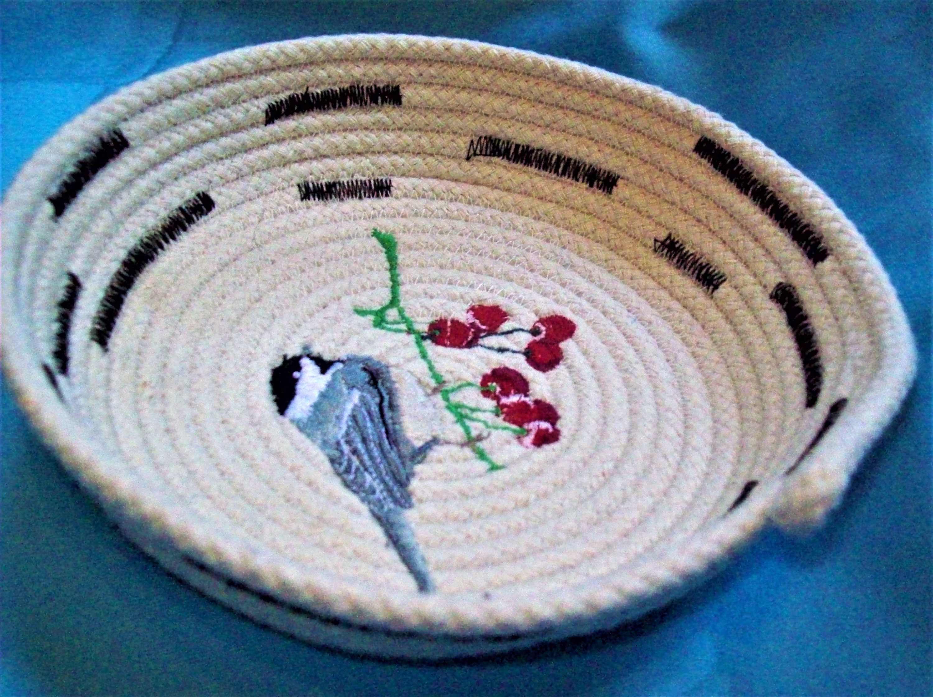 The inside design is stitched directly to the bottom of the coiled bowl on my home embroidery machine. The cord end is finished off by folding the cord back onto itself and stitched into place.
