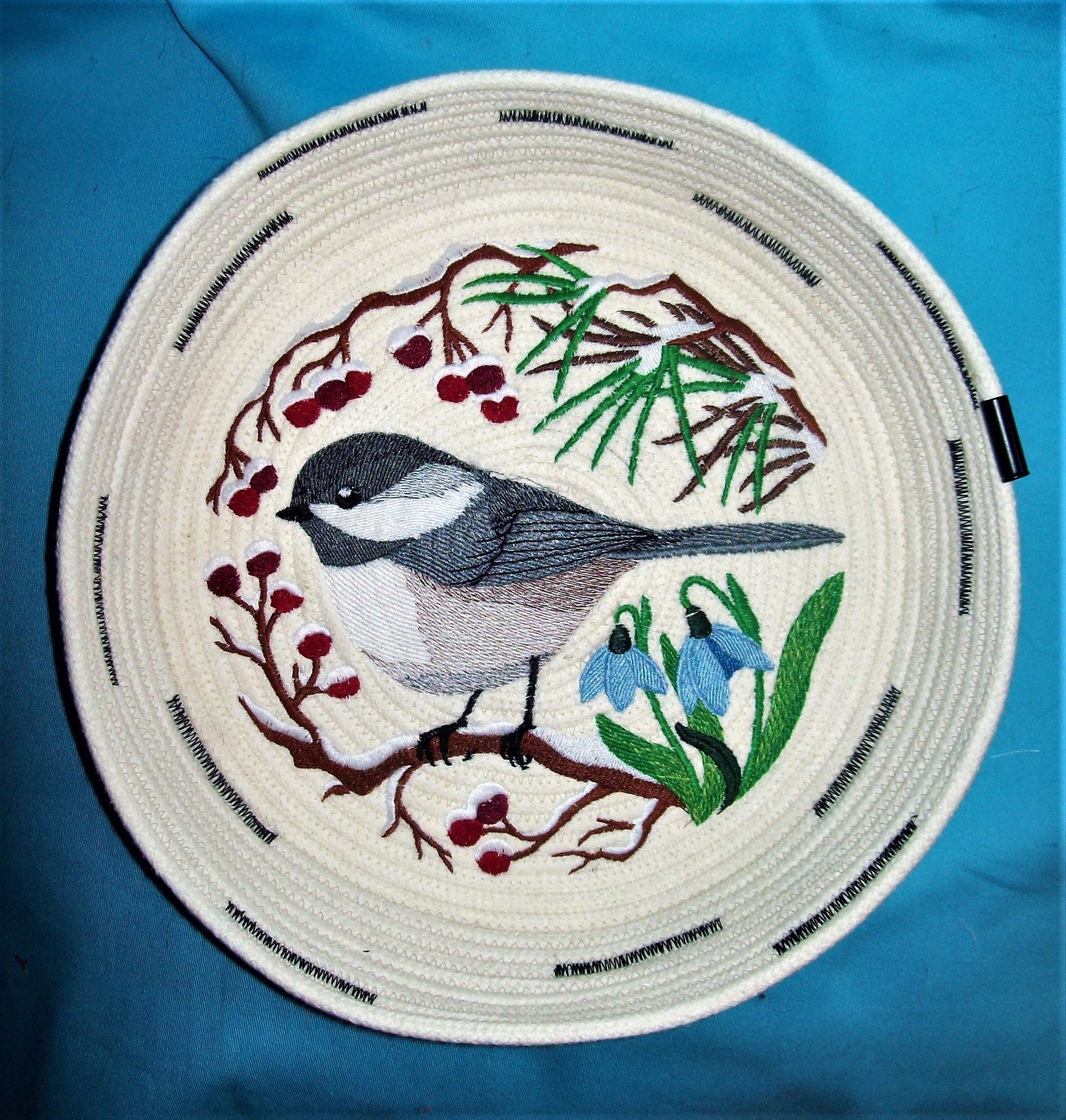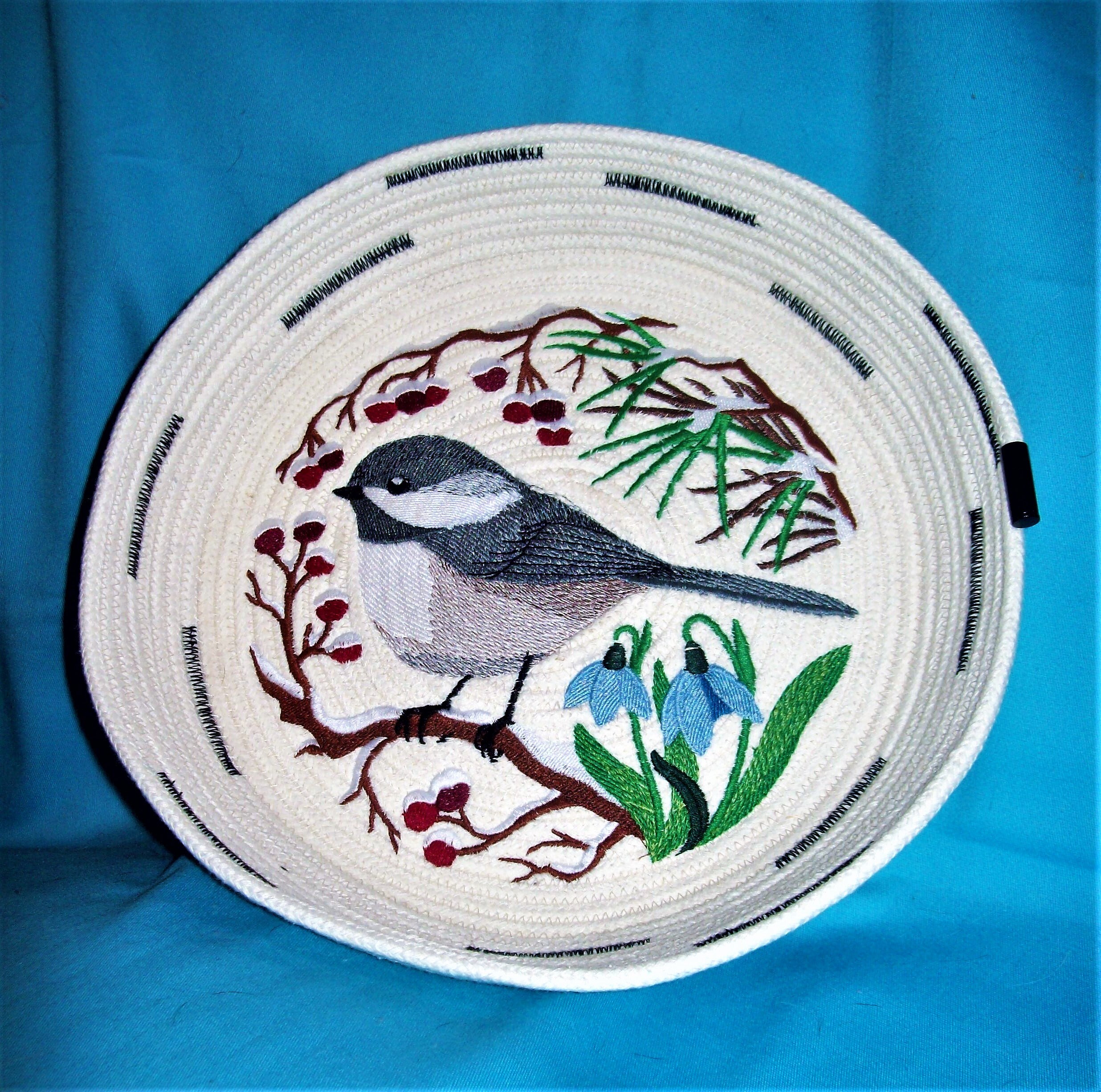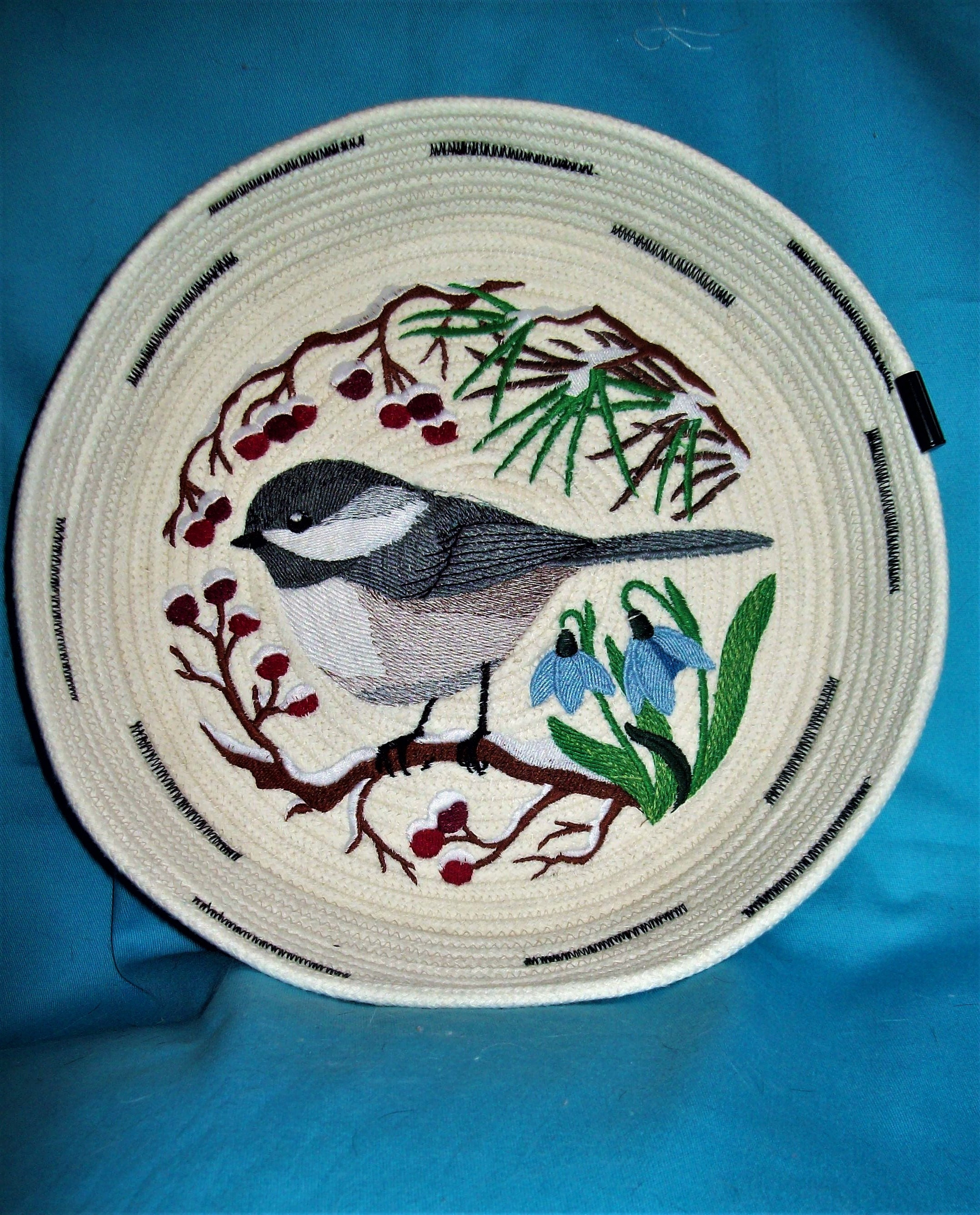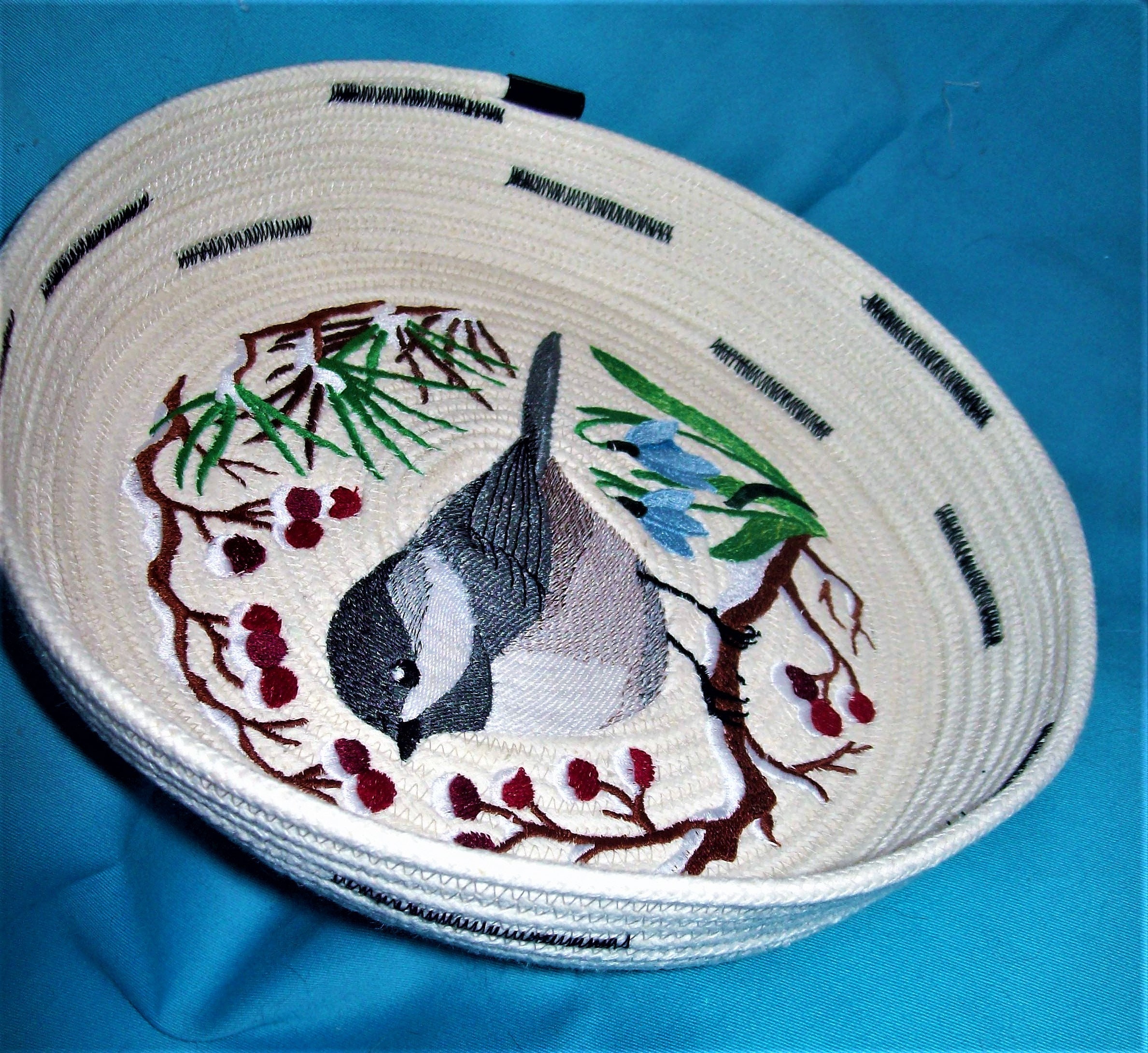 The inside design is stitched directly to the bottom of the coiled bowl on my home embroidery machine.