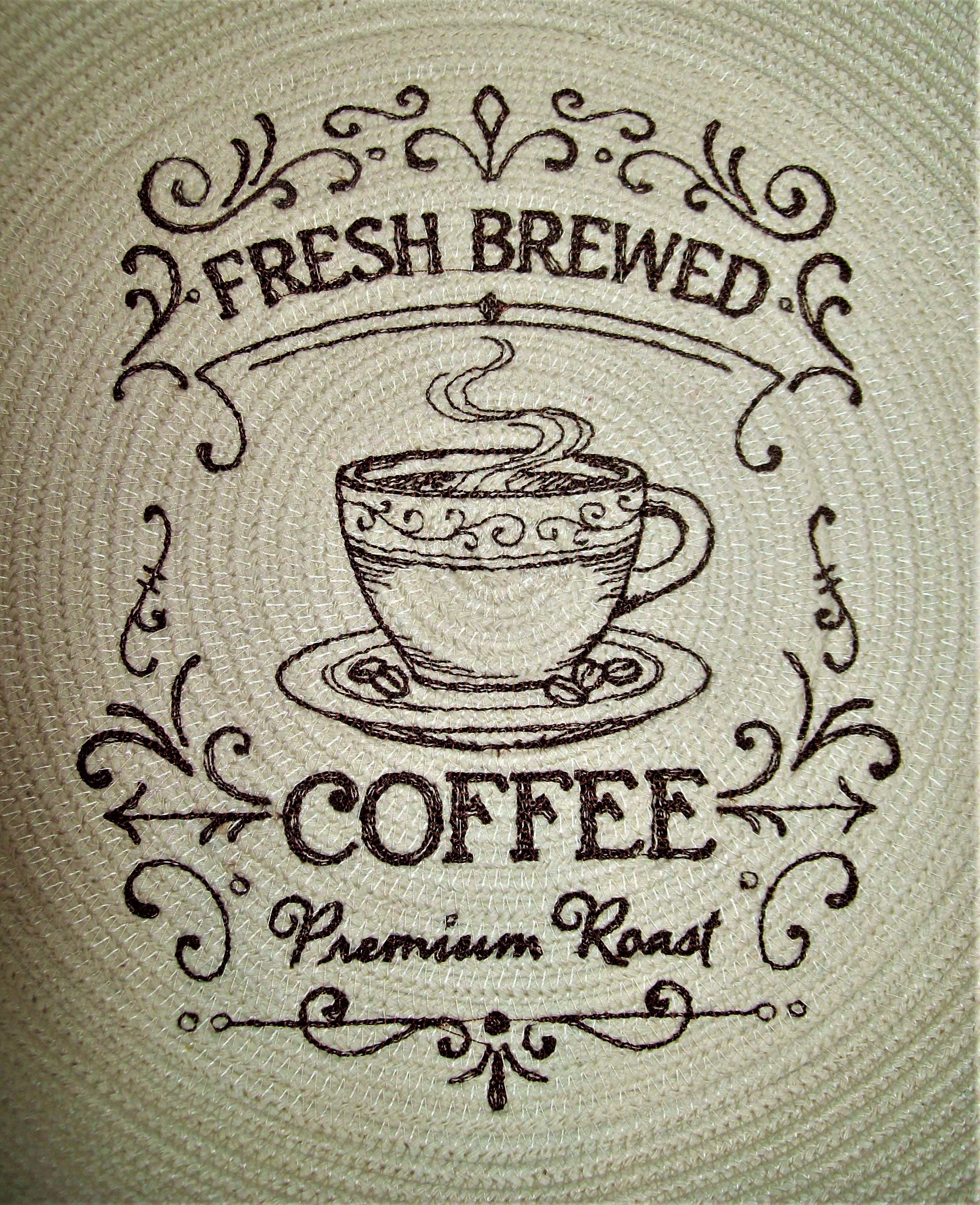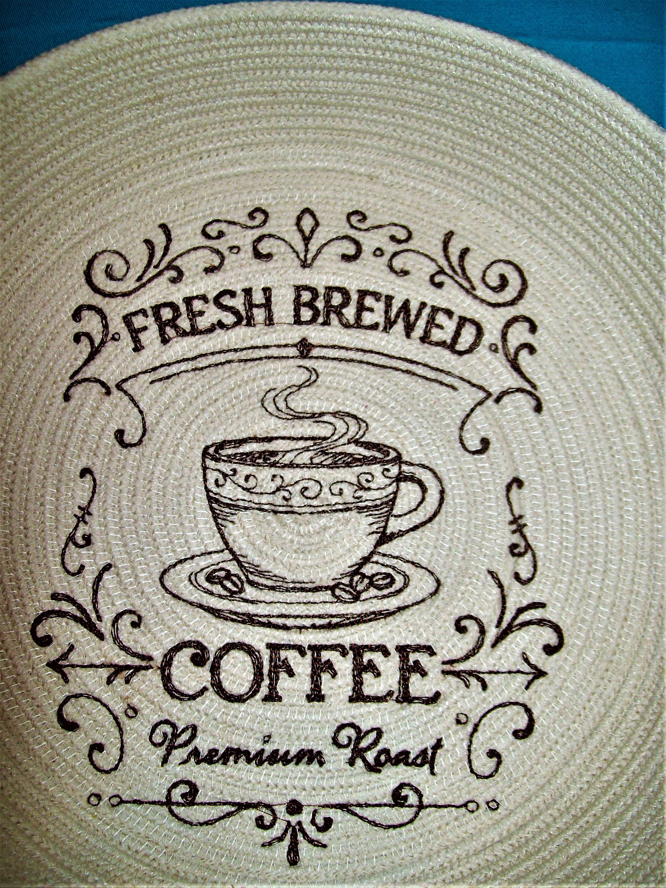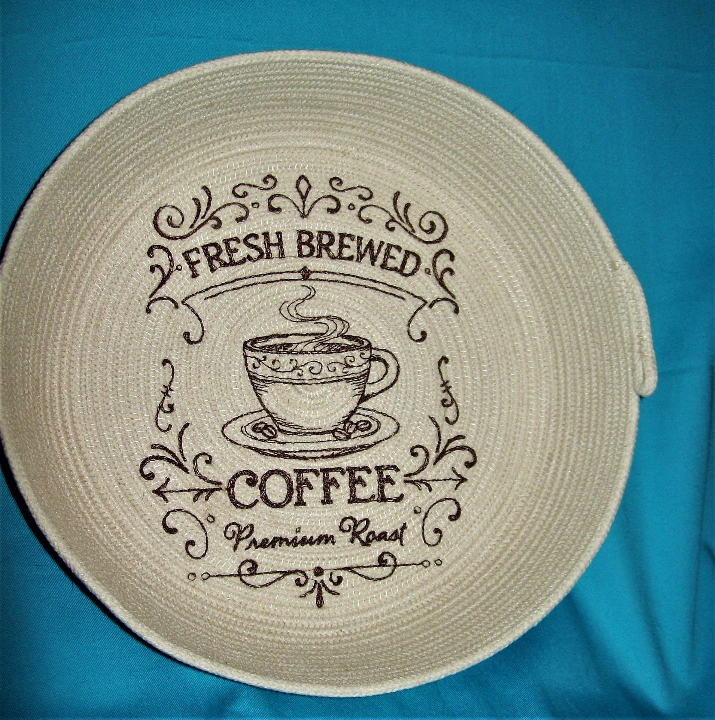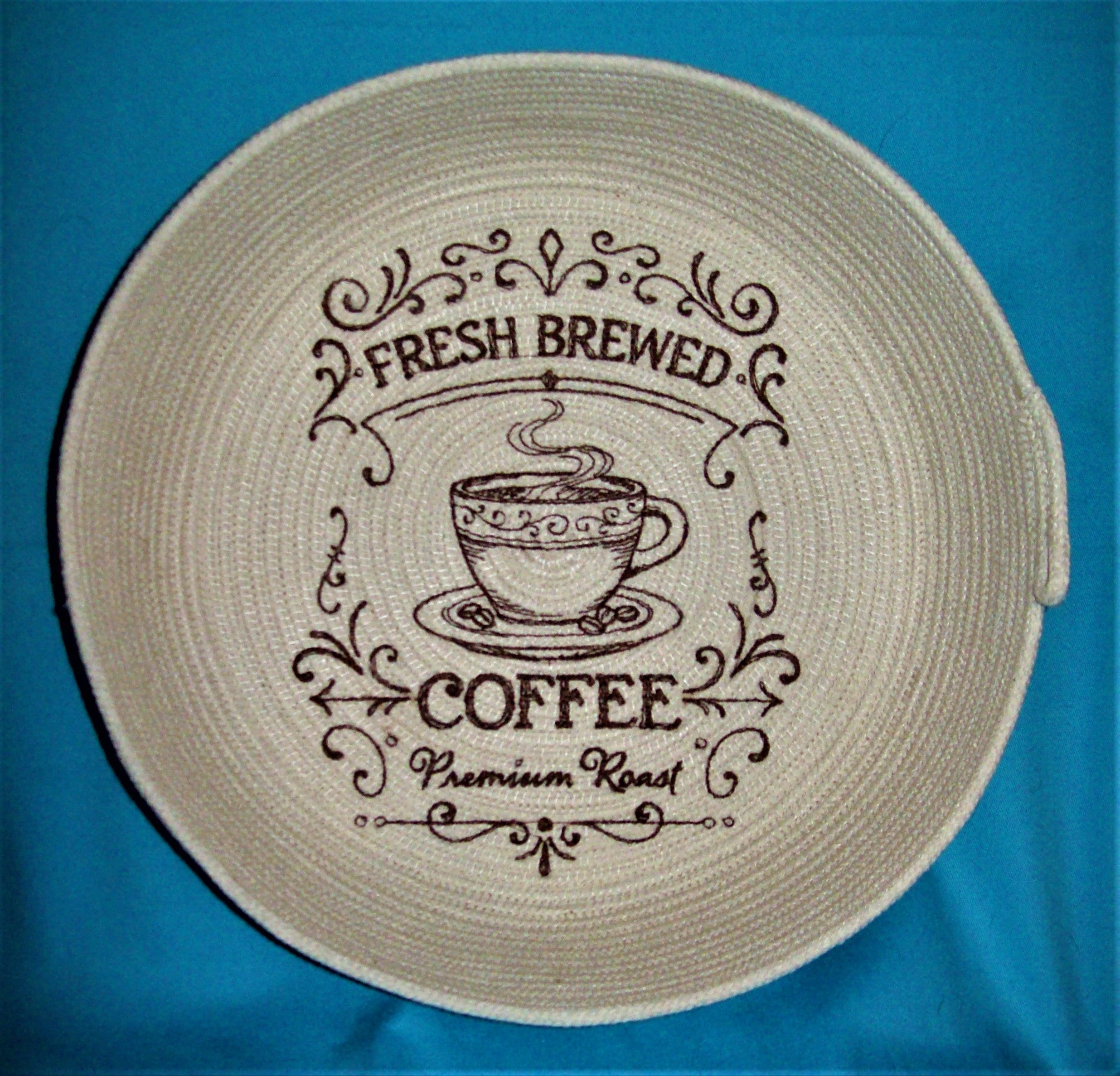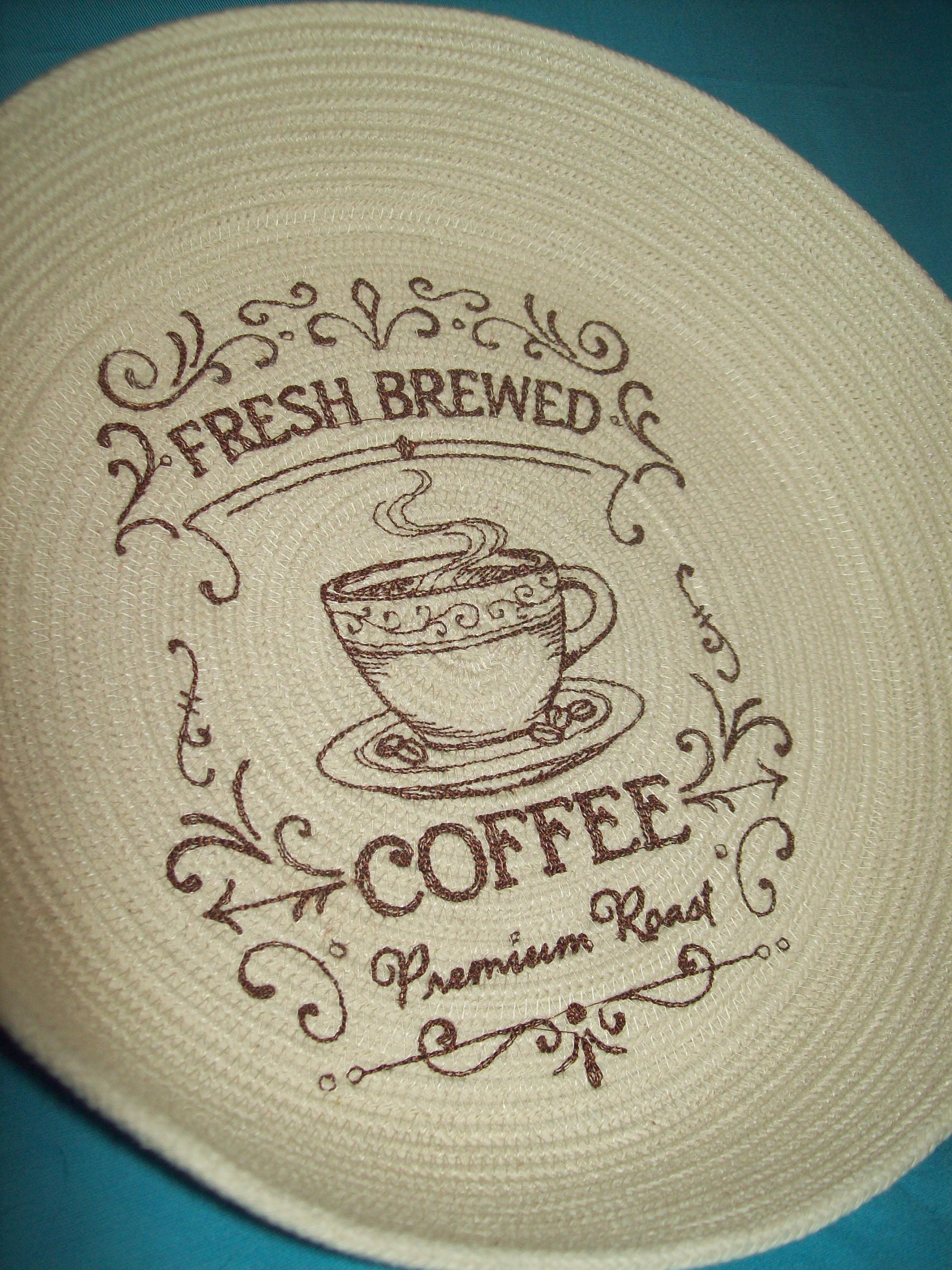 Embroidered rope bowl-Fresh Brewed Coffee basket-country style farmhouse embroidery design-coiled cotton-Montana handmade-red work style