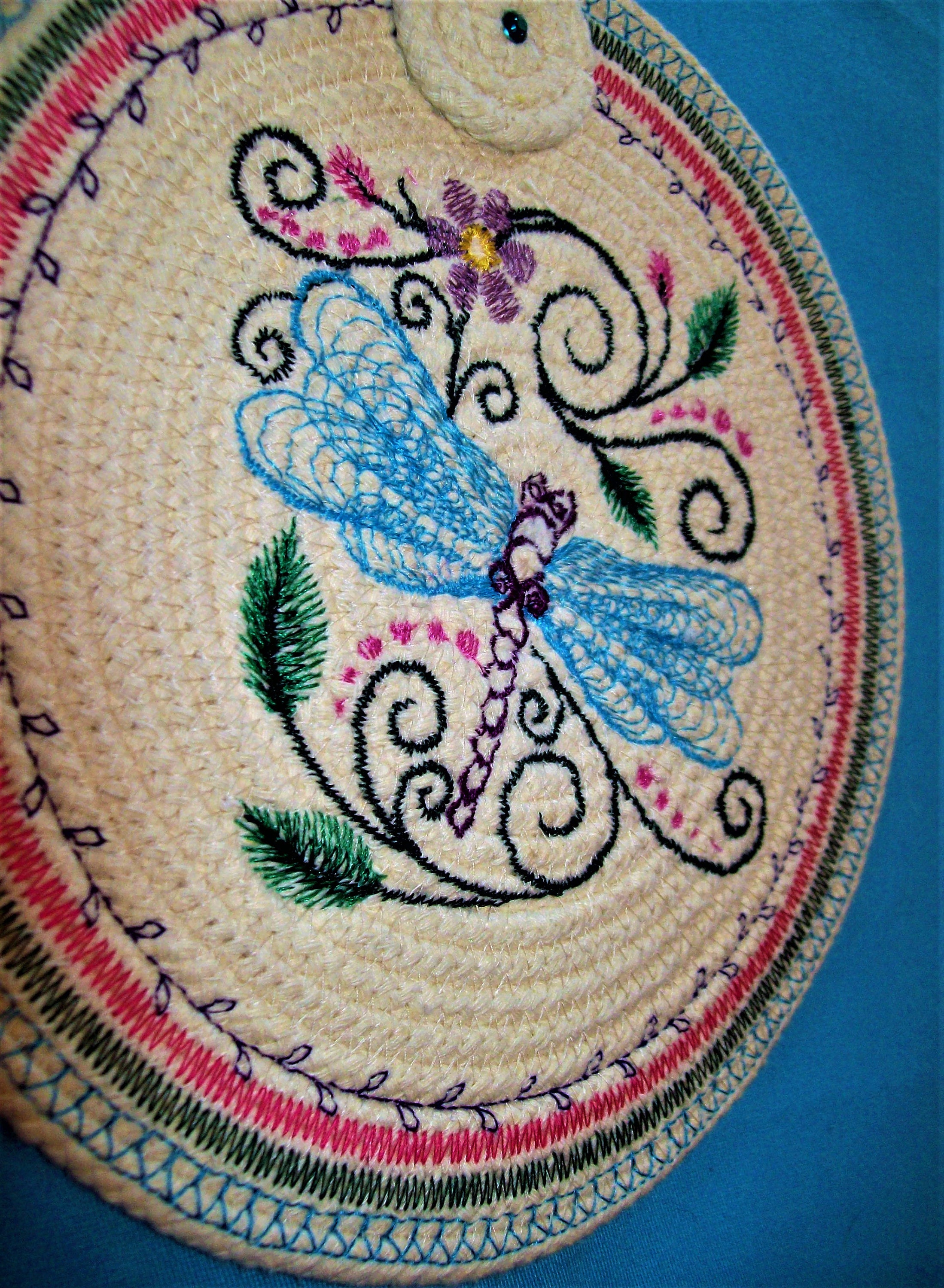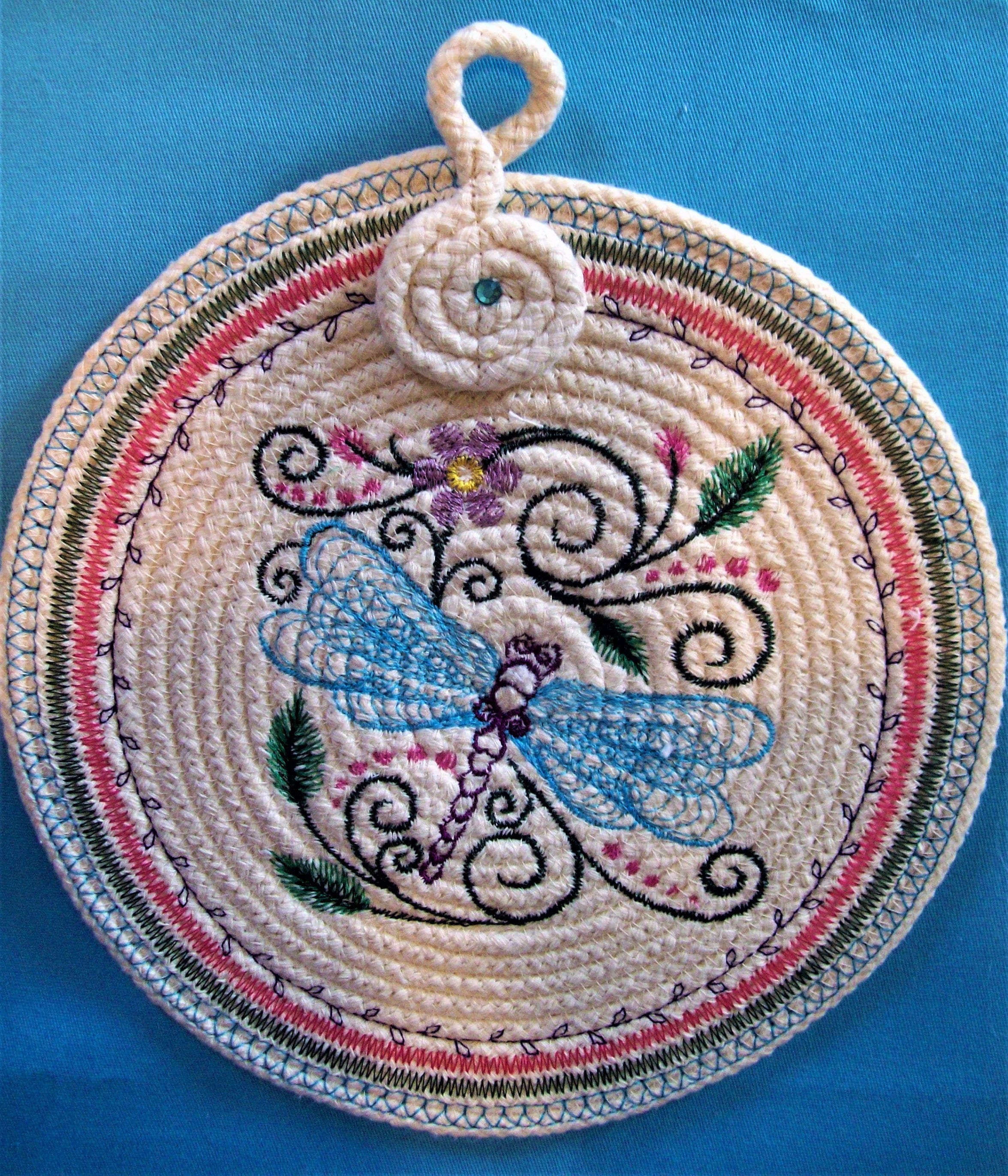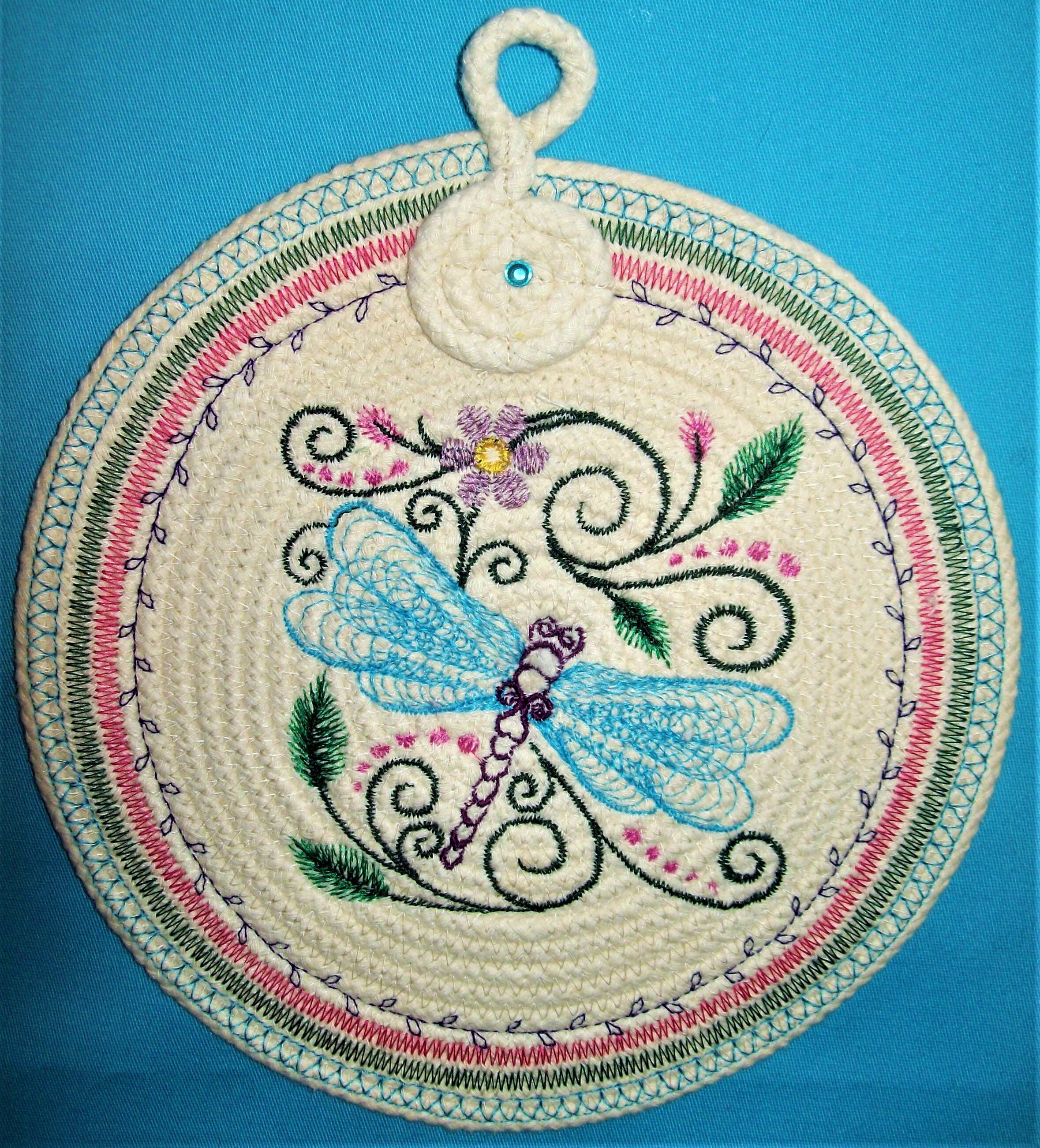 Embroidered Dragonfly Cotton Coiled Rope Trivet: Handmade Floral Table Mat