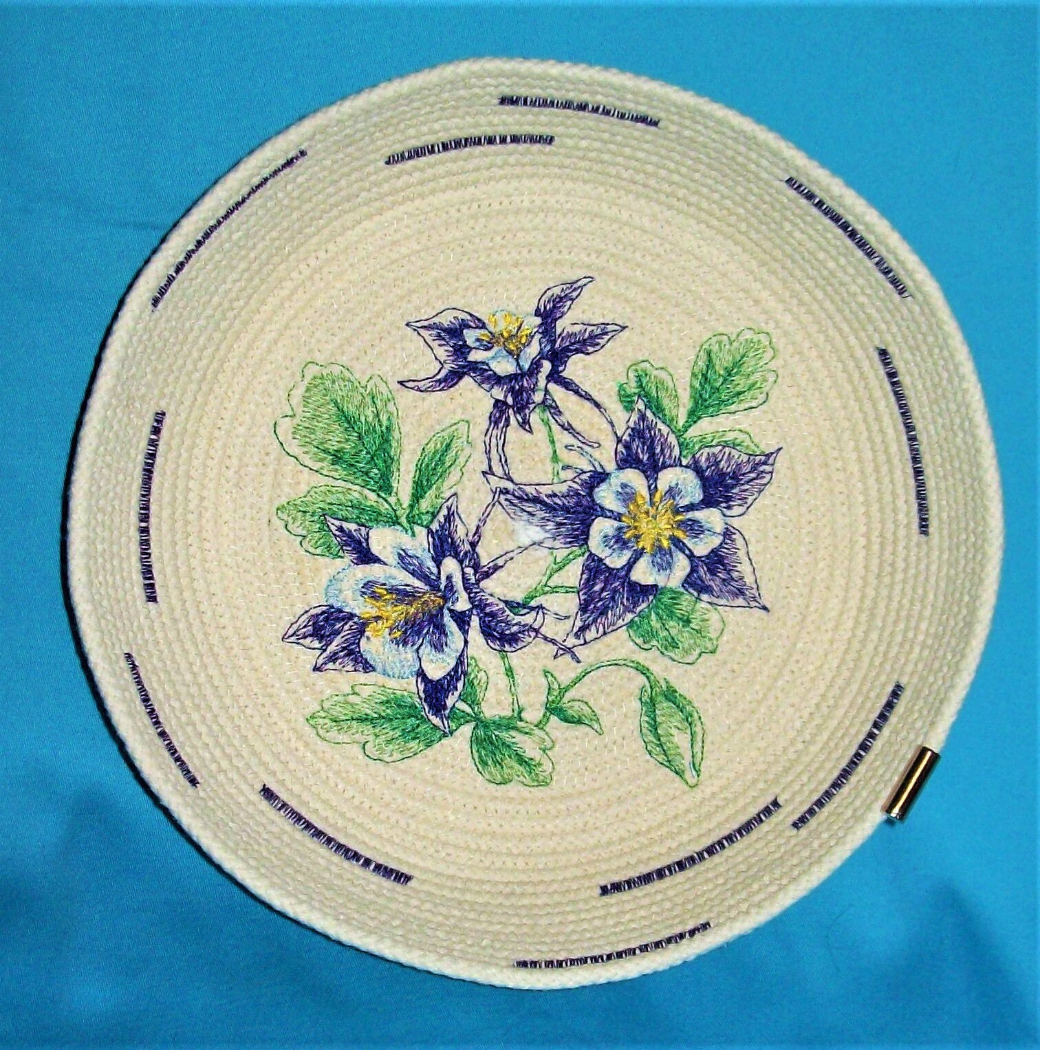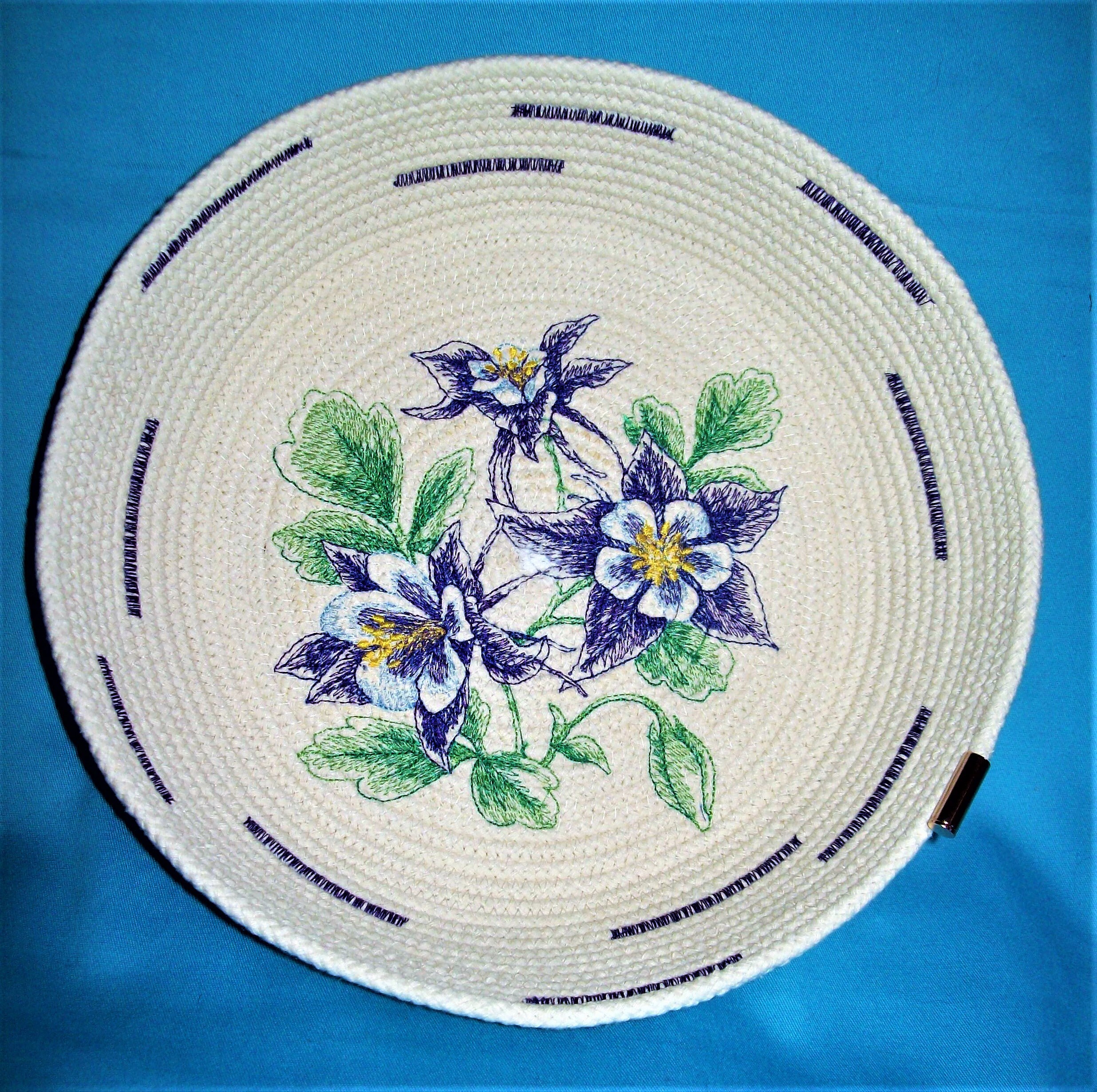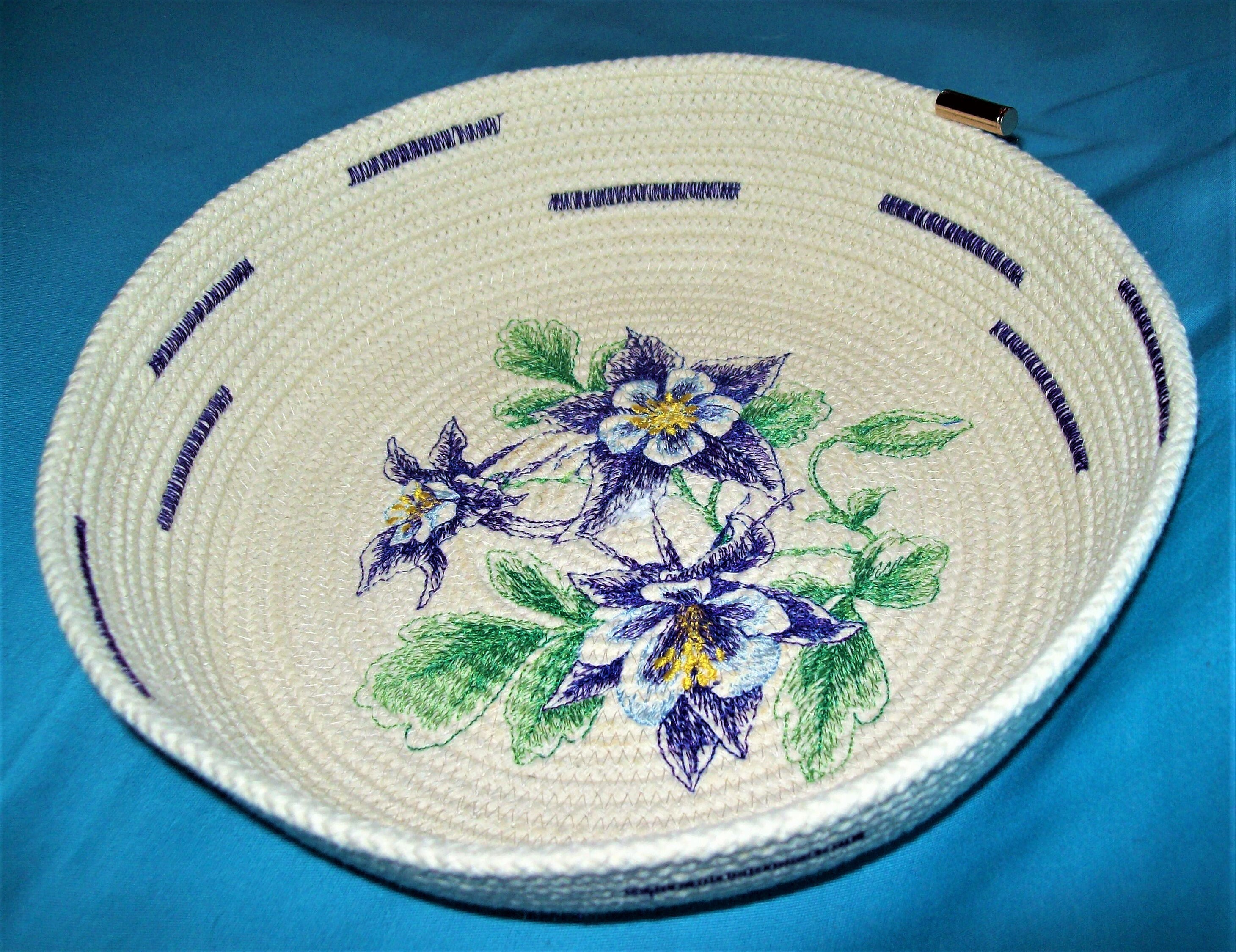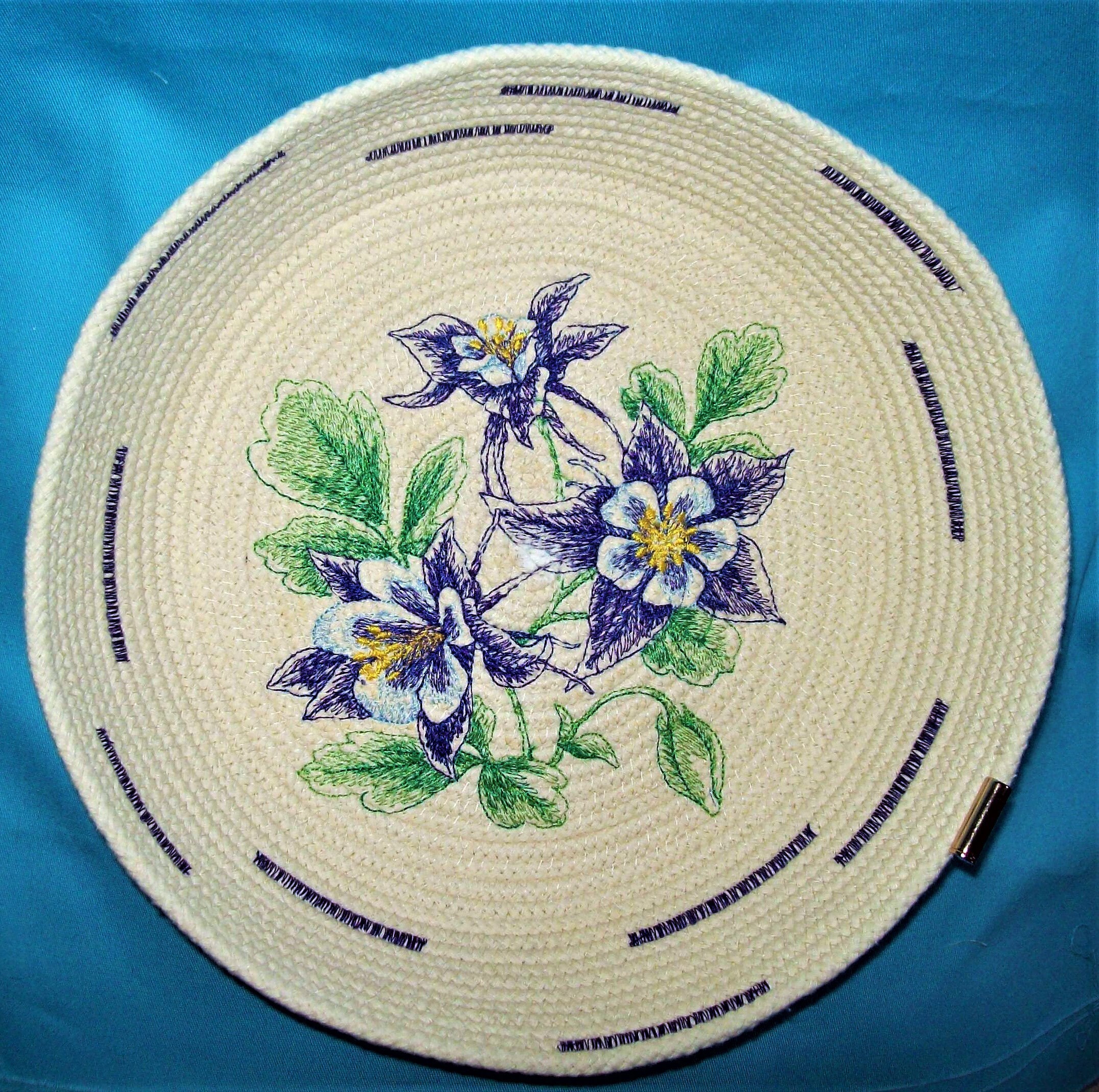 A beautiful embroidered design is stitched directly onto the coiled rope base.