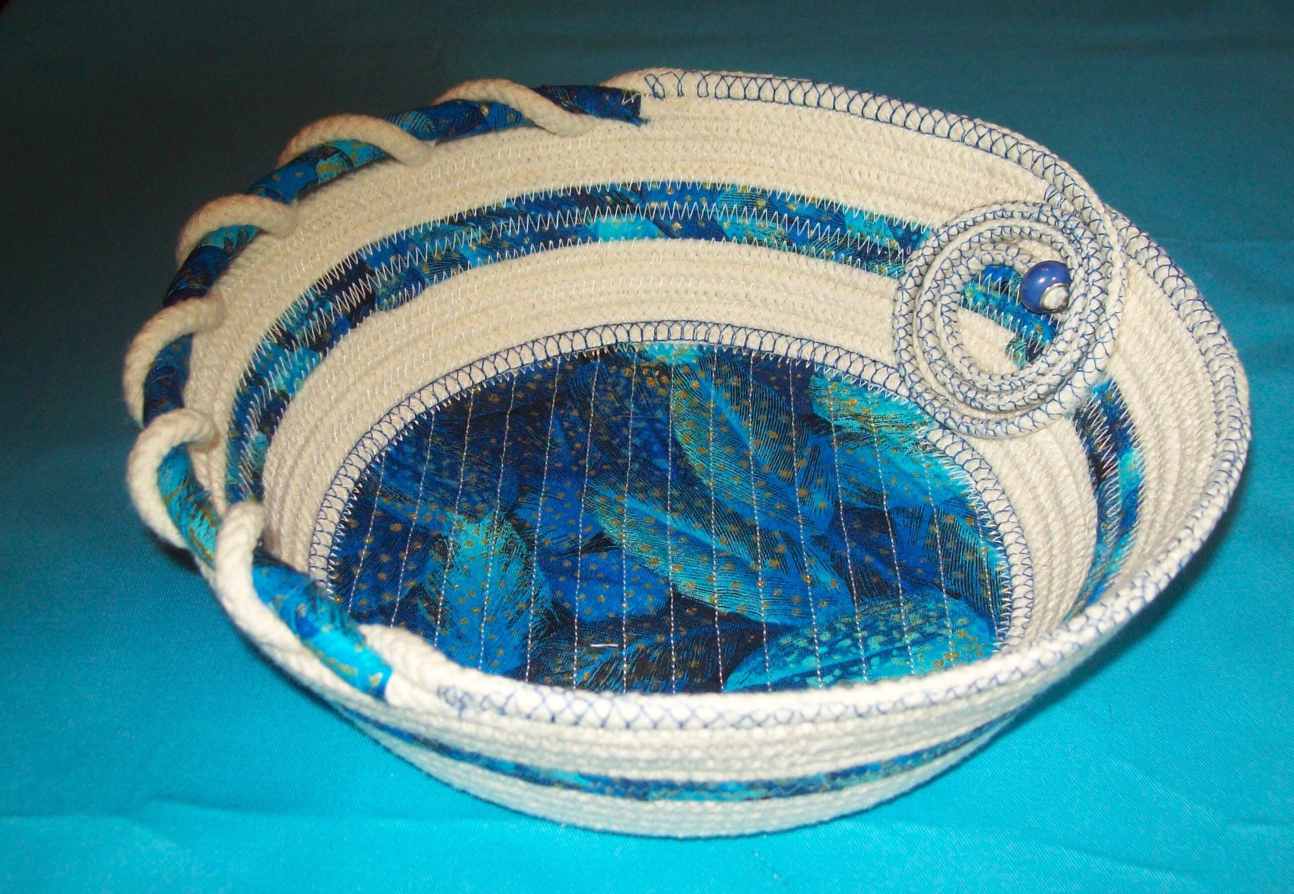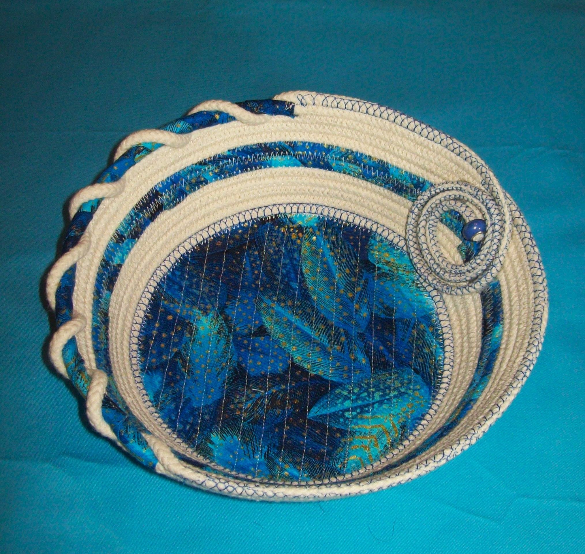 I love how this bowl turned out! I wanted to show both how one rope entwined with the other and by using the decorative thread stitching to add an additional accent.