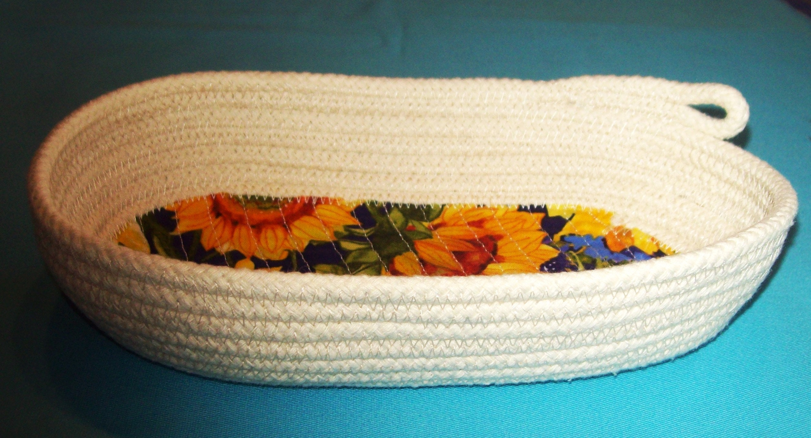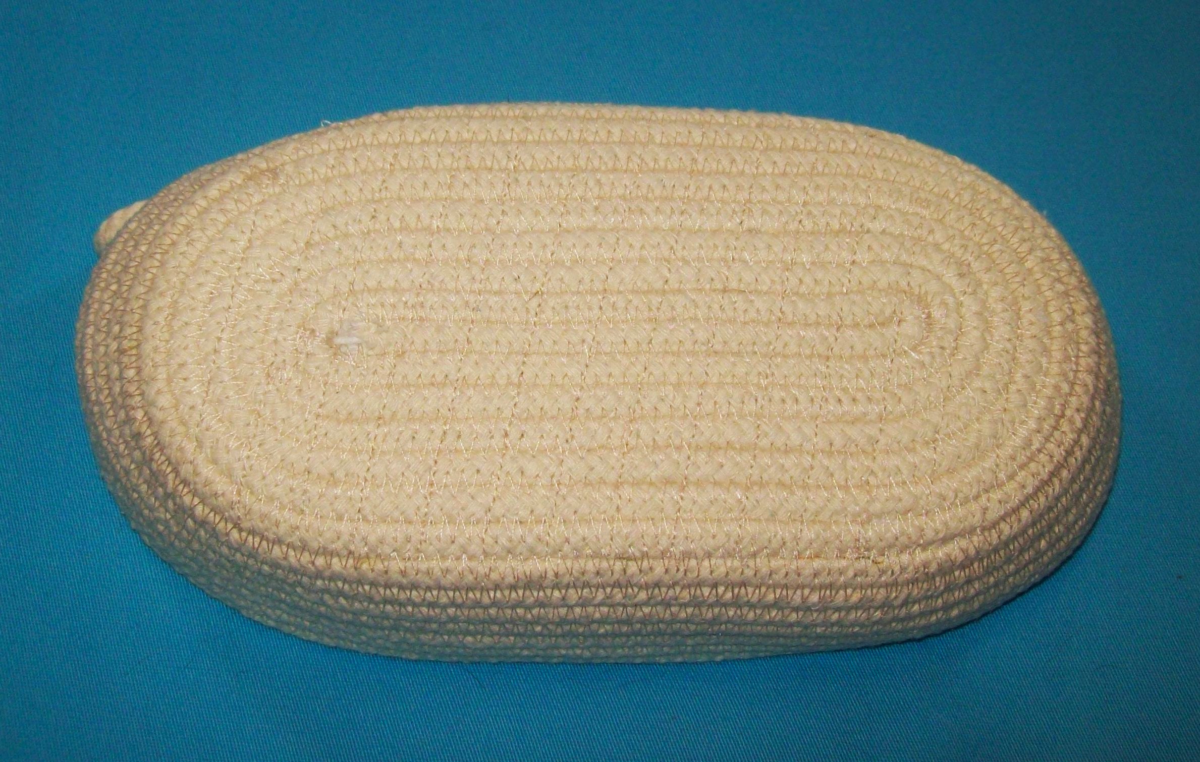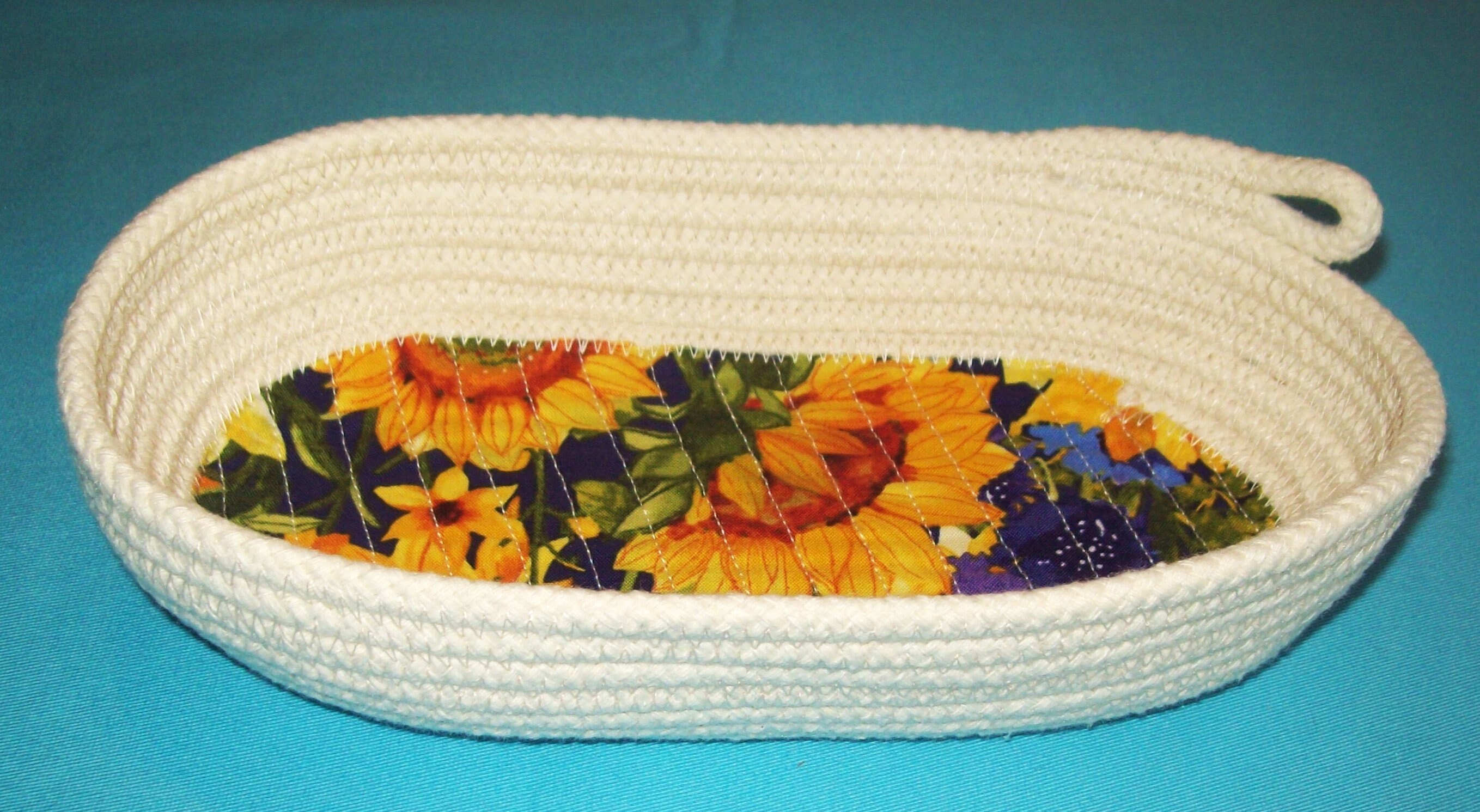 This oval cotton rope bowl has a base that I have machine quilted as to prevent it from curling or lifting off the bottom. The rope is American Made and has just the right amount of stiffness to make it sturdy.