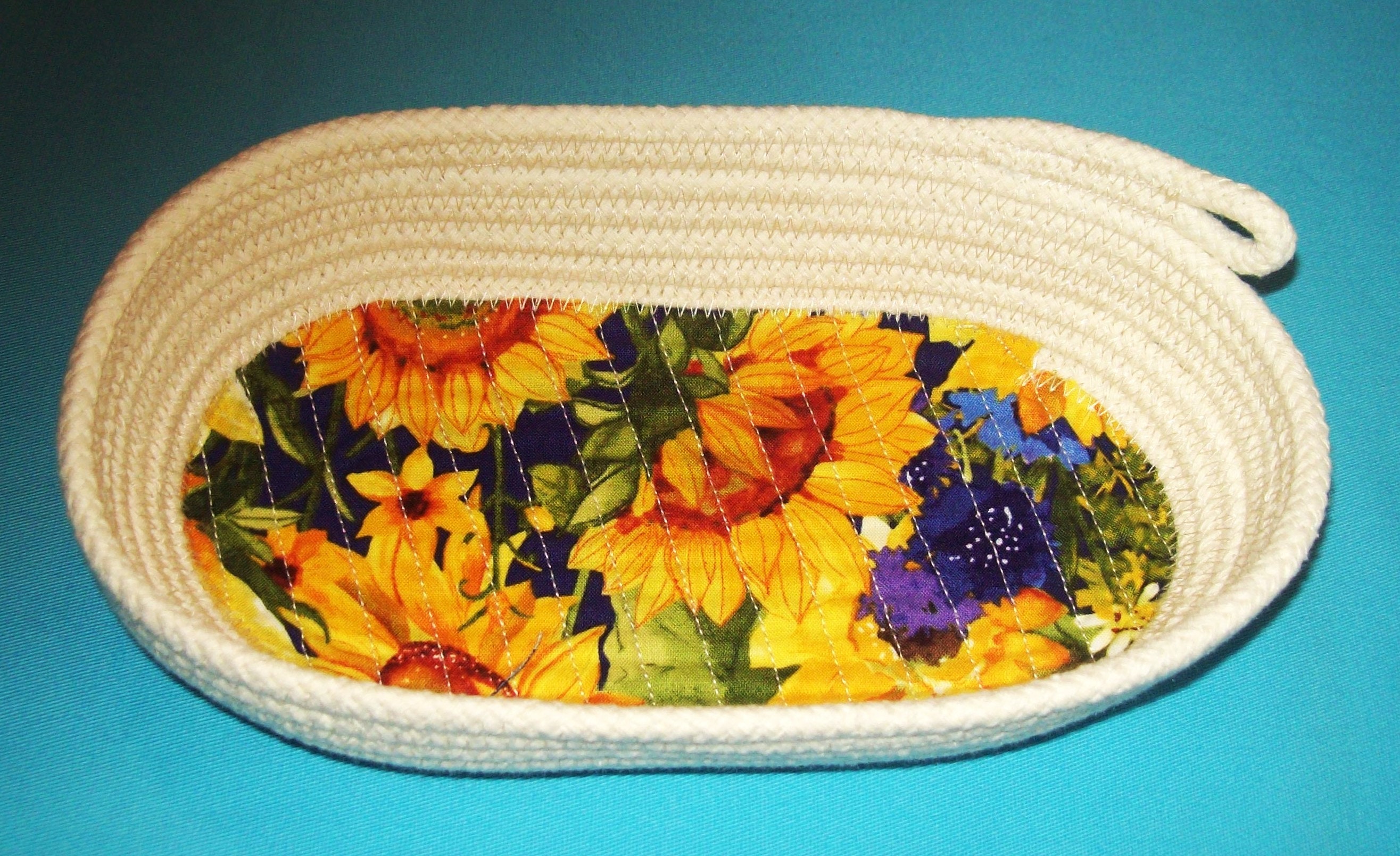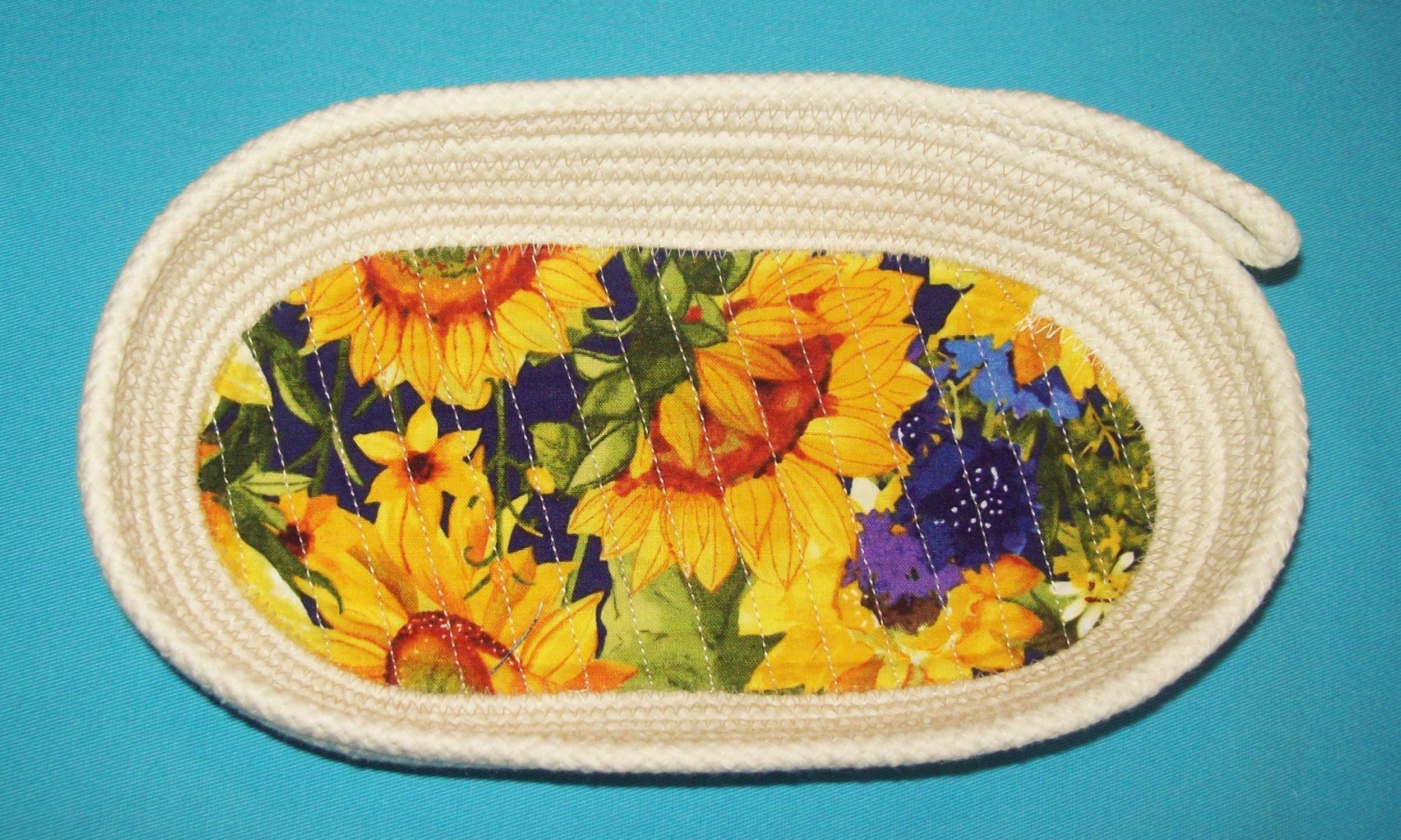 Sunflowers Rope Bowl-Oval Basket-Coiled clothesline bowl-summer sunflower soft bowl-gift rope bowl-catch all-key keeper
