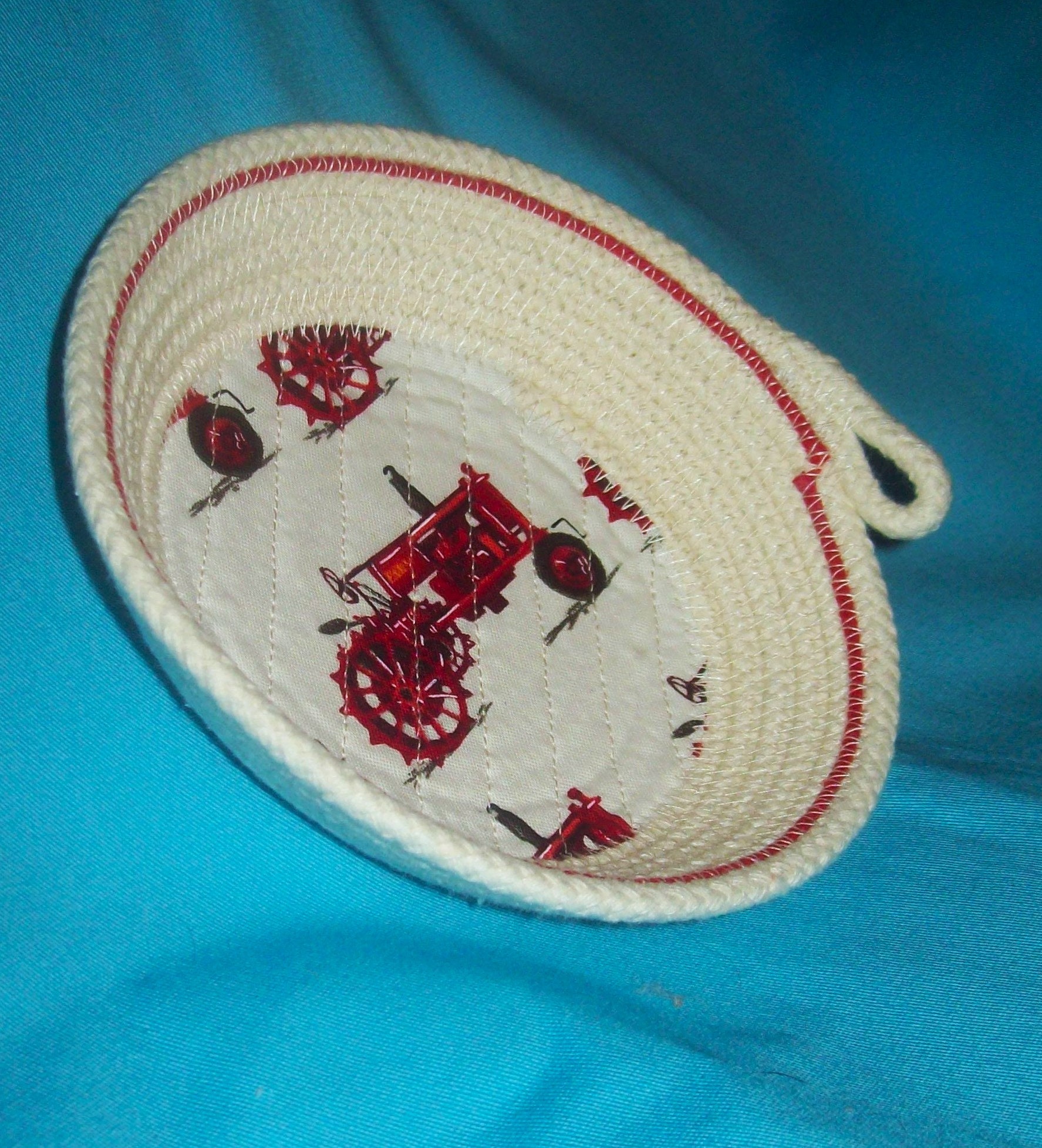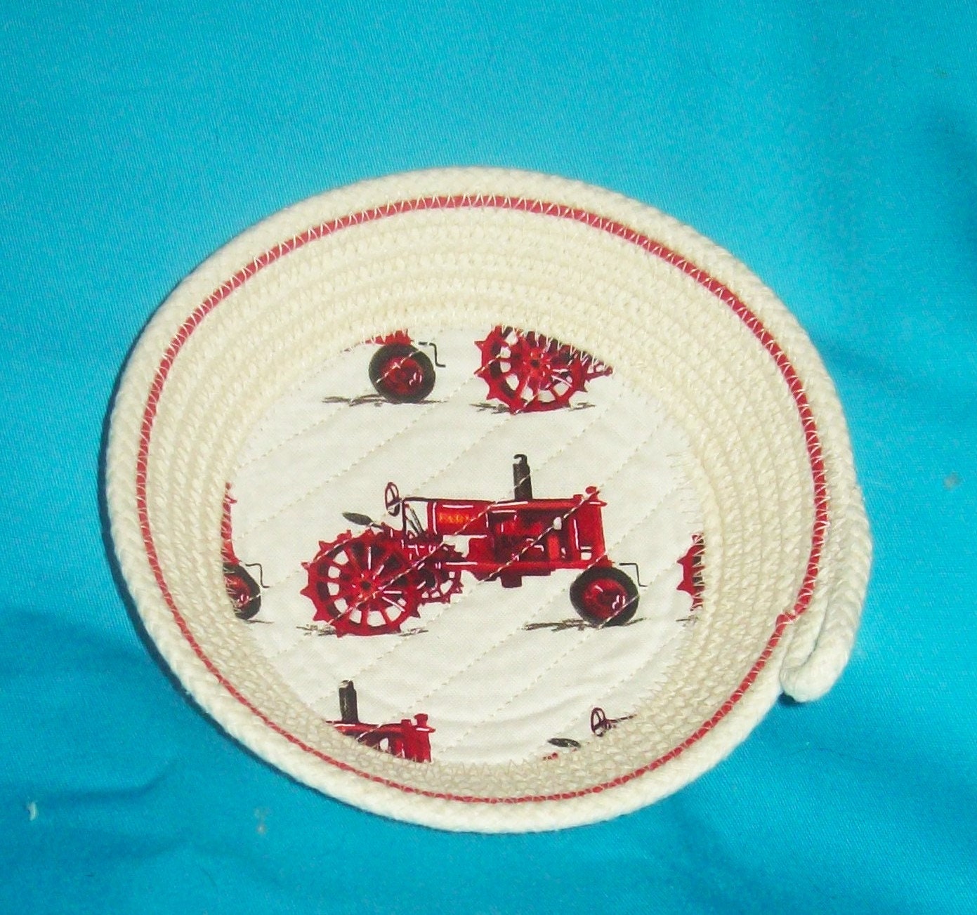 Made by hand coiling this 100" cotton cord and then sewing it into the bowl shape. The fabric bottom is channel quilted directly onto the rope base so it will not wrinkle or lift off. A small circle of red bottom cord stitched towards the rim of this bowl adds as a bright accent.