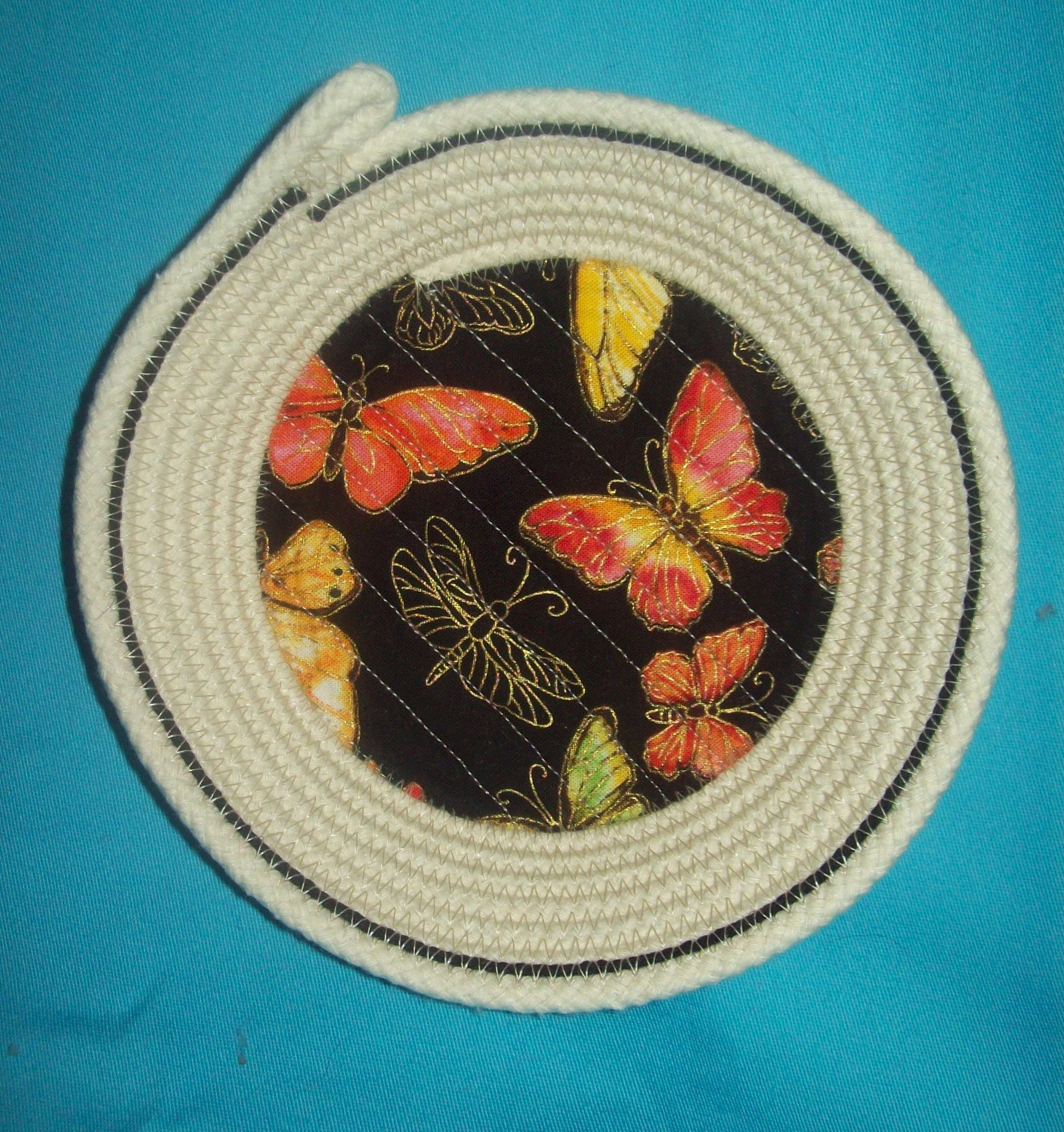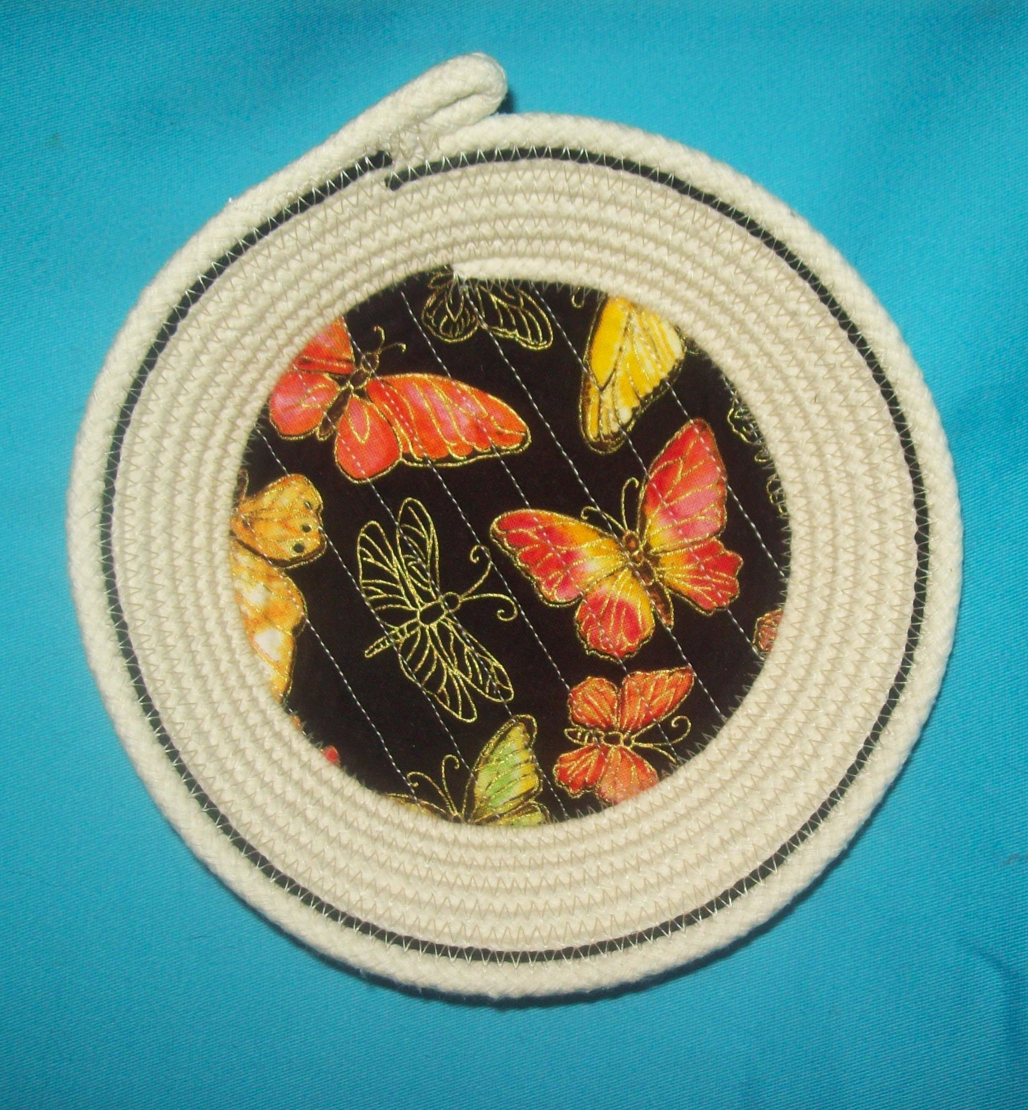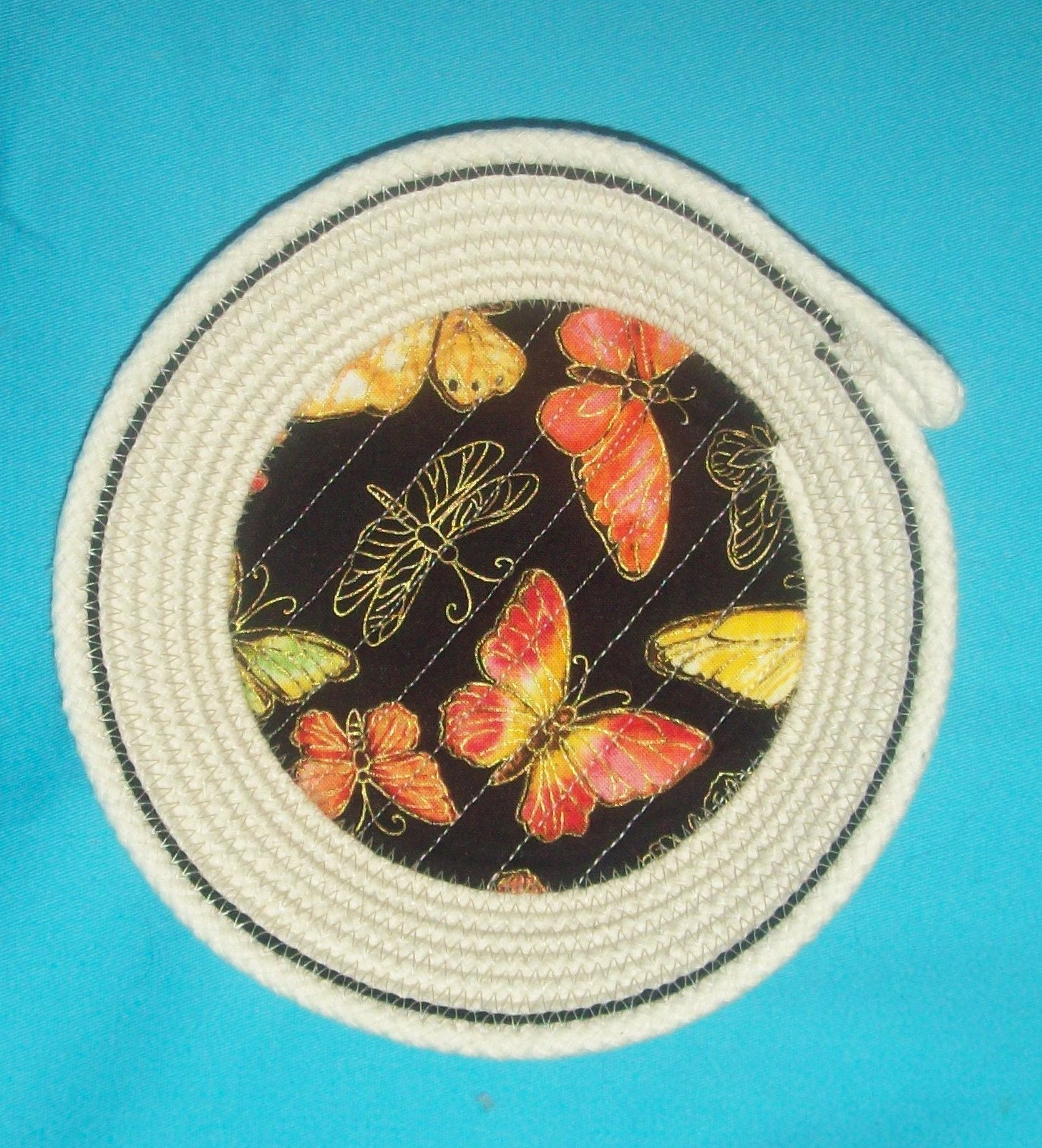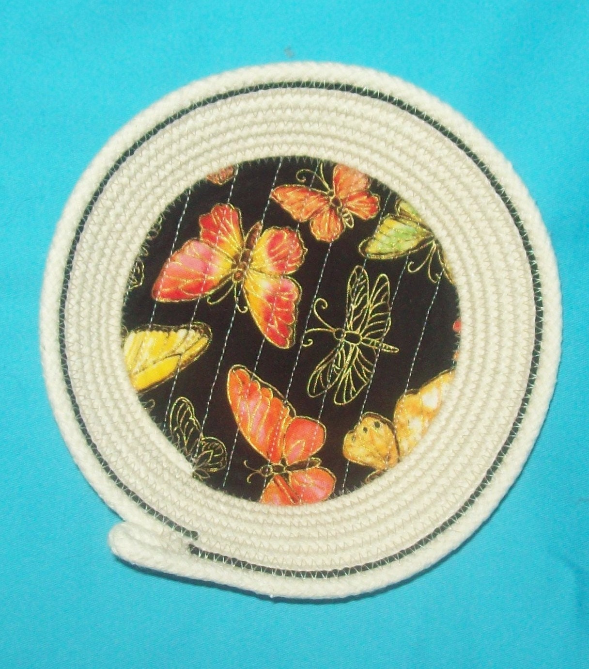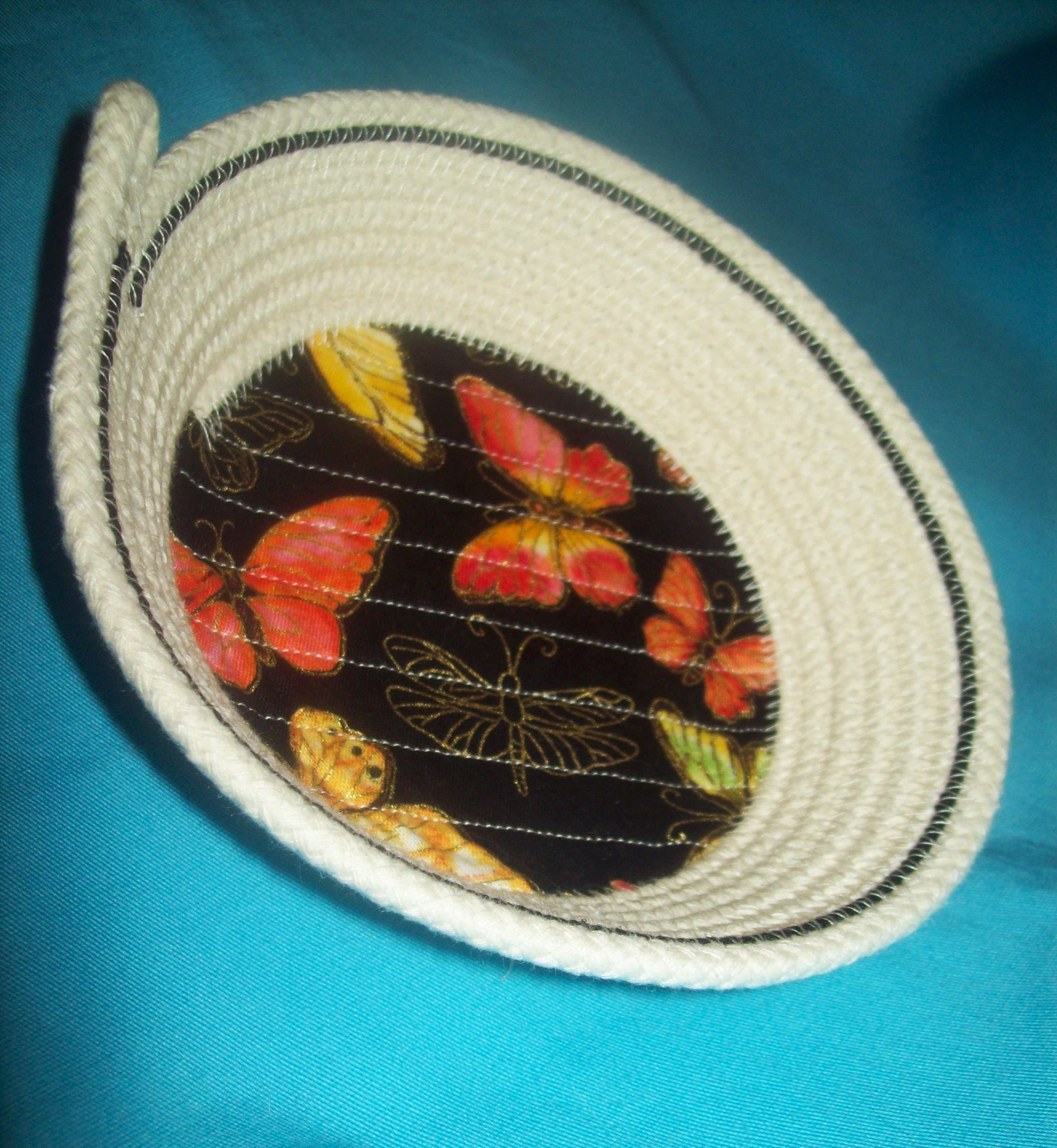 This small natural cord bowl makes a great gift for the butterfly collector. I have hand coiled the rope into the bowl shape and then sew it to keep its shape. The butterfly fabric is channel stitched directly onto the rope base to prevent any lifting or wrinkling. I have added a single row of black cotton cord near to the rim for accent.