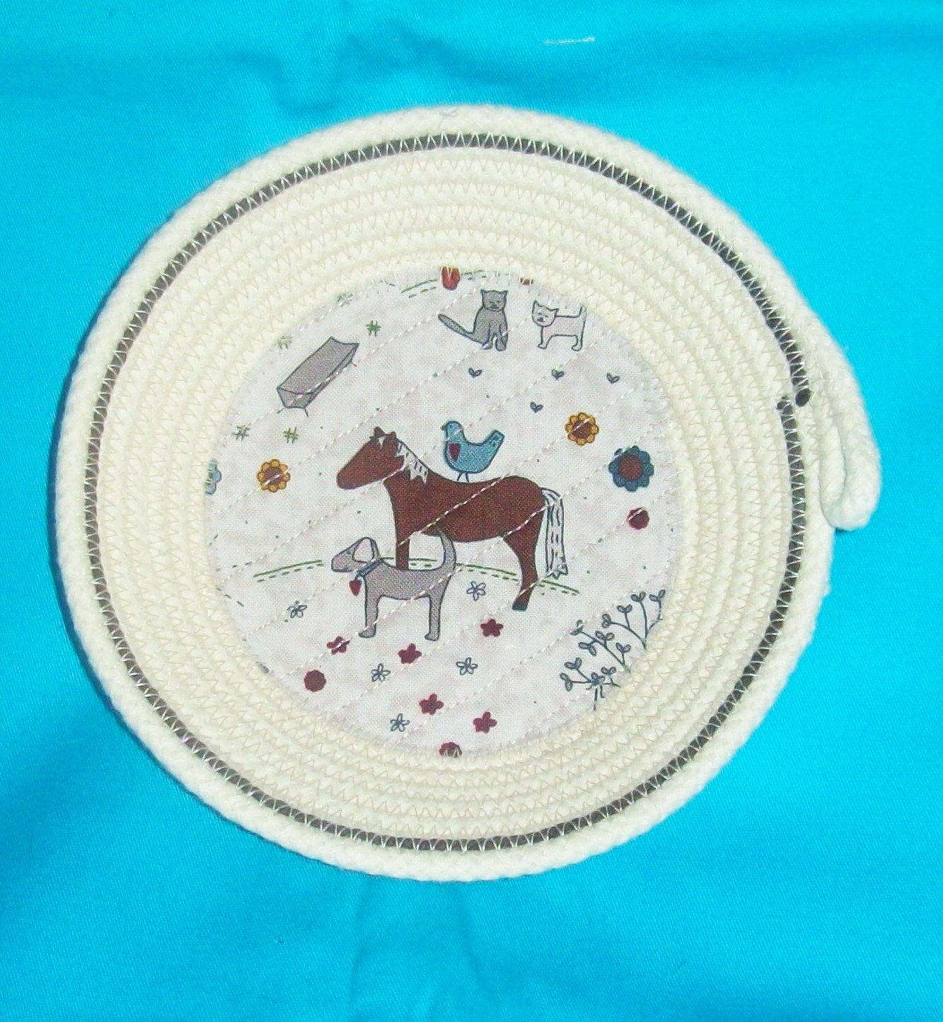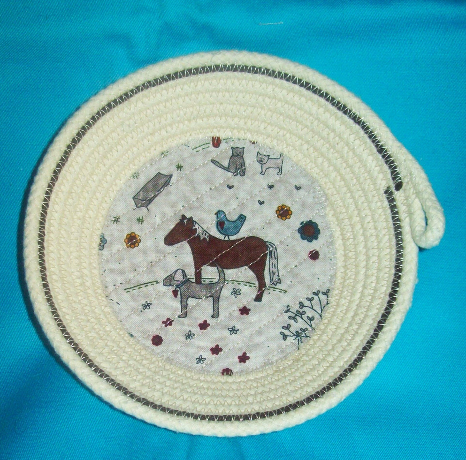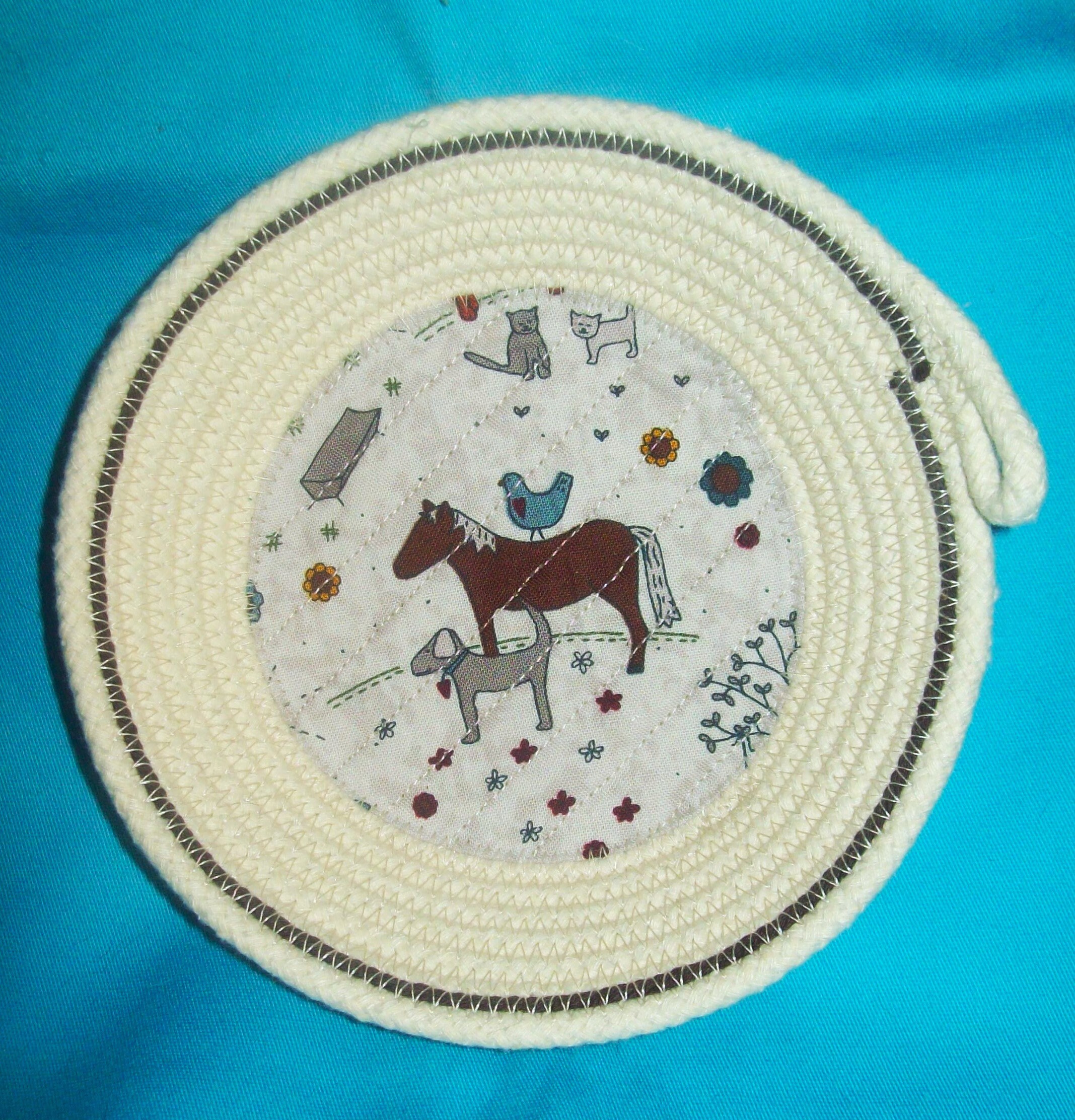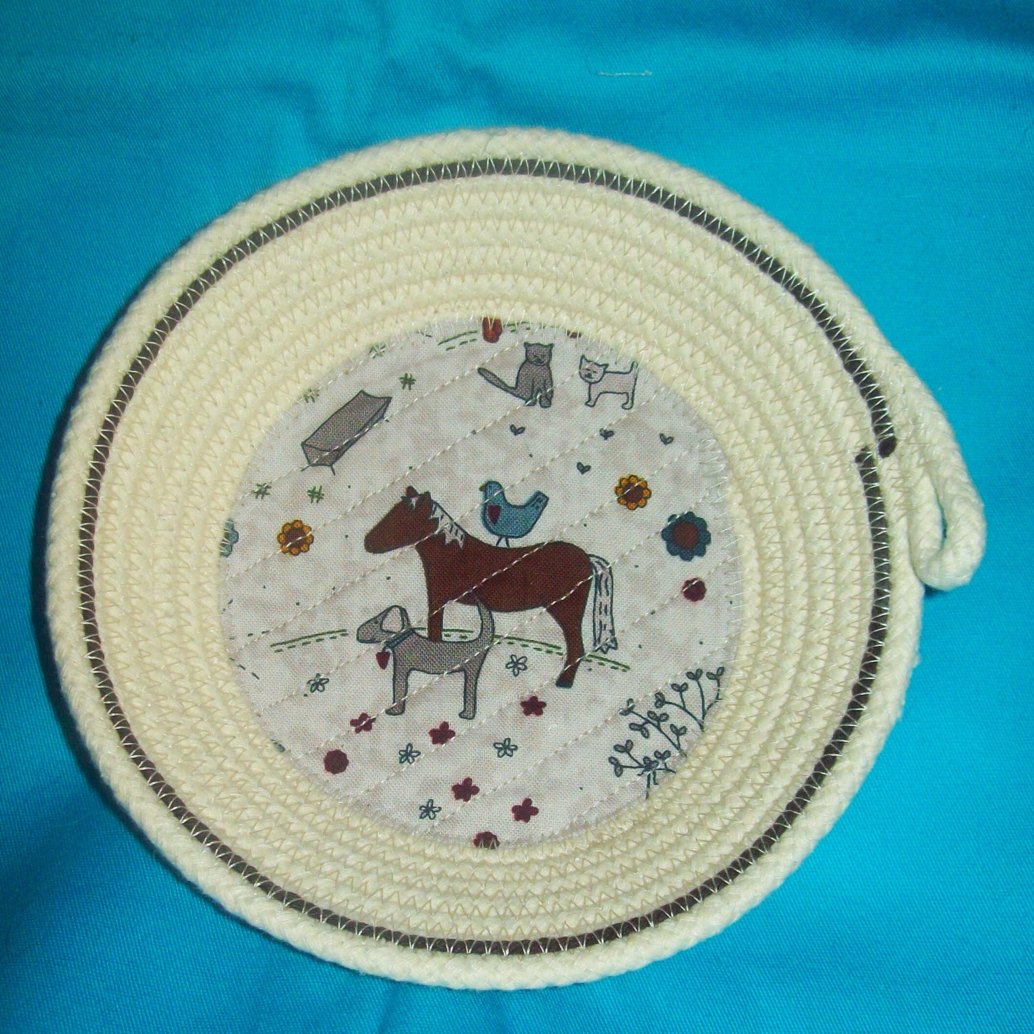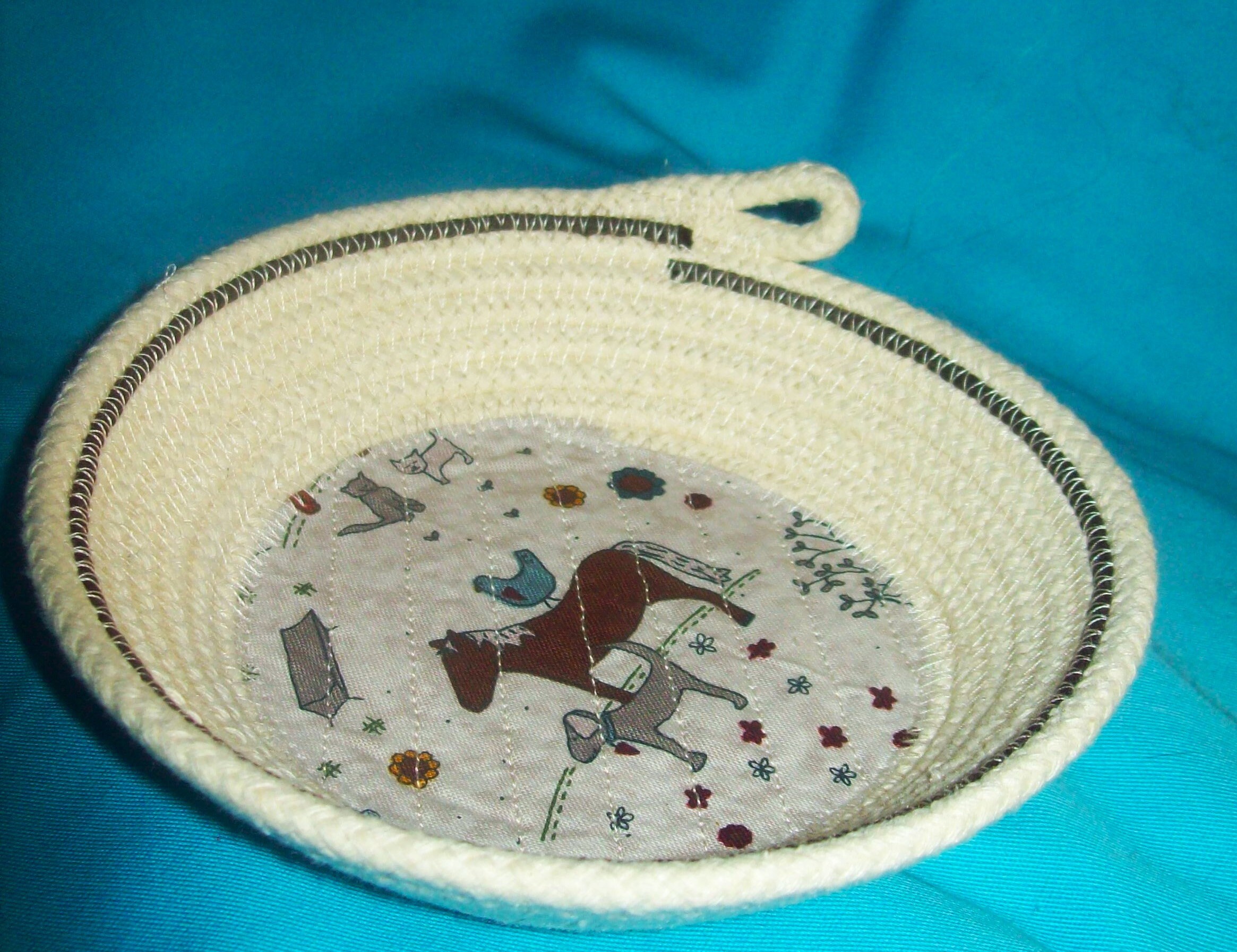 This small bowl is handmade by using a small diameter, USA made rope. The fabric bottom, with the cute childlike designs of the horse, dog, hen, and cats, is channel quilted to the rope base. This is my way of keeping the fabric stable and from lifting.