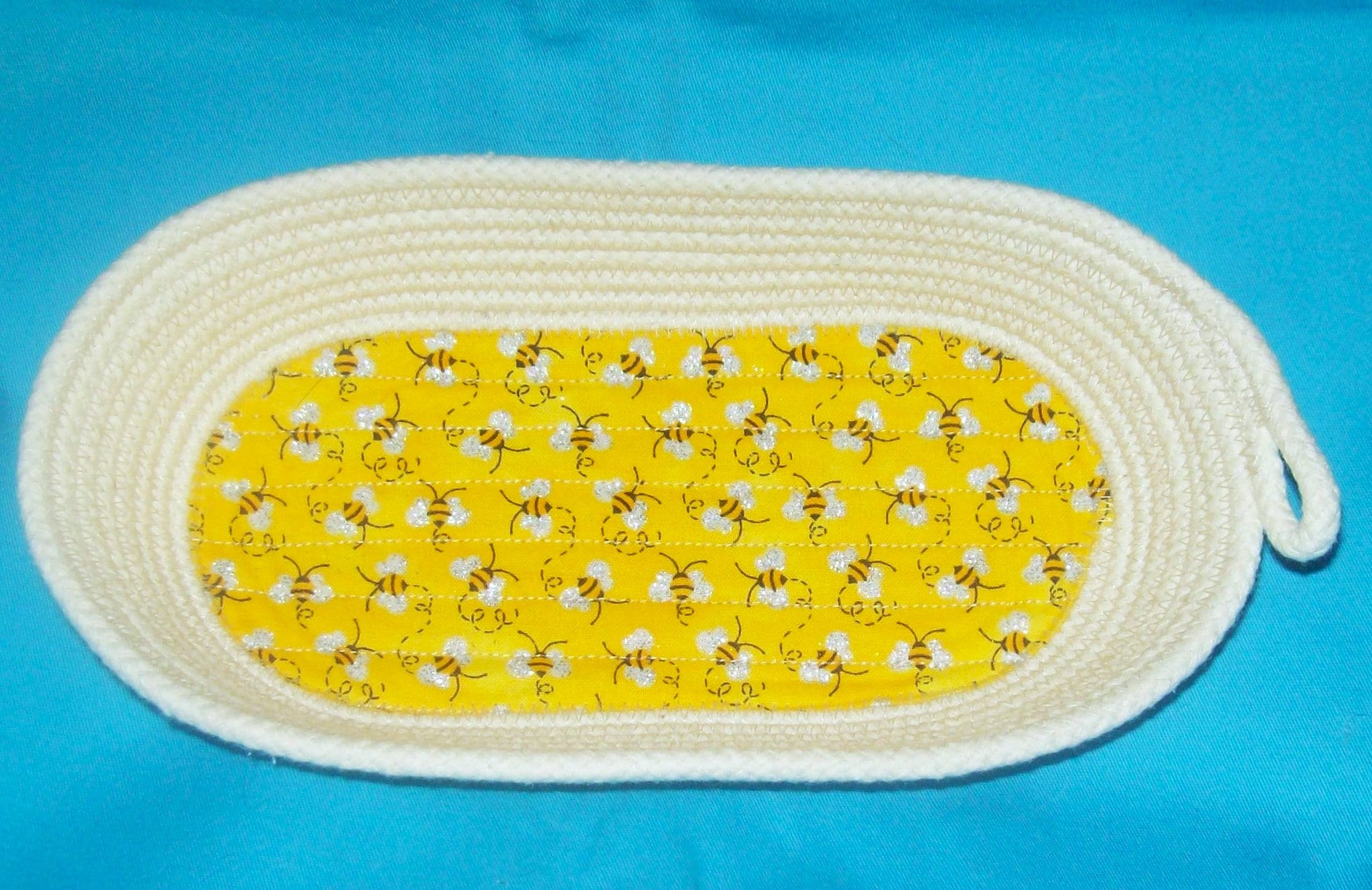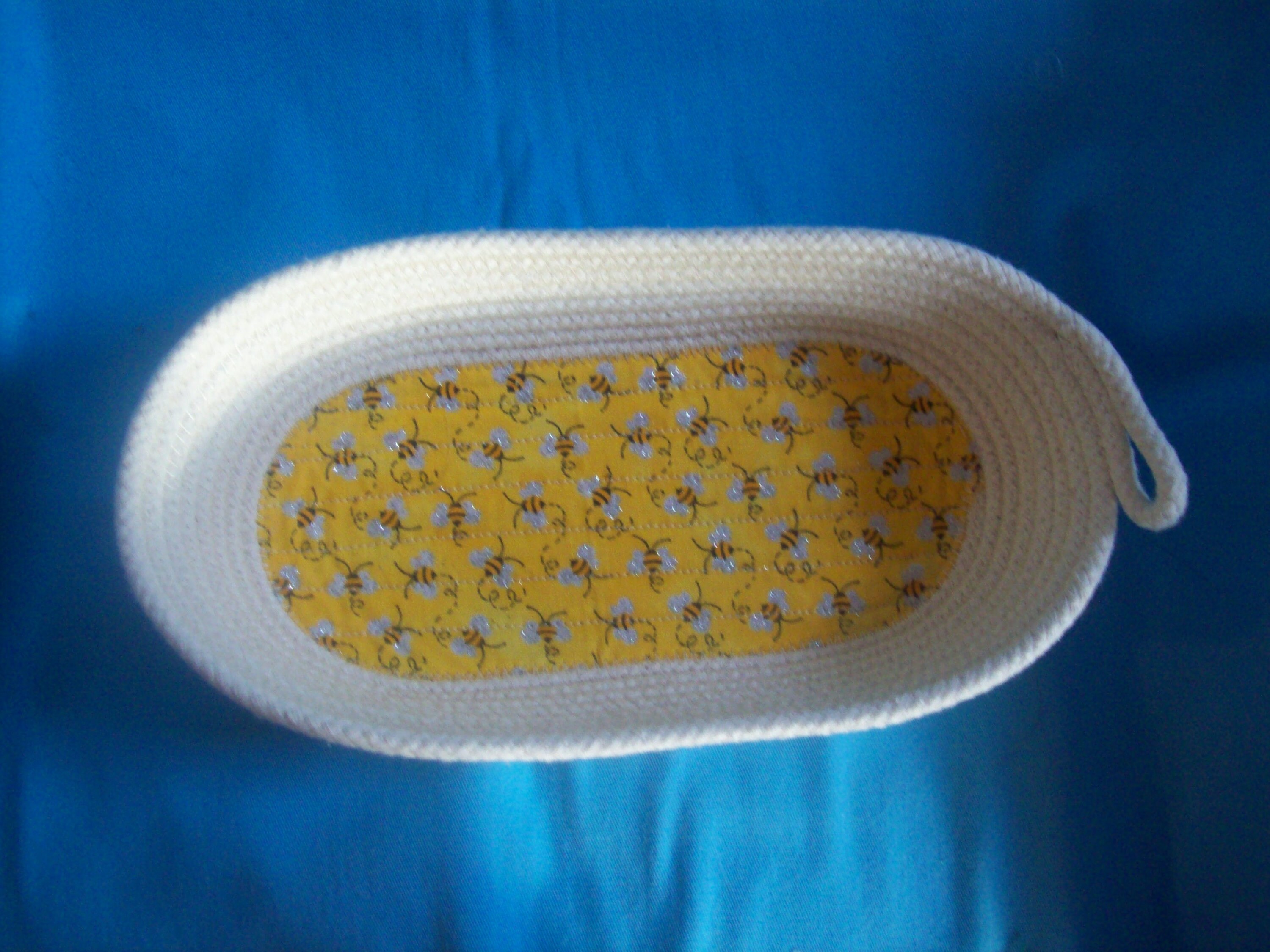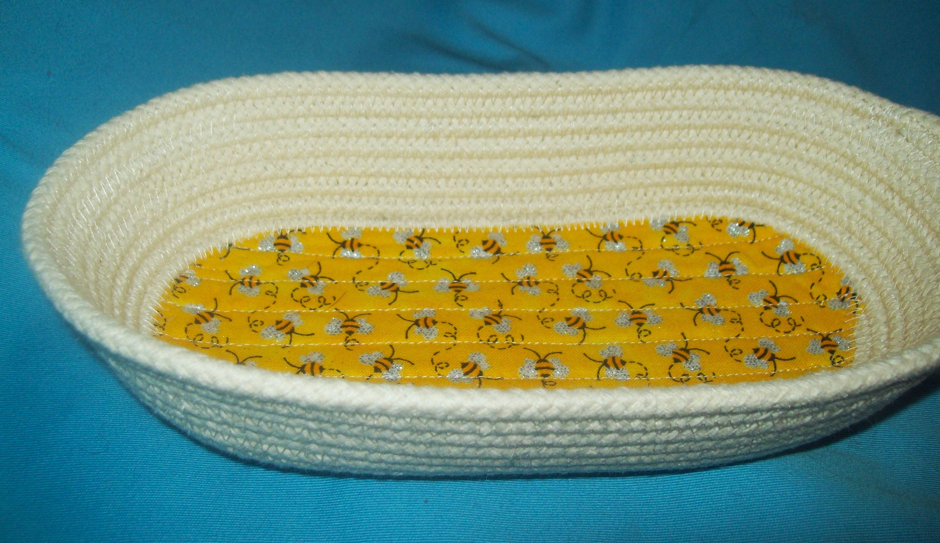 This medium sized bowl is great to store your eye glasses and keys in. Put it anywhere in your house. The happy yellow fabric will bring brightness to where ever it is placed.