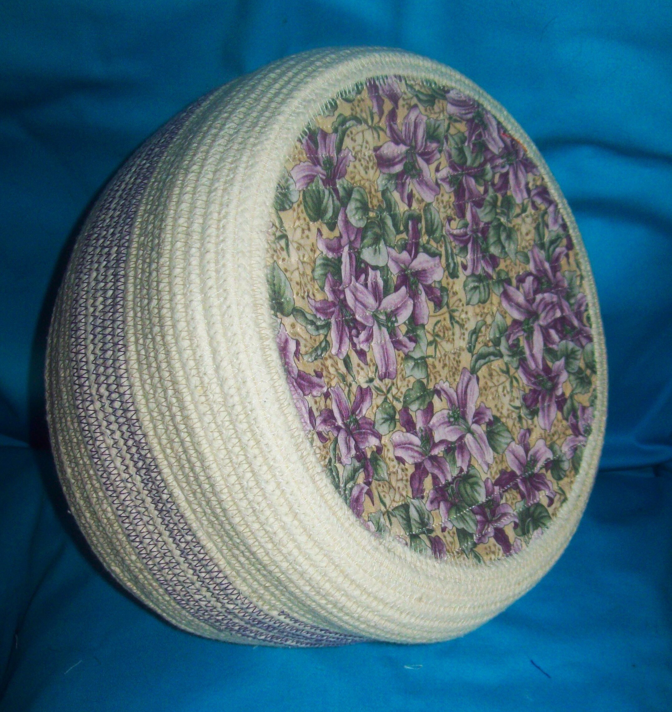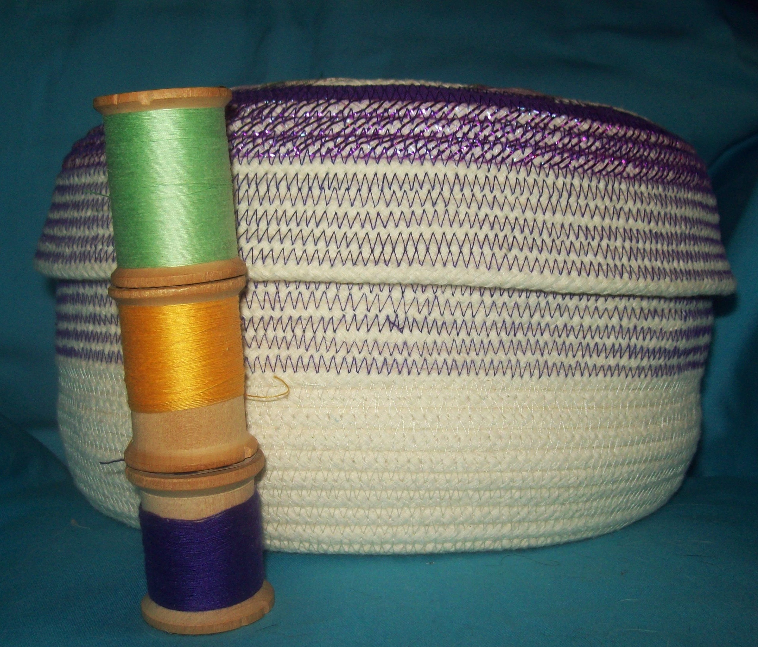 This is a "one of a kind" coiled rope sewing basket. If you look closely at it, you will see many techniques were used in its construction.