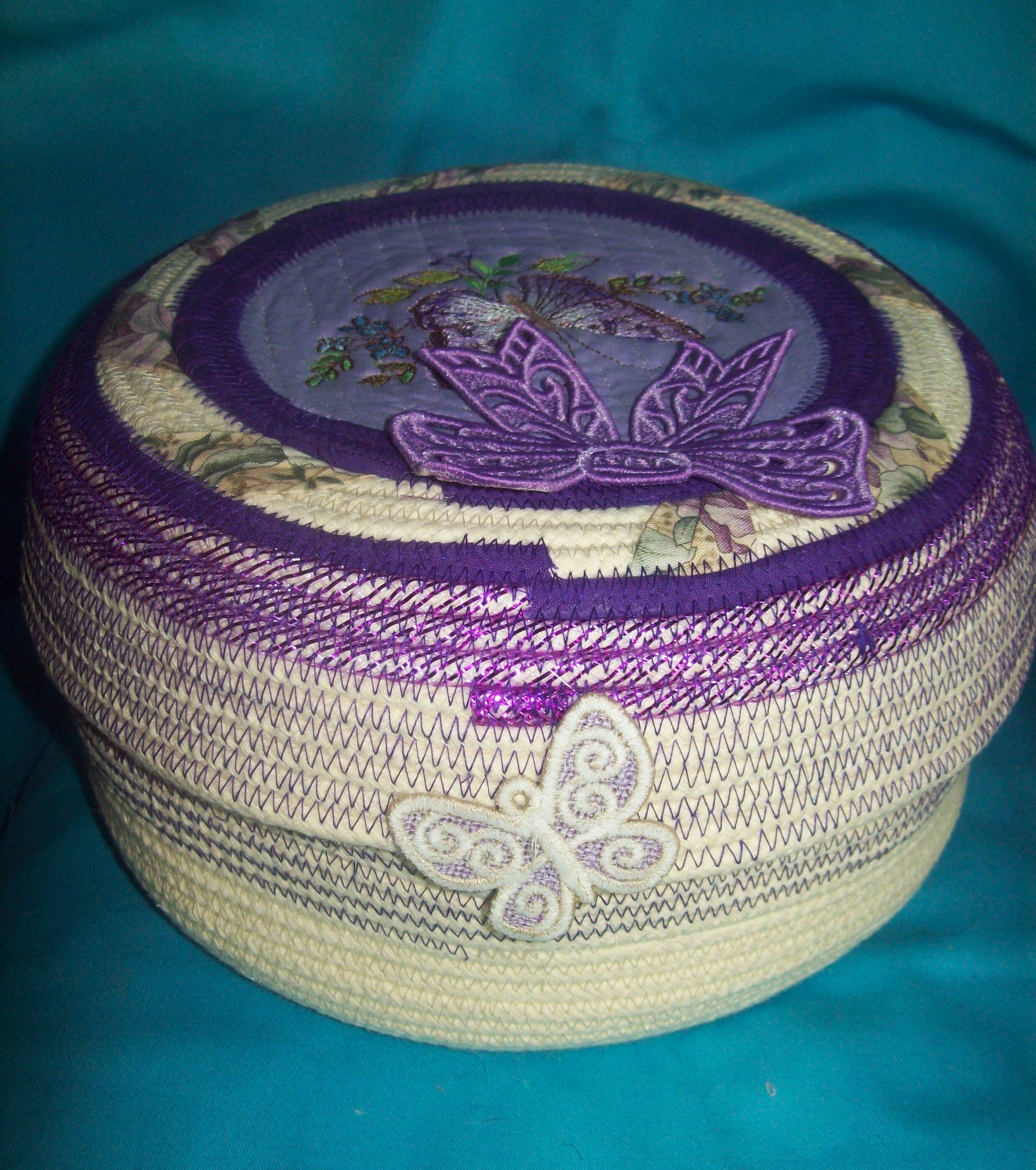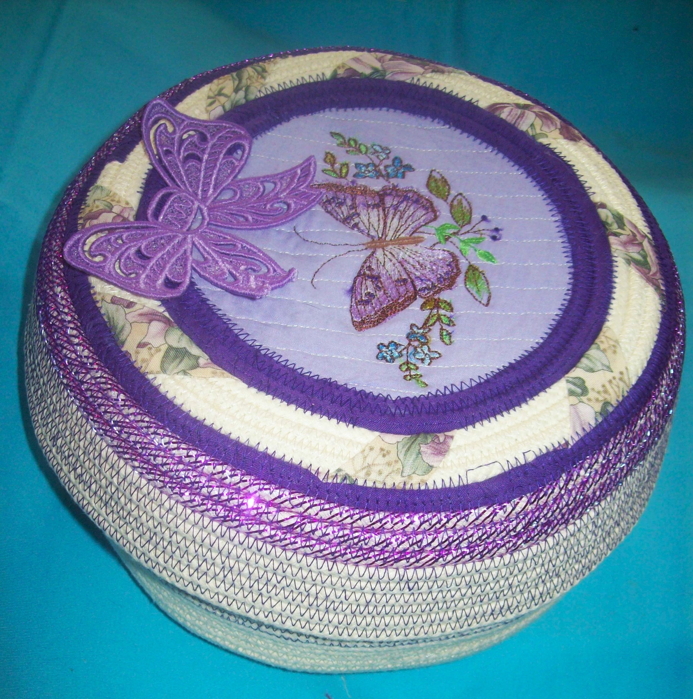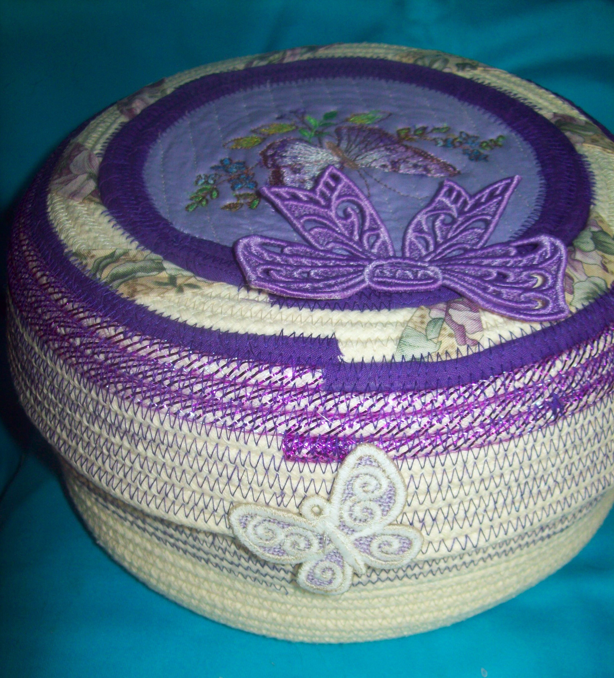 You will find 4 butterflies attached to this basket. The two larger ones are embroidered with the top butterfly stitched directly through the rope lid. The other inside one has been embroidered and then fancy cut and stiffened, You will find two other small butterflies. One is attached to the inside of the lid, plus the last one is perched to the outside rim of the lid. I have made all of them!