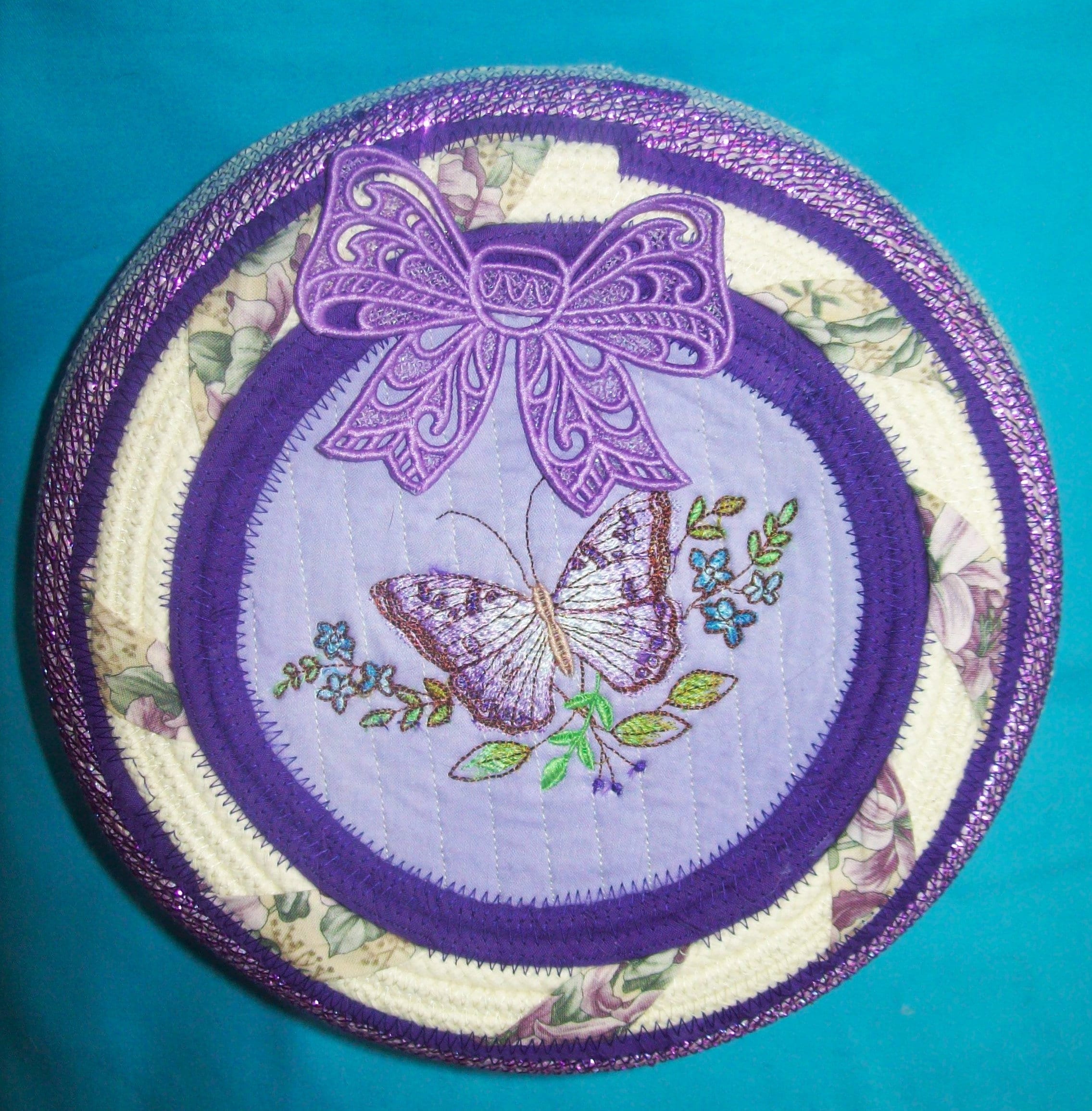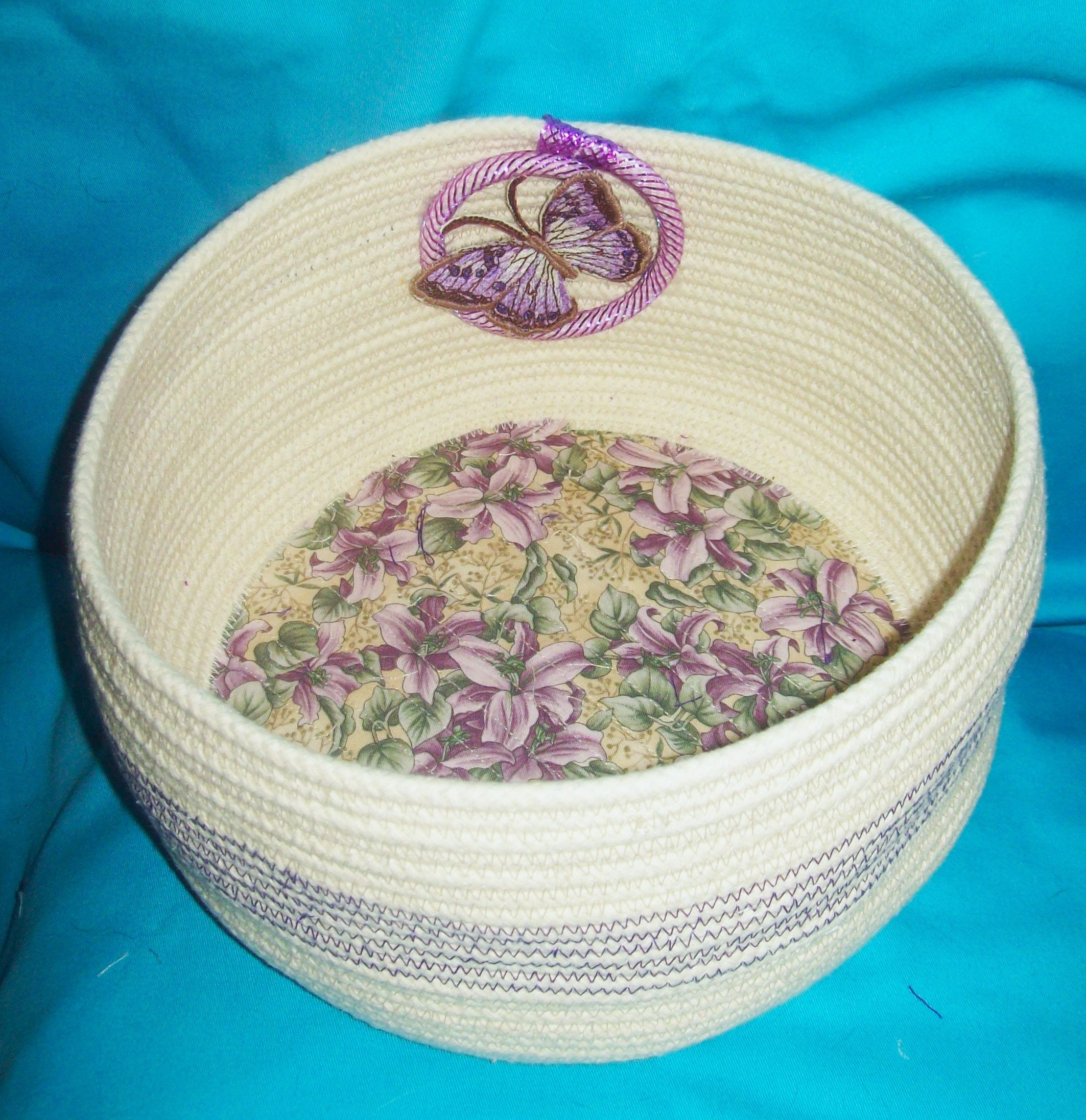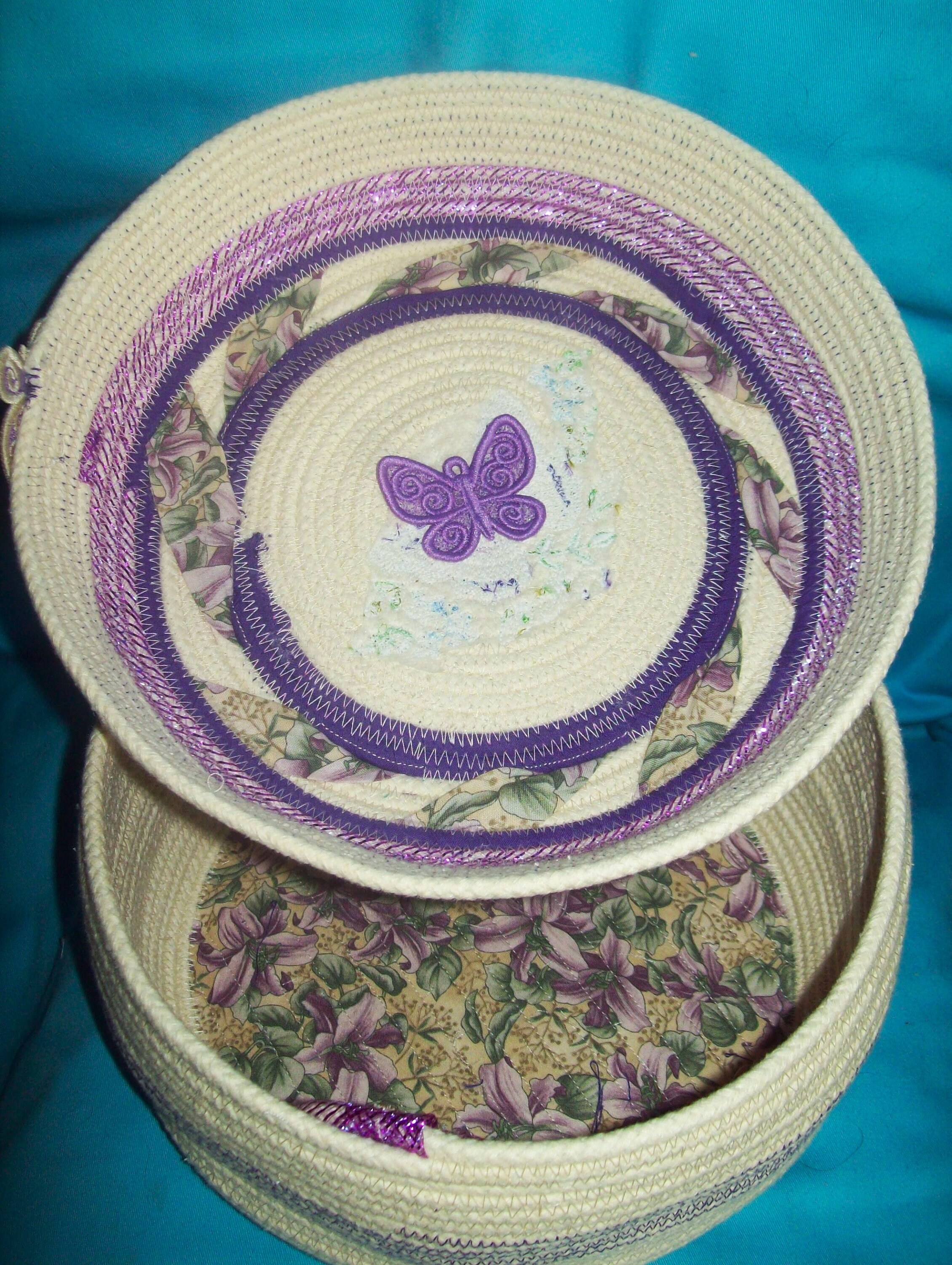 You will find 4 butterflies attached to this basket. The two larger ones are embroidered with the top butterfly stitched directly through the rope lid. The other inside one has been embroidered and then fancy cut and stiffened, You will find two other small butterflies. One is attached to the inside of the lid, plus the last one is perched to the outside rim of the lid. I have made all of them!
