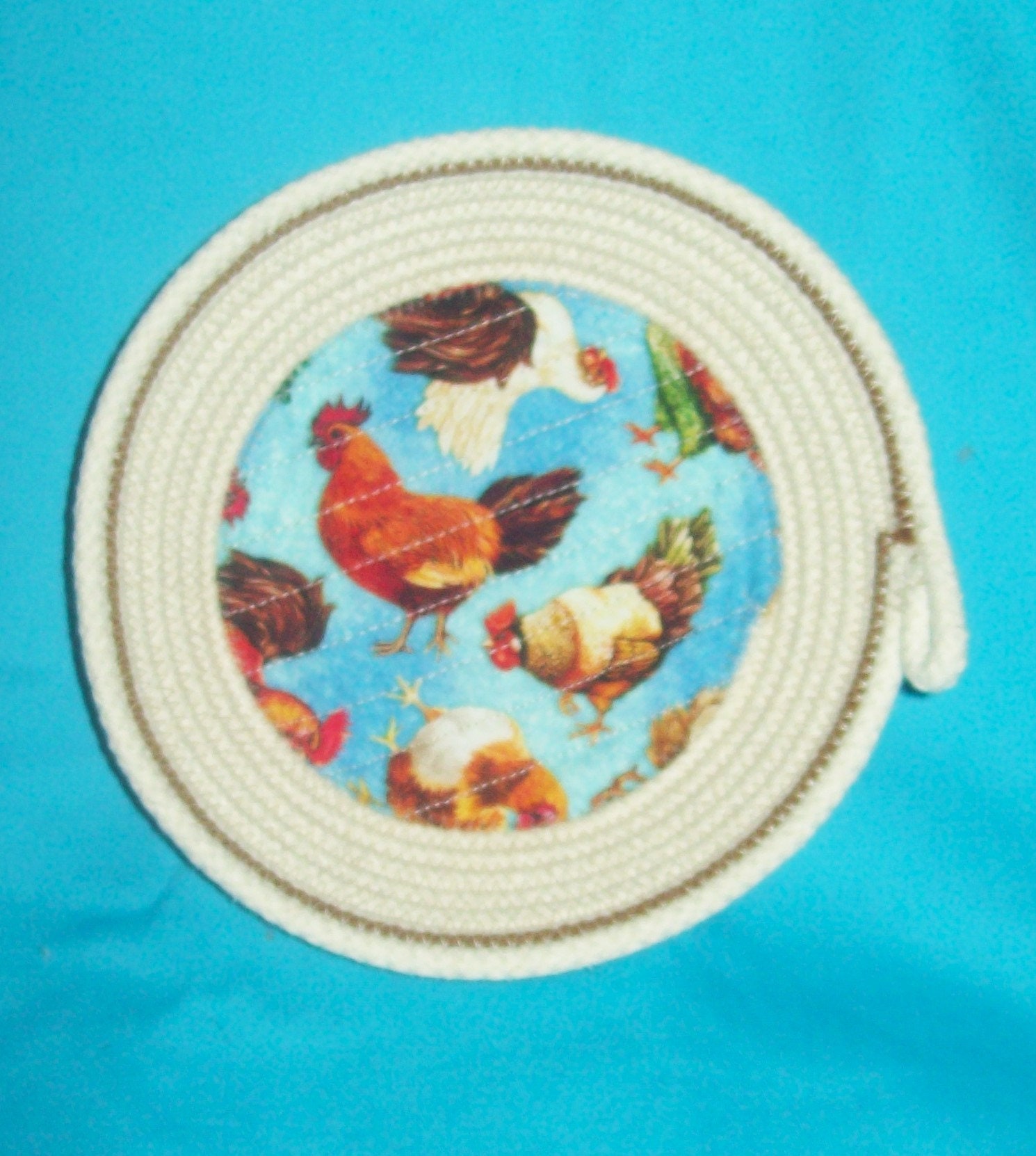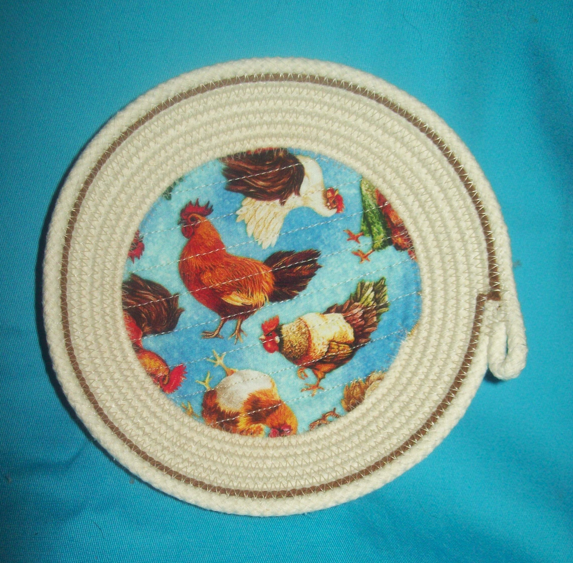 Country Cute Mini Bowl is made from USA cotton cording by sewing it together and then placing the rooster/hen fabric in the bottom by using a quilting stitch to firmly hold it down.