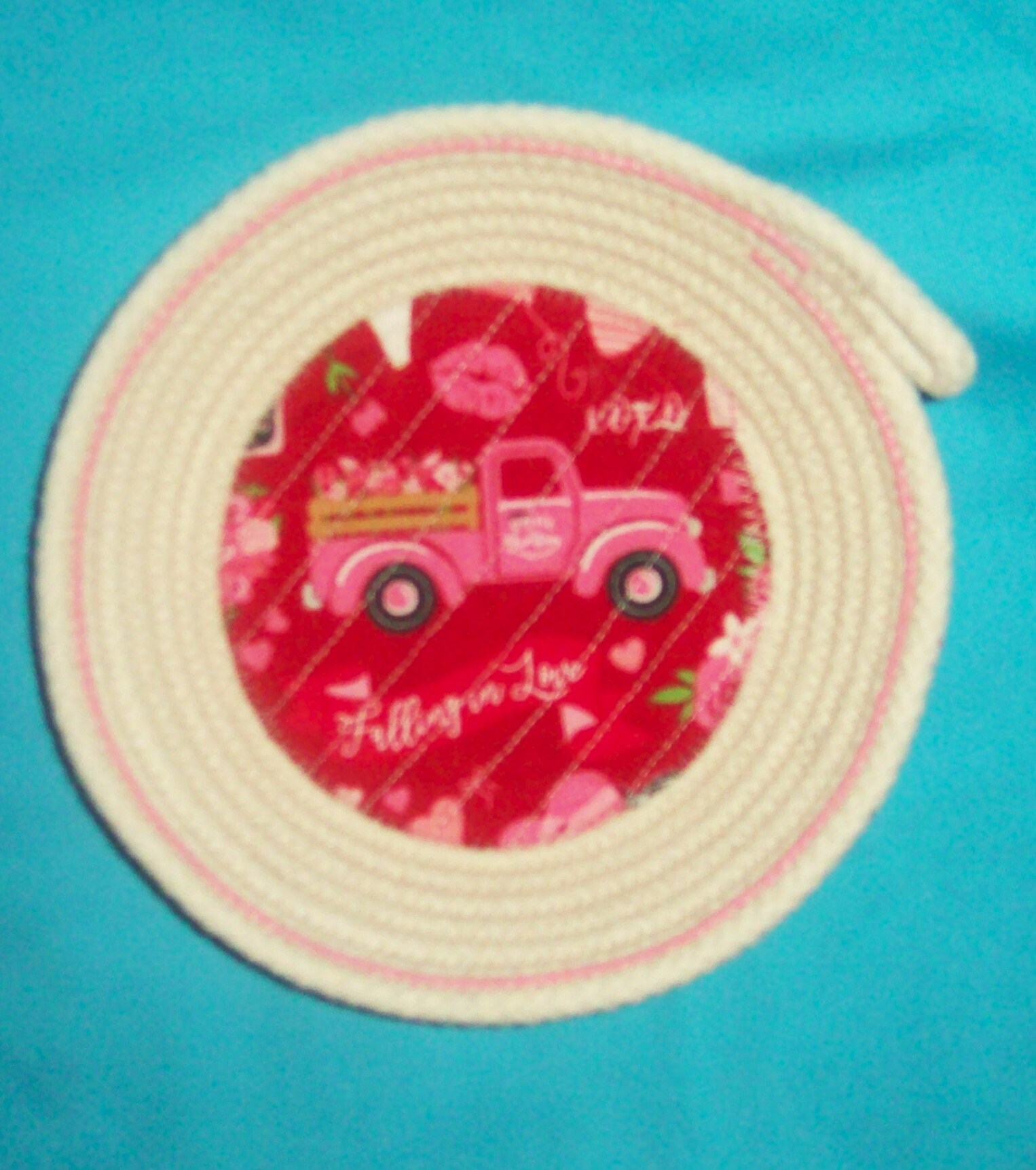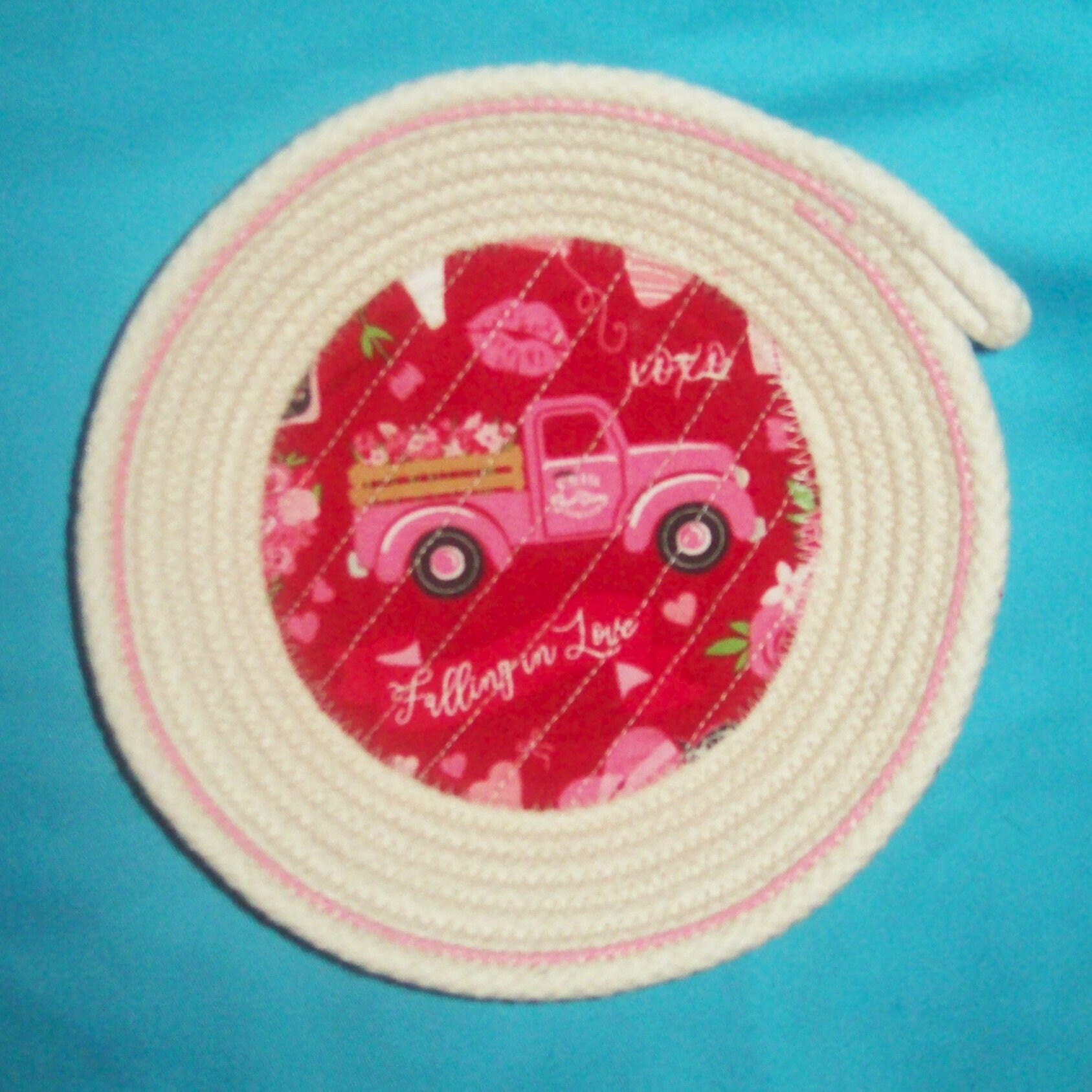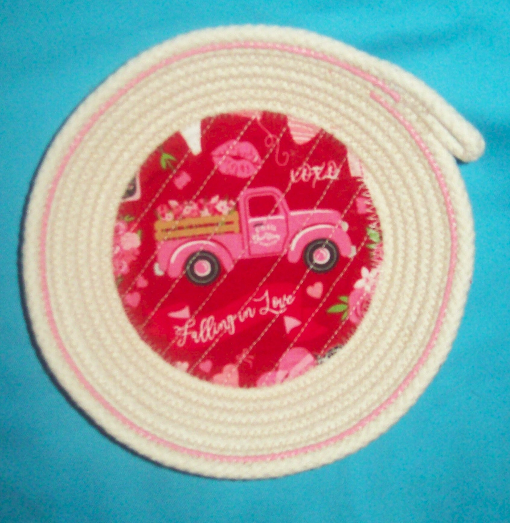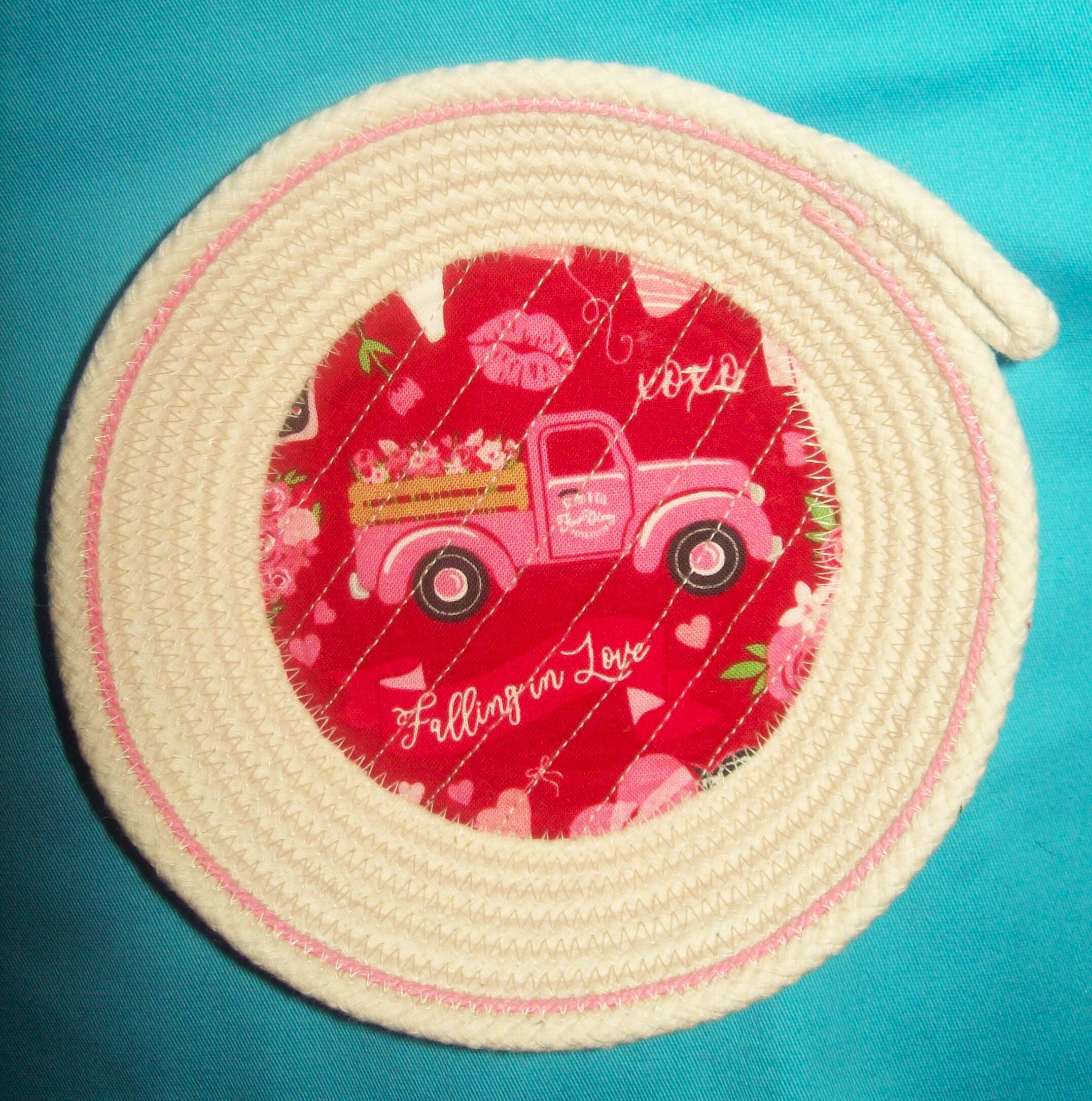Small Rope Bowl-Valentine Cord Basket-Red Truck and Hearts coiled bowl-trinket bowl-mini gift bowl basket