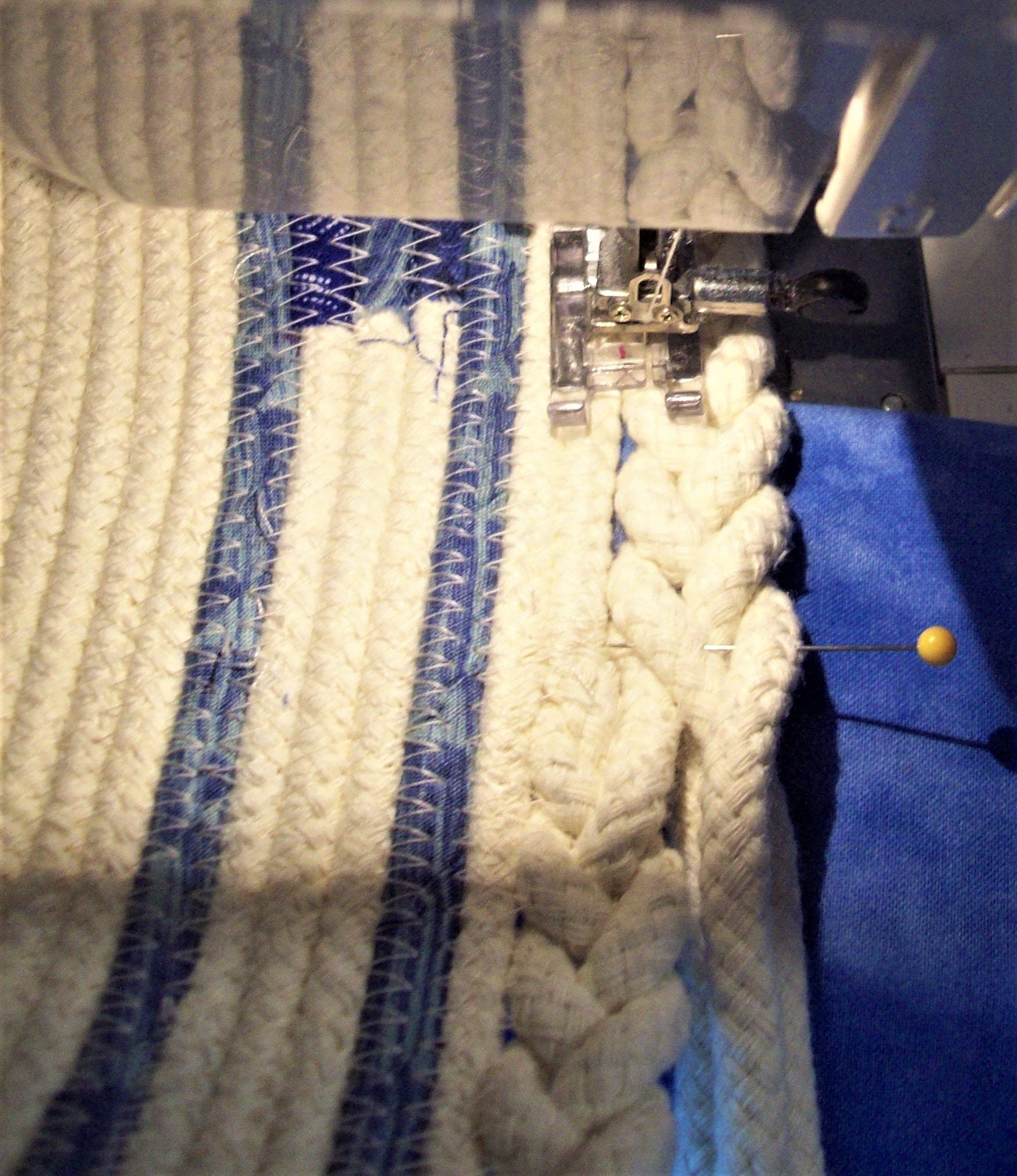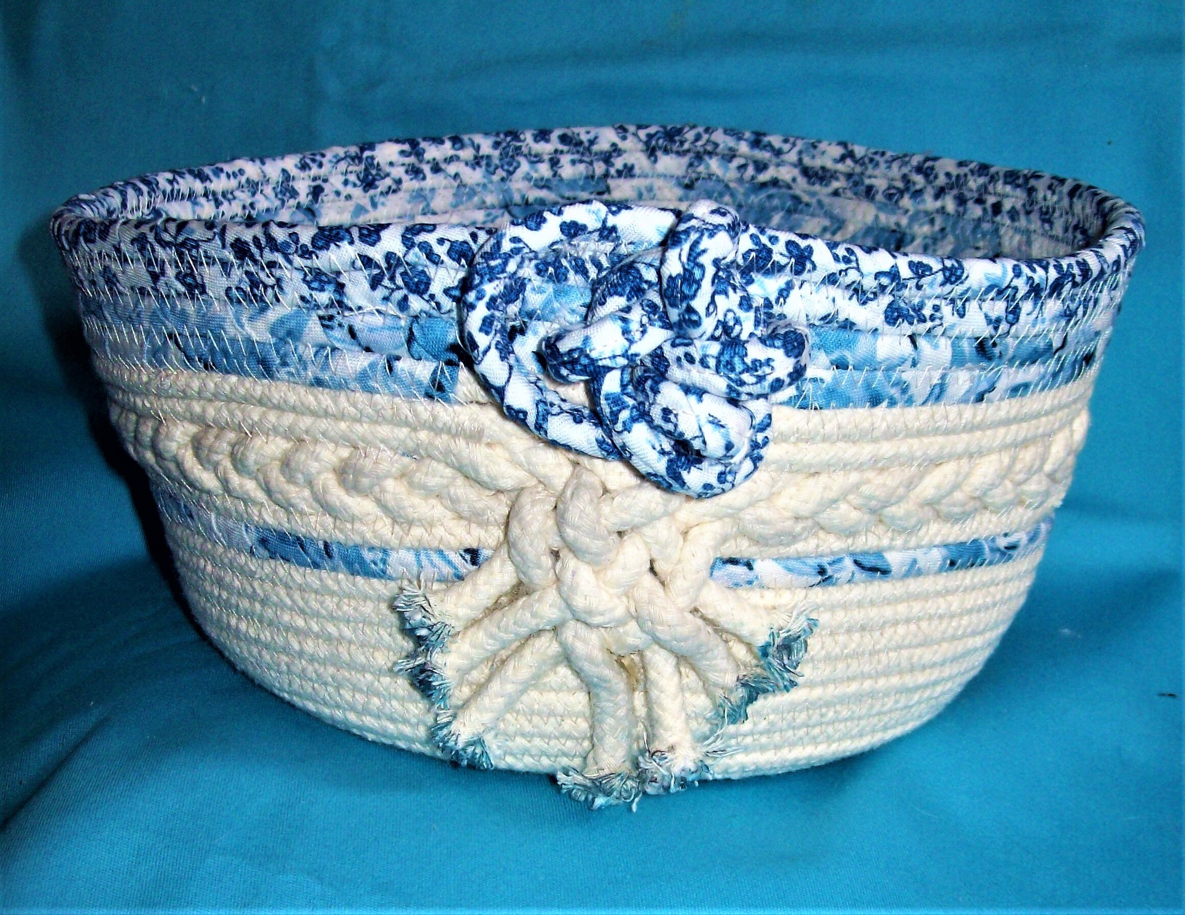 *This medium sized bowl has two different techniques used to make it OOAK. The top rim is fabric wrapped, while the middle is adorned with a hand braided rope for sturdiness and eye appeal.