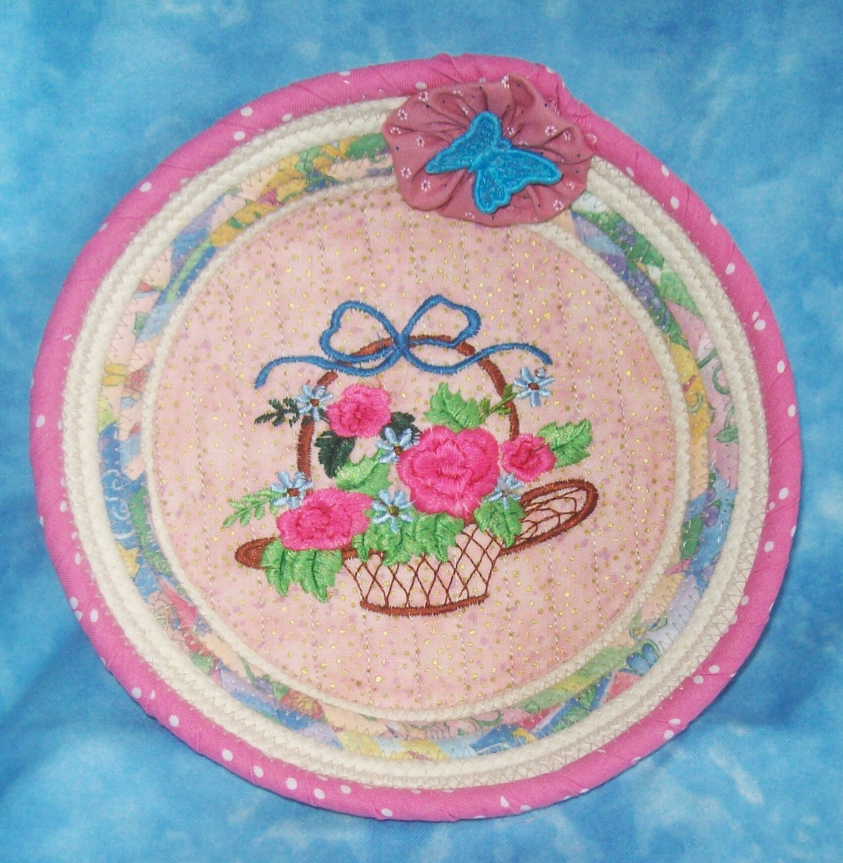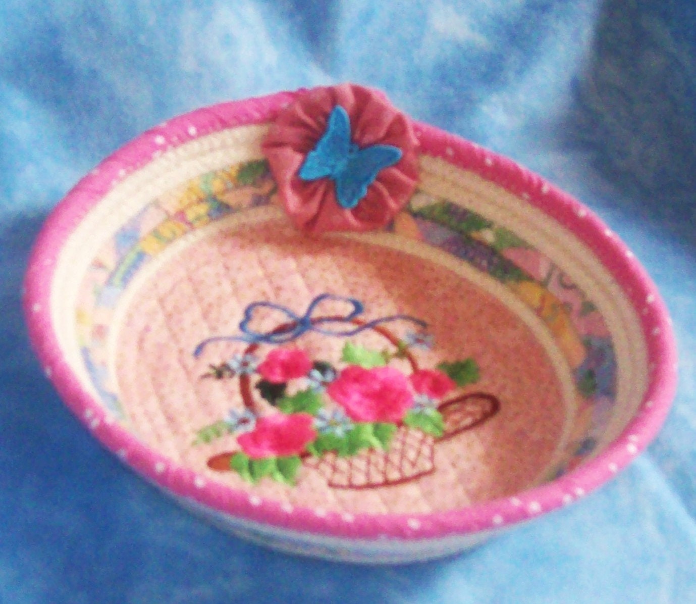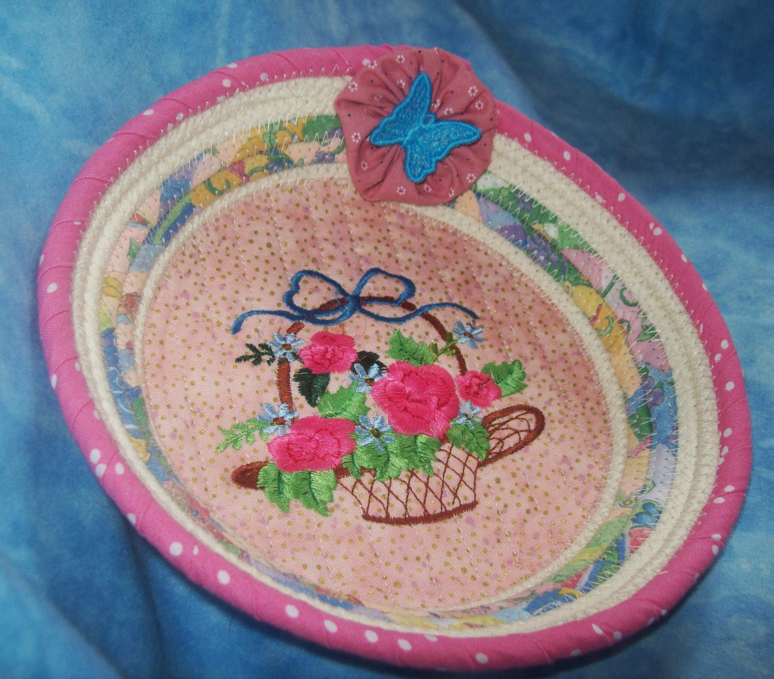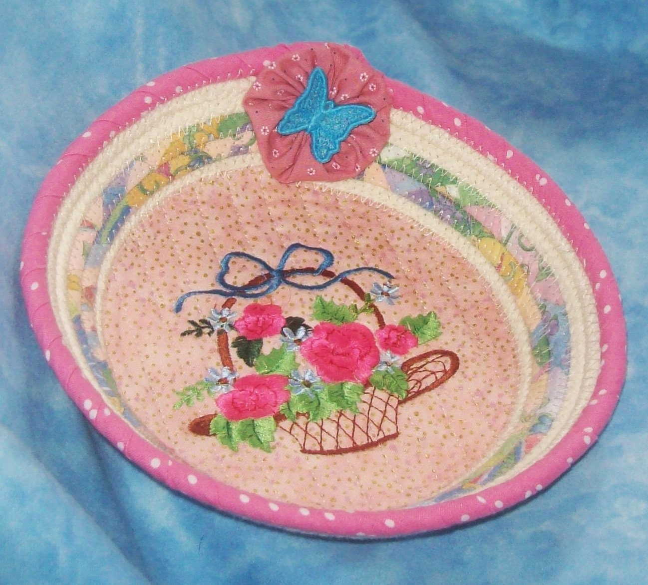 I have machine embroidered this pretty basket of flowers directly onto the bowl's base. A Prarie Flower or YoYo has been placed onto the side of the bowl and embellished with a lace butterfly, also made by me.