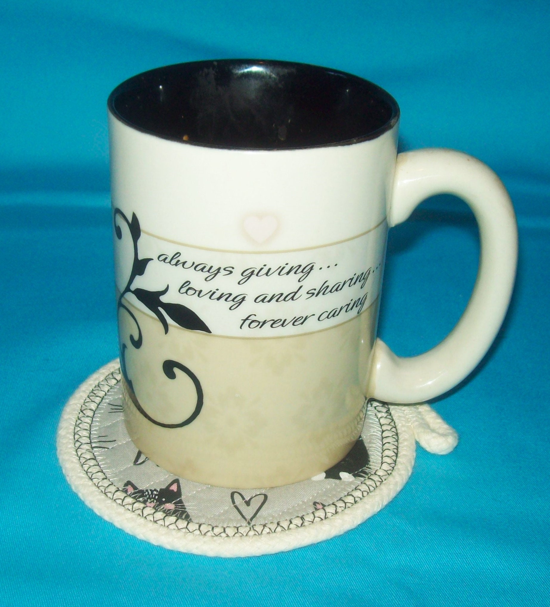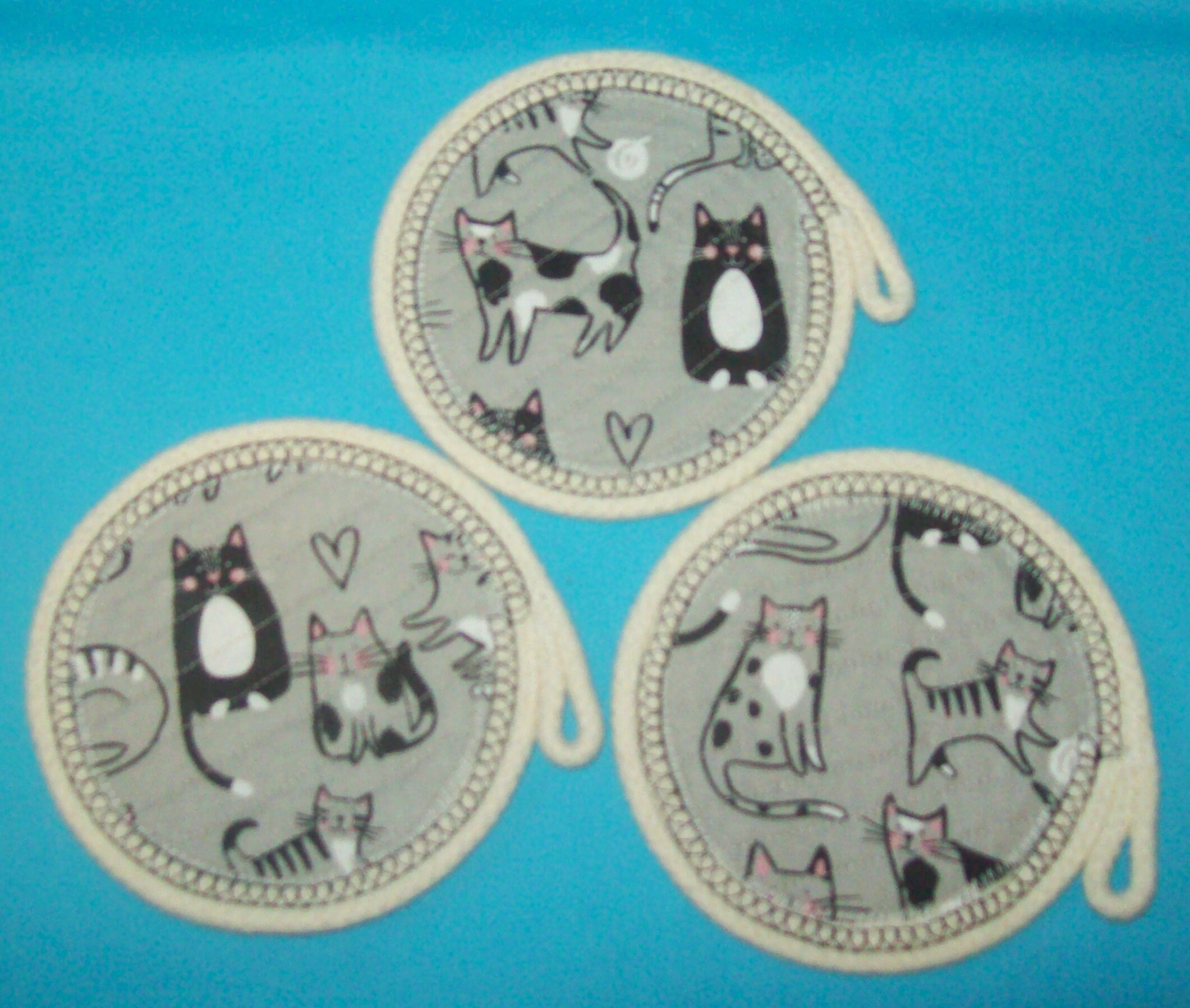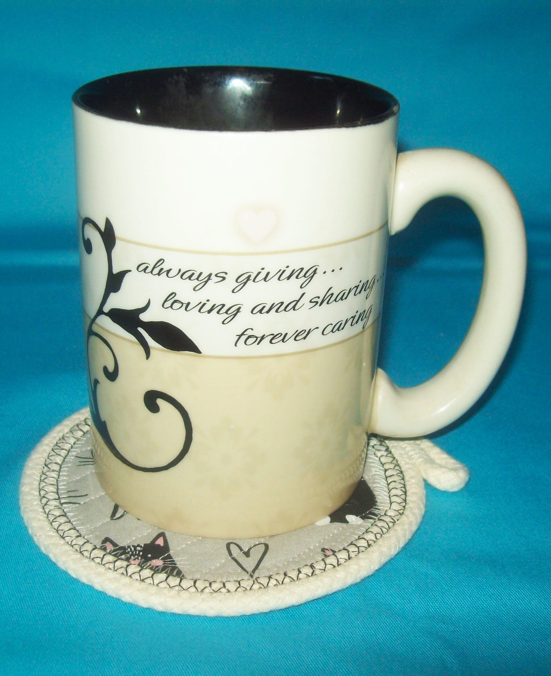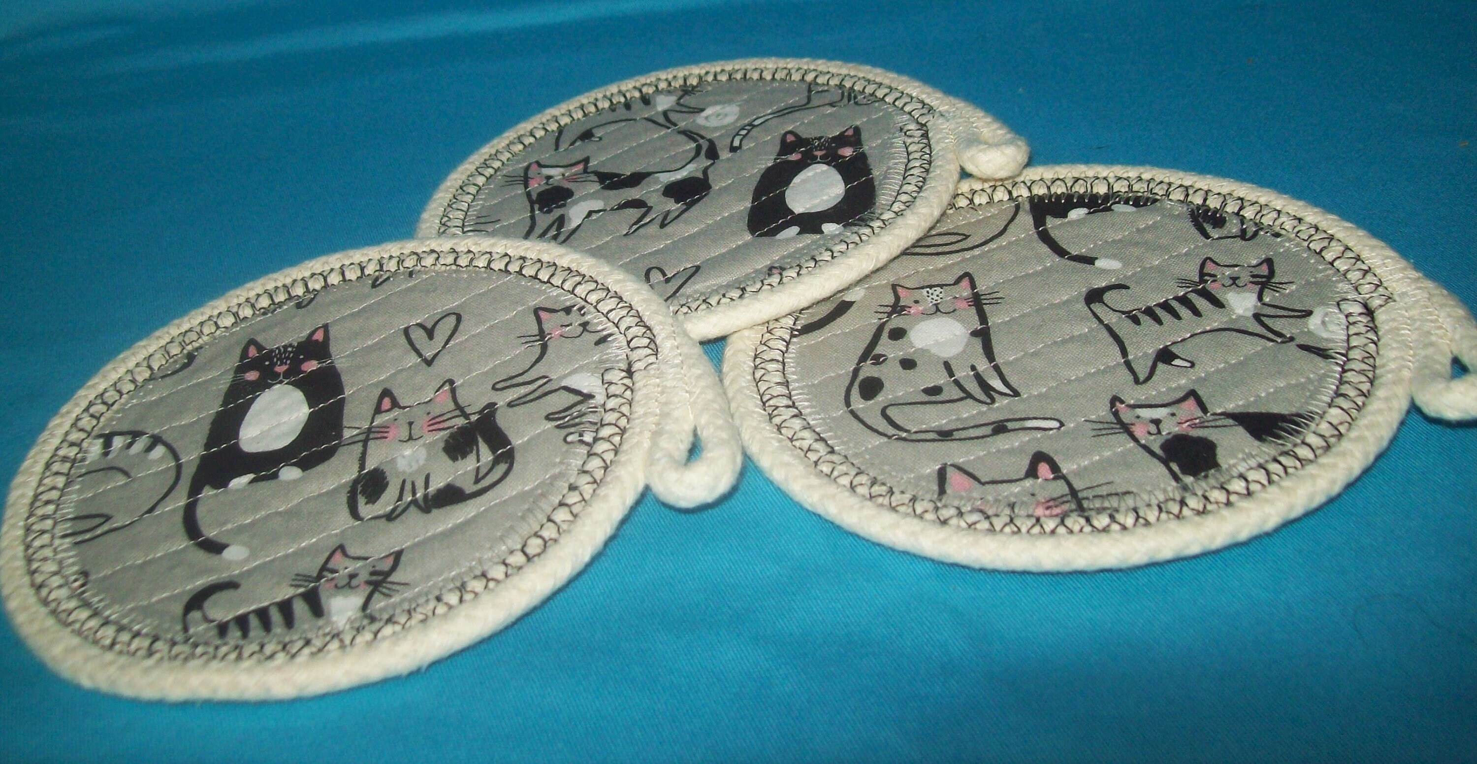 *The cat design fabric is attached to the rope base by using a channel stitch quilting style. By taking the extra time to do this, your coaster will not wrinkle or bunch up during use.