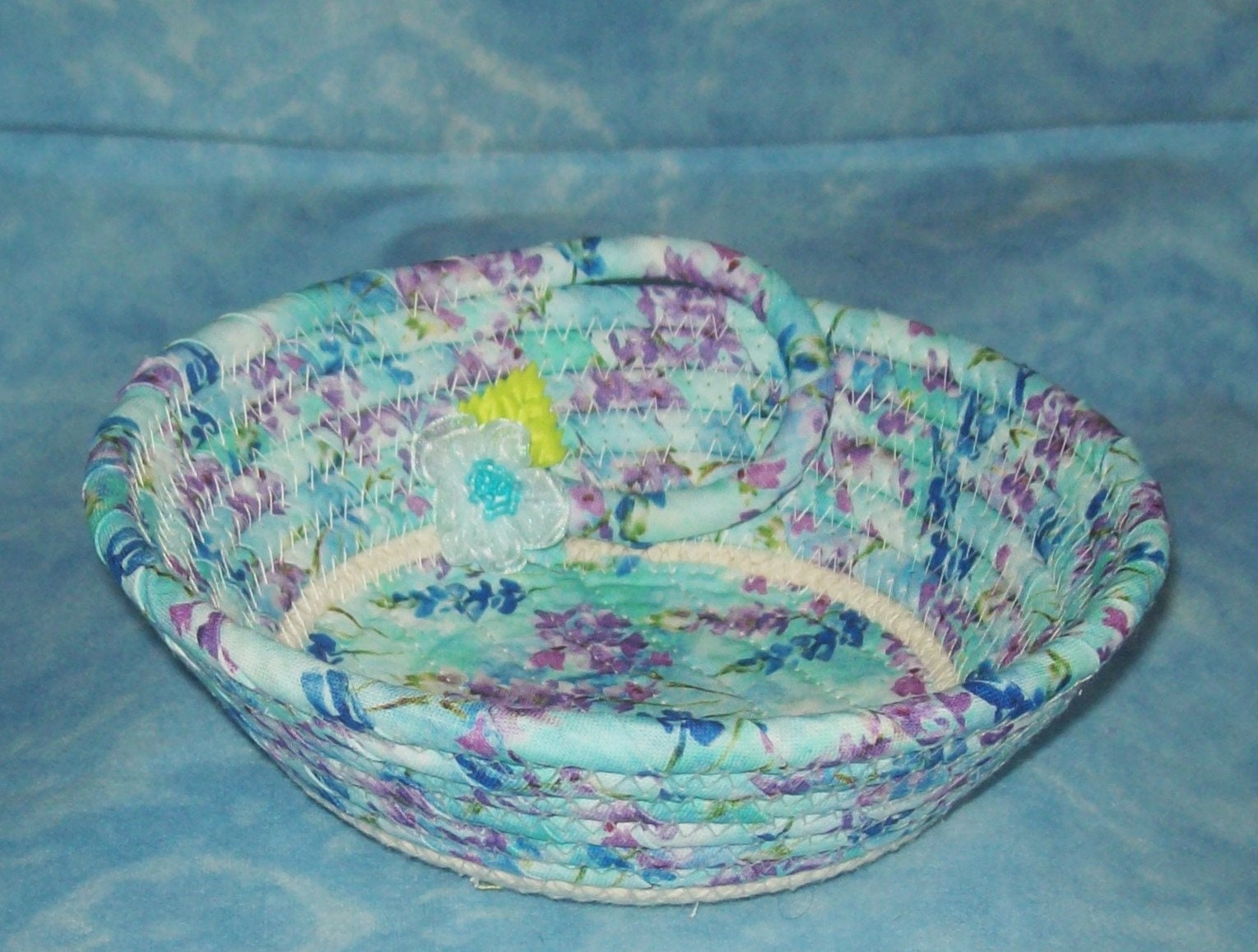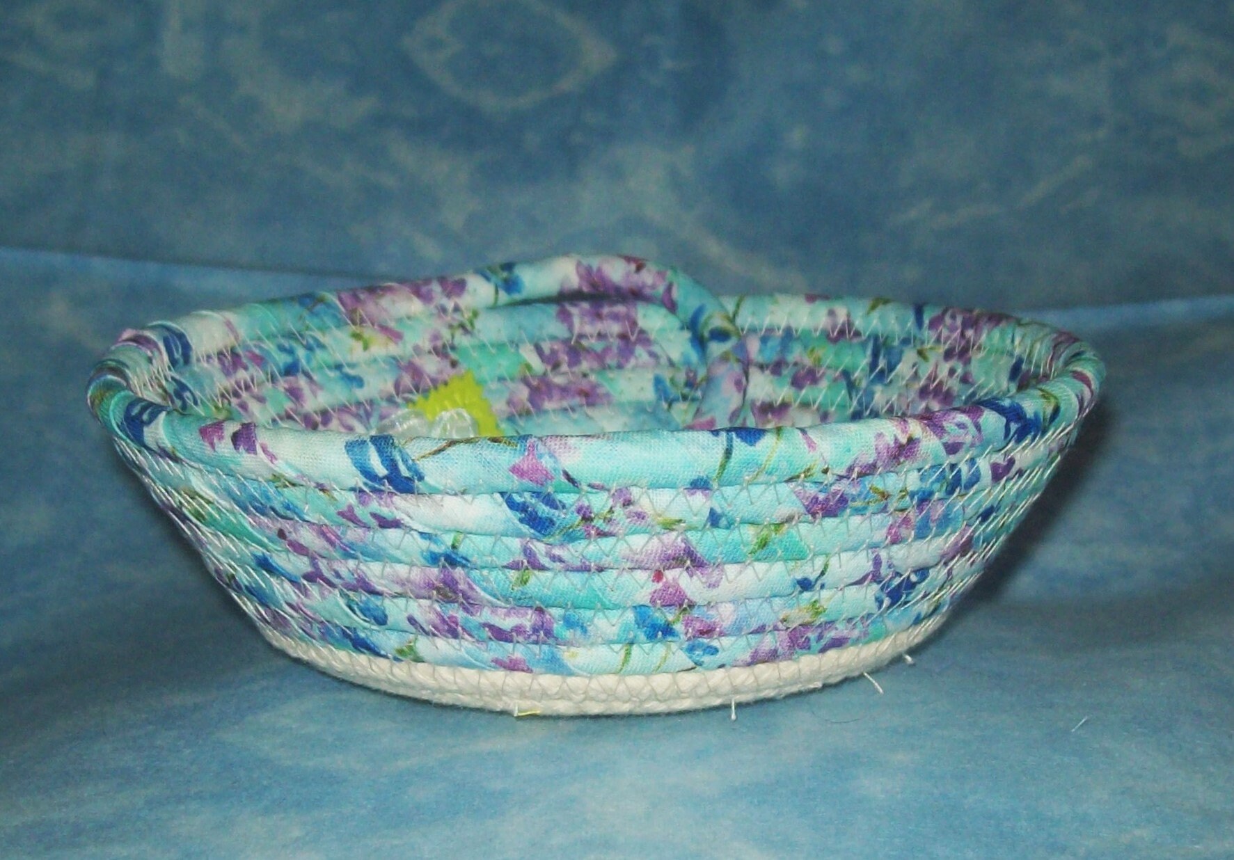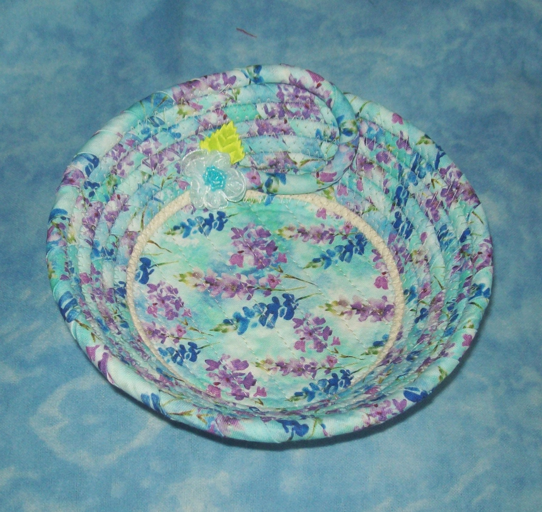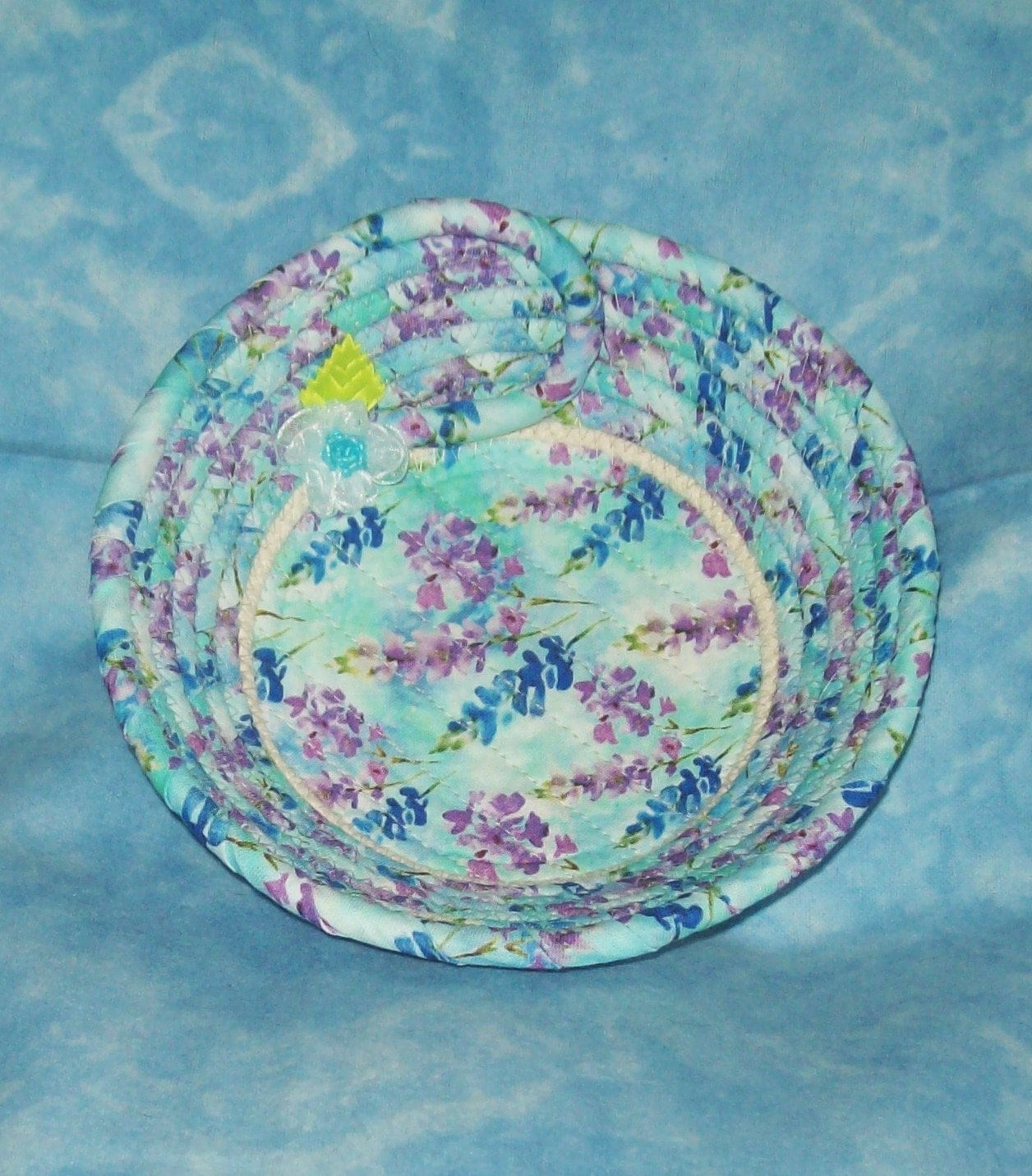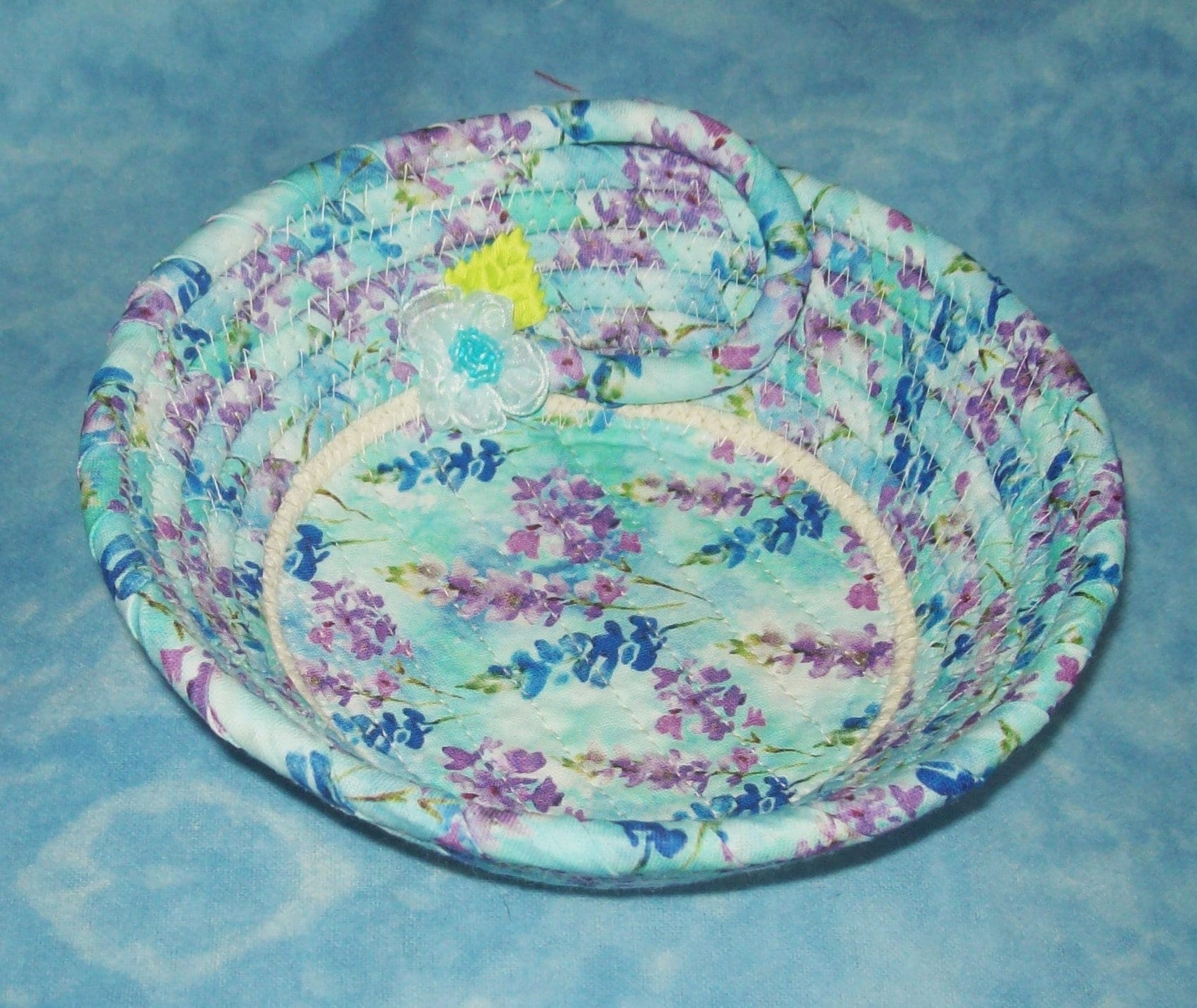 **I have sewn the center of this bowl with a channel quilting method. This gives you a chance to see what the fabric design looks like, plus keeps it nicely secured to the rope base.