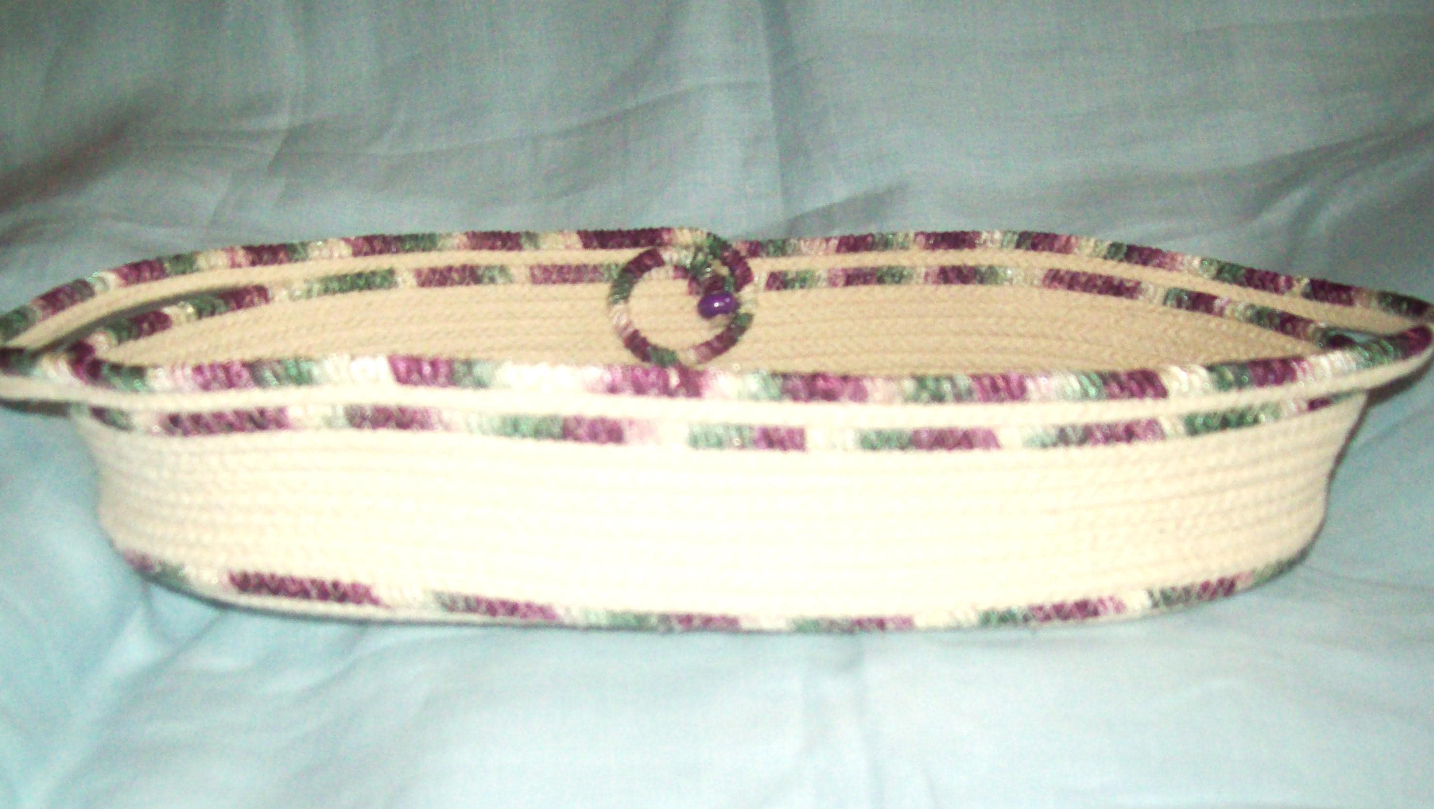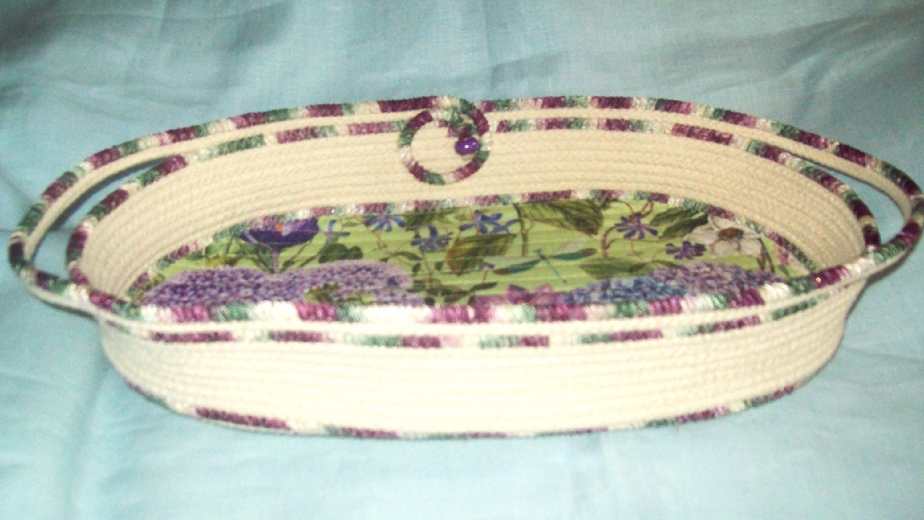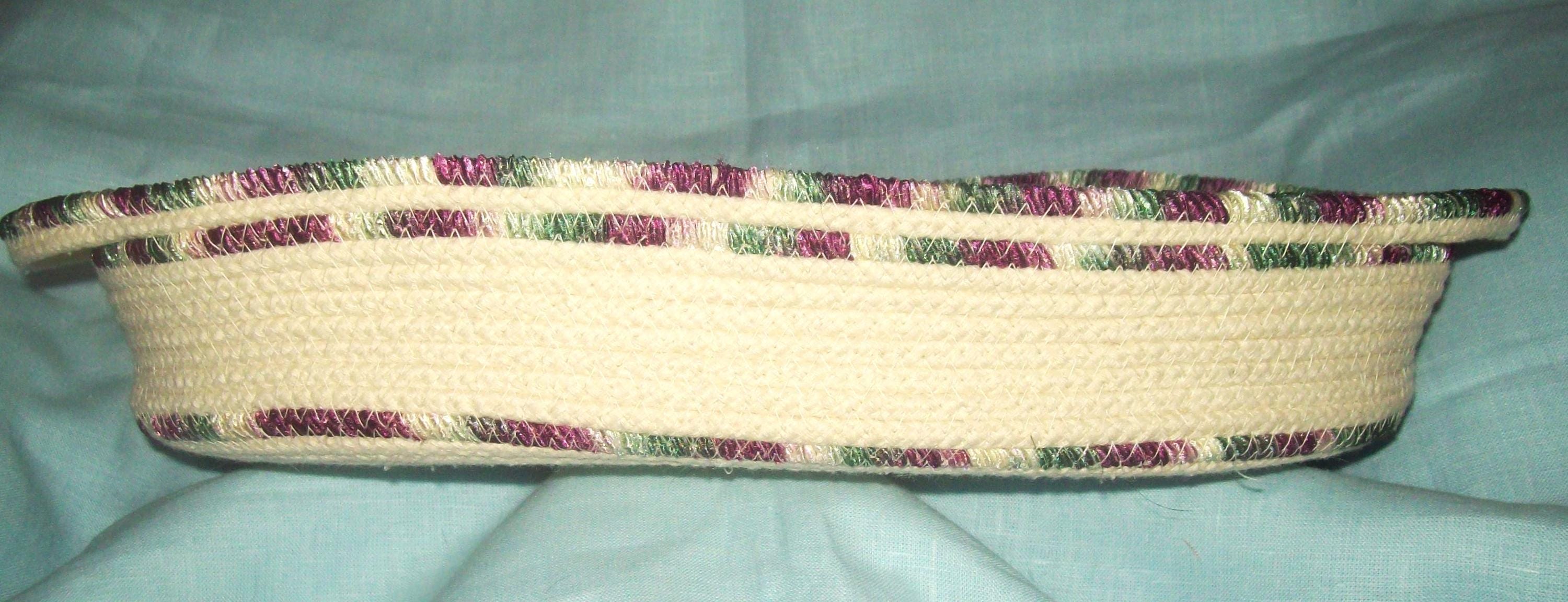 This rope bowl is coiled and wrapped with a high sheen ribbon for added texture. I channel quilt the fabric base so it will not buckle, but lays flat. My all-natural cotton rope is made in America.