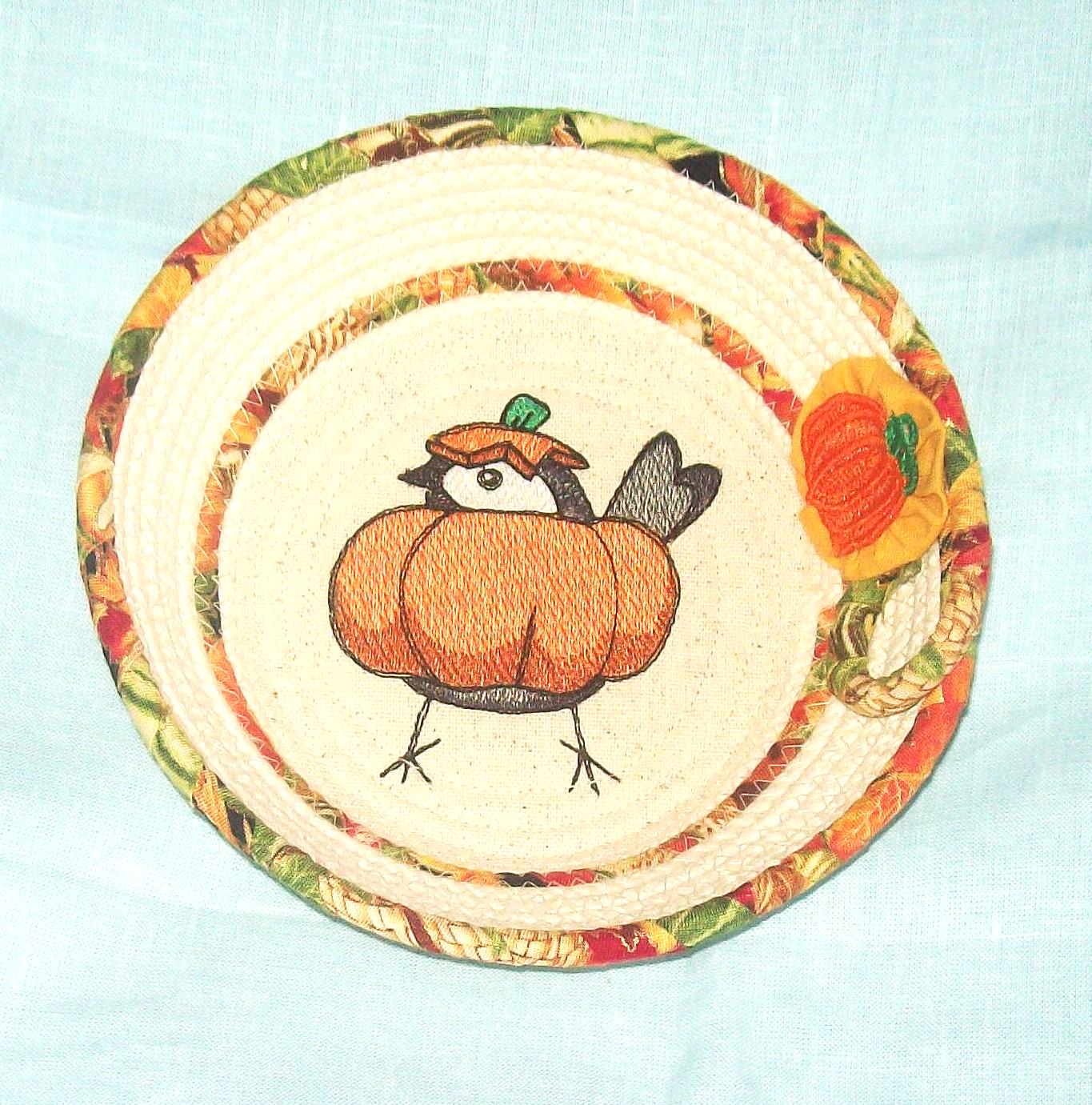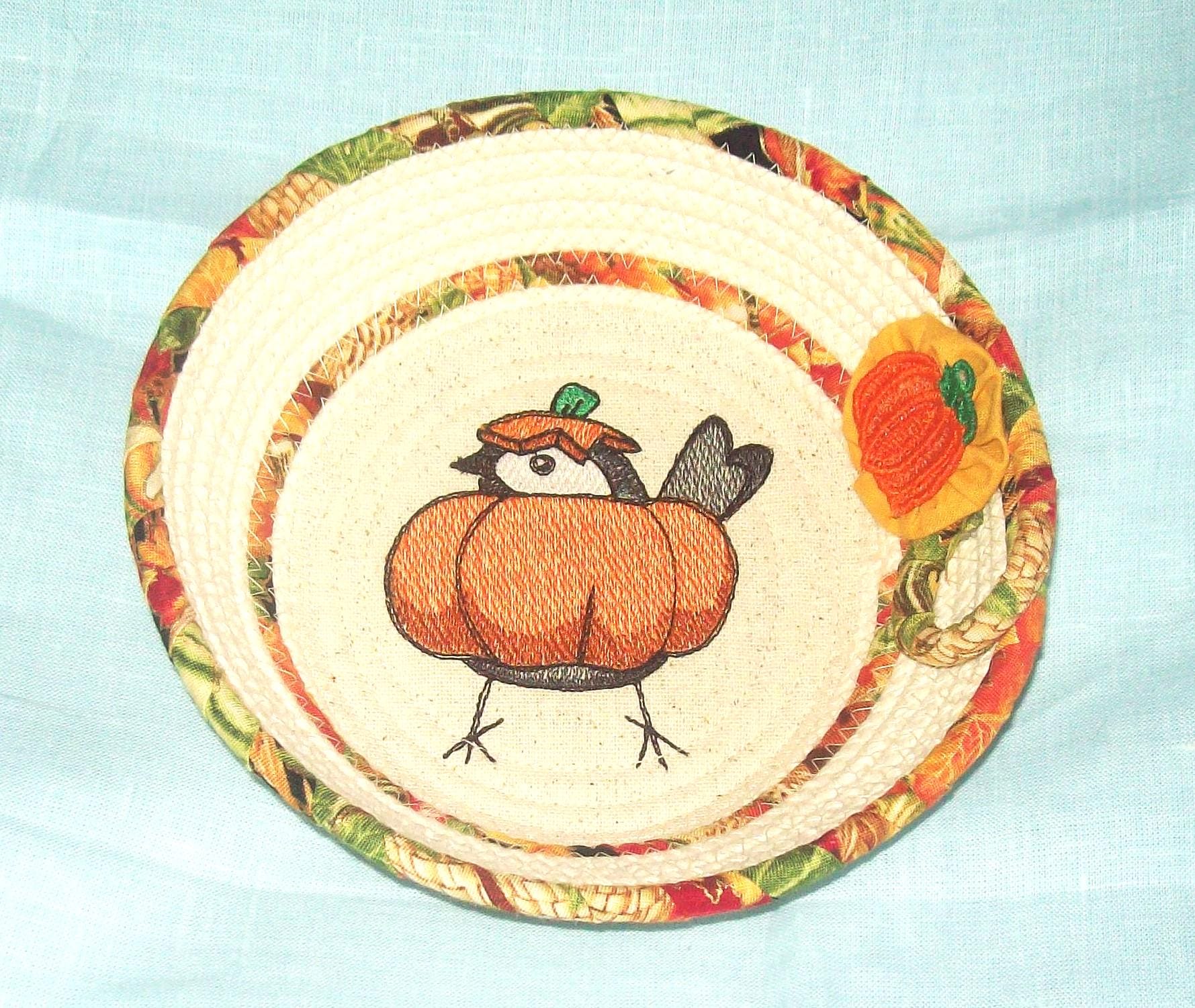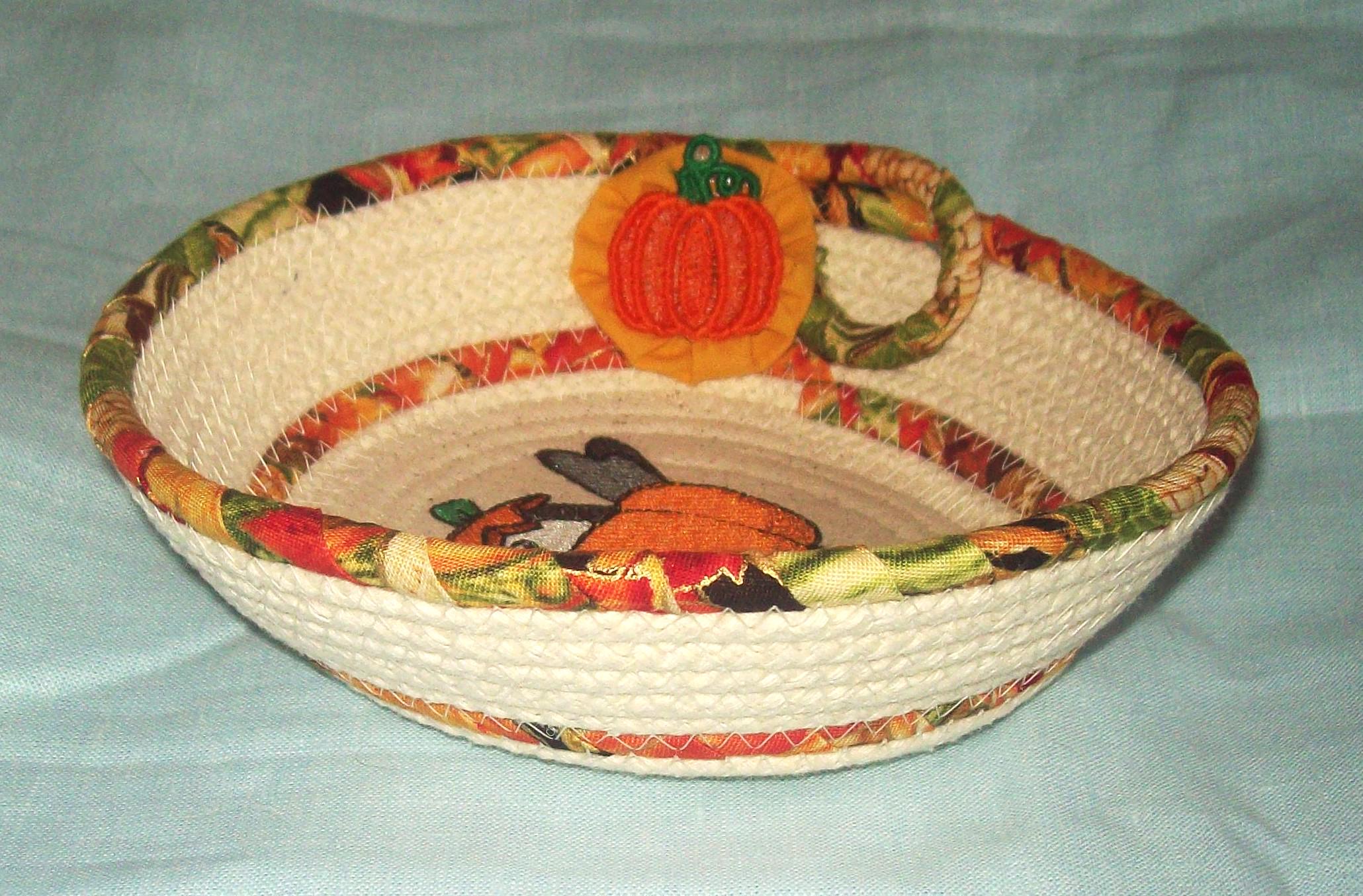 There is a stiff thread pumpkin attached to the side of the bowl as an embellishment, along with an old fashioned cotton fabric handsewn "yoyo" circle. (I made the little pumpkin too.)