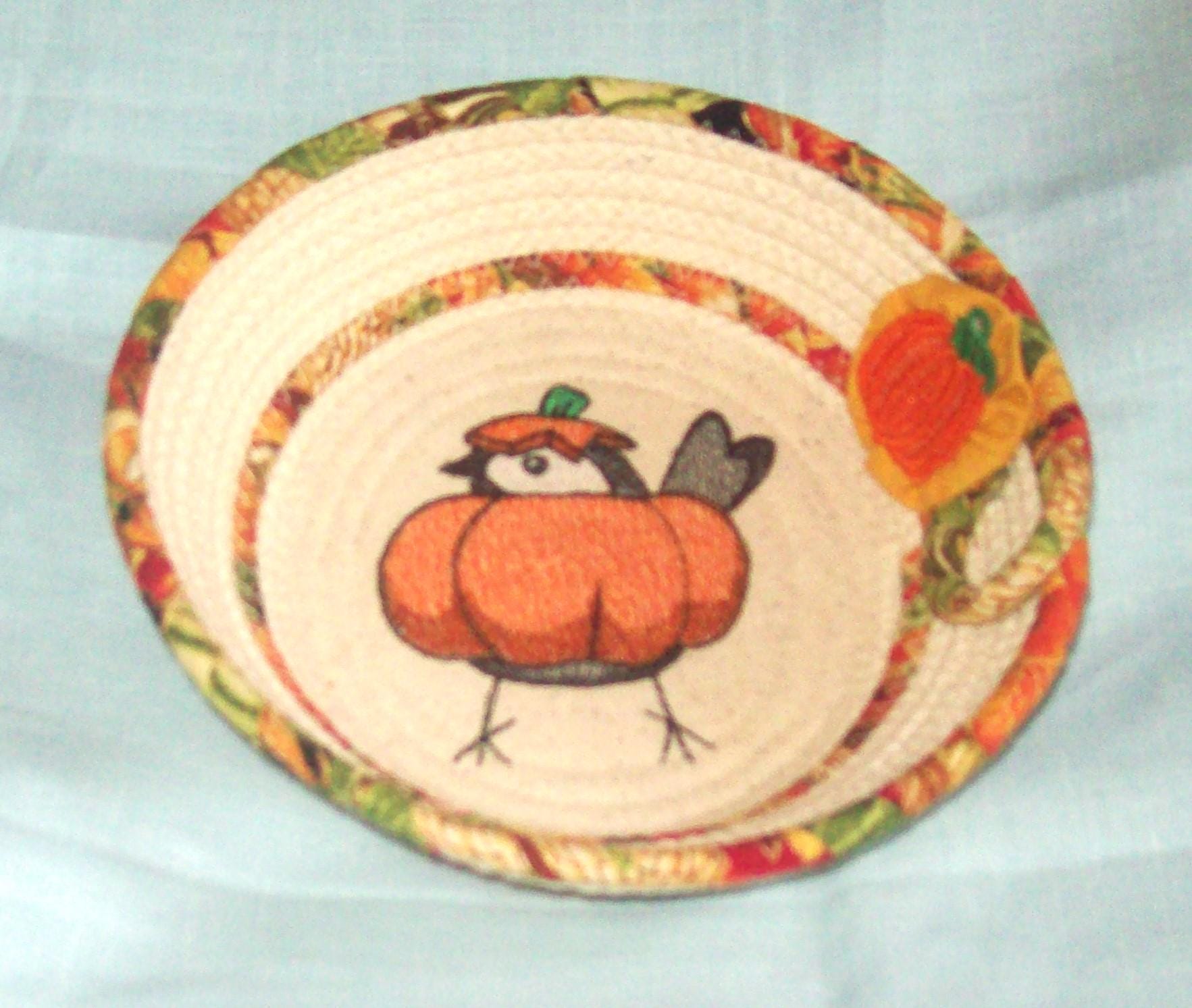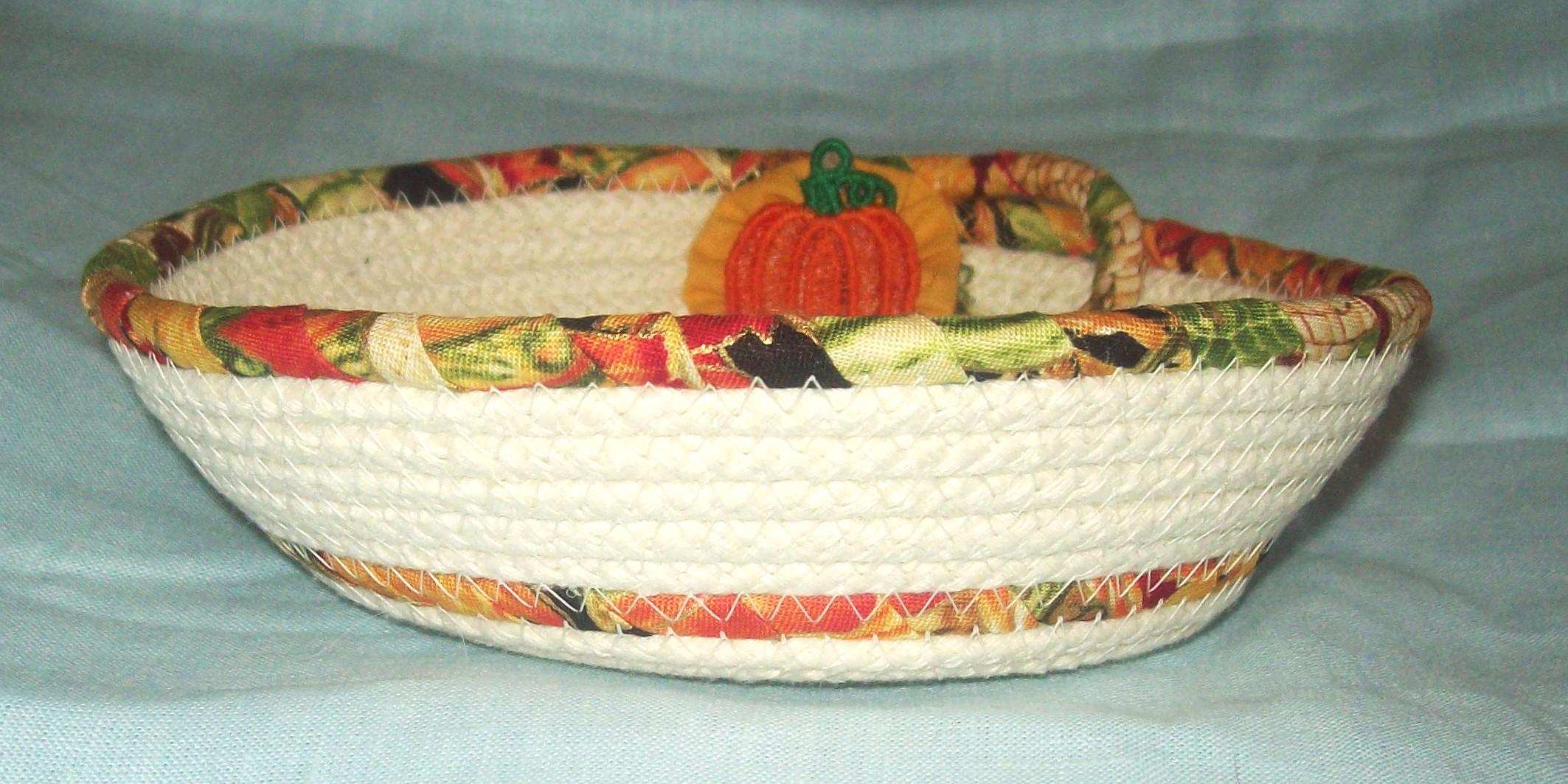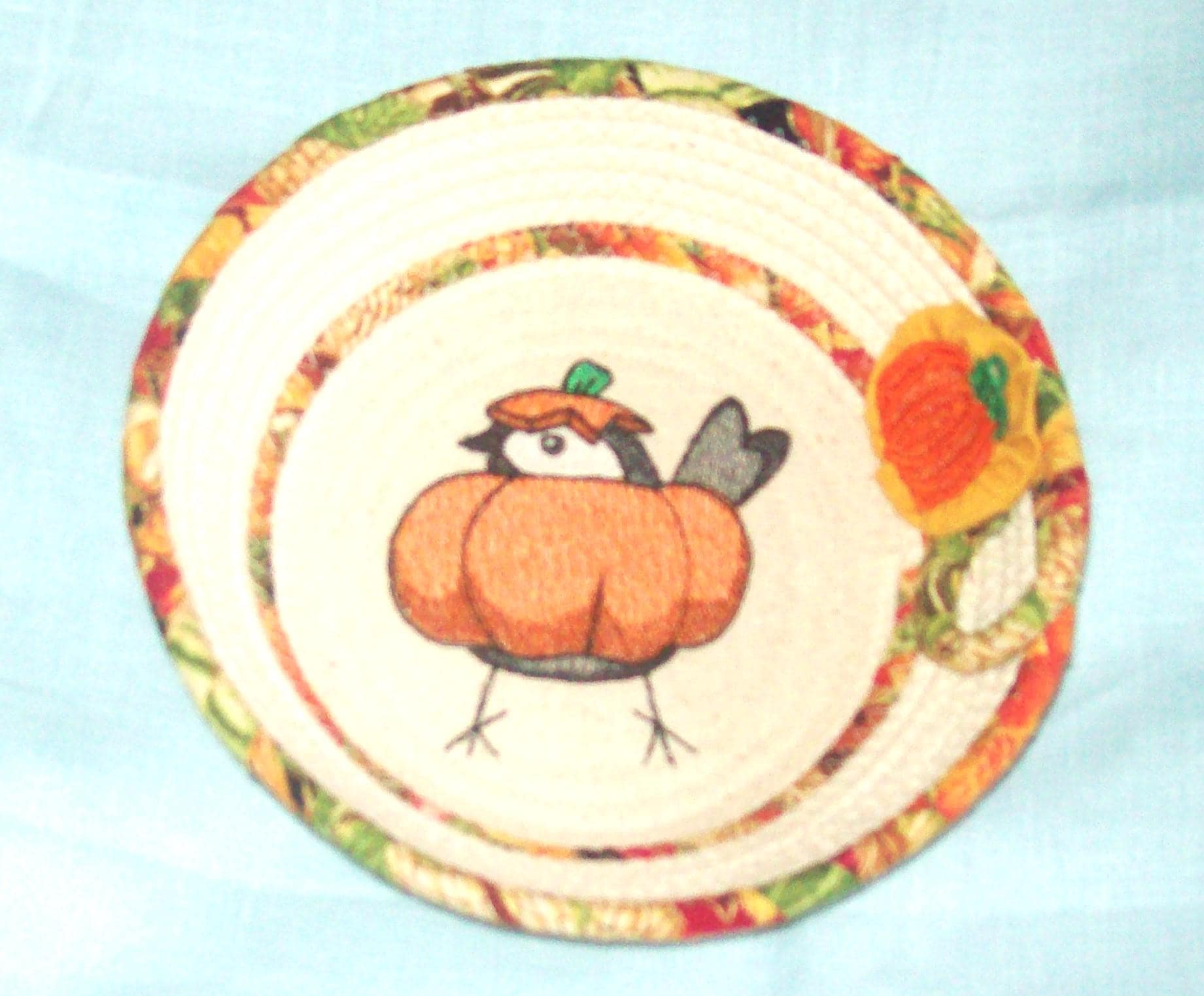 There is a stiff thread pumpkin attached to the side of the bowl as an embellishment, along with an old fashioned cotton fabric handsewn "yoyo" circle. (I made the little pumpkin too.)