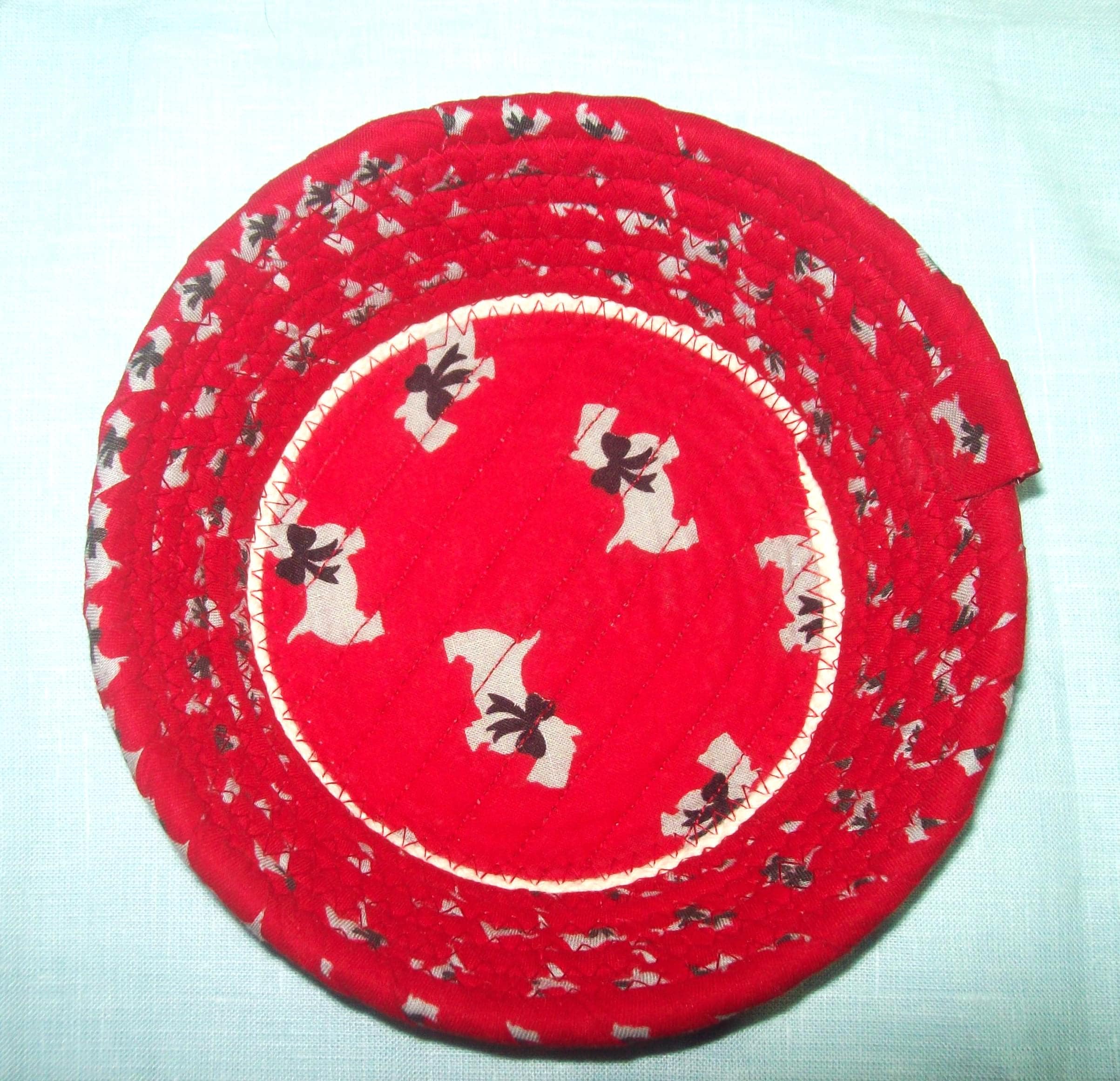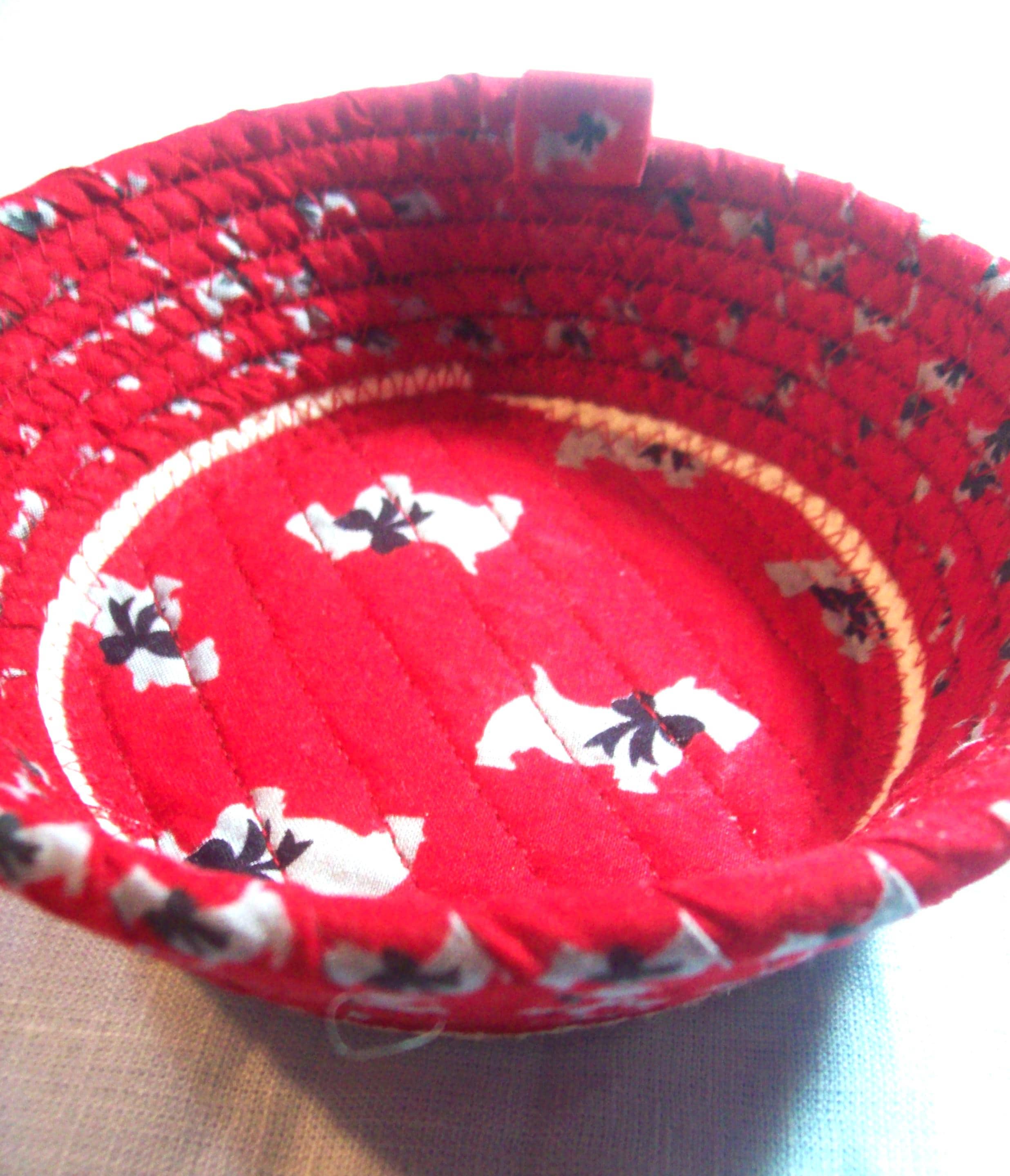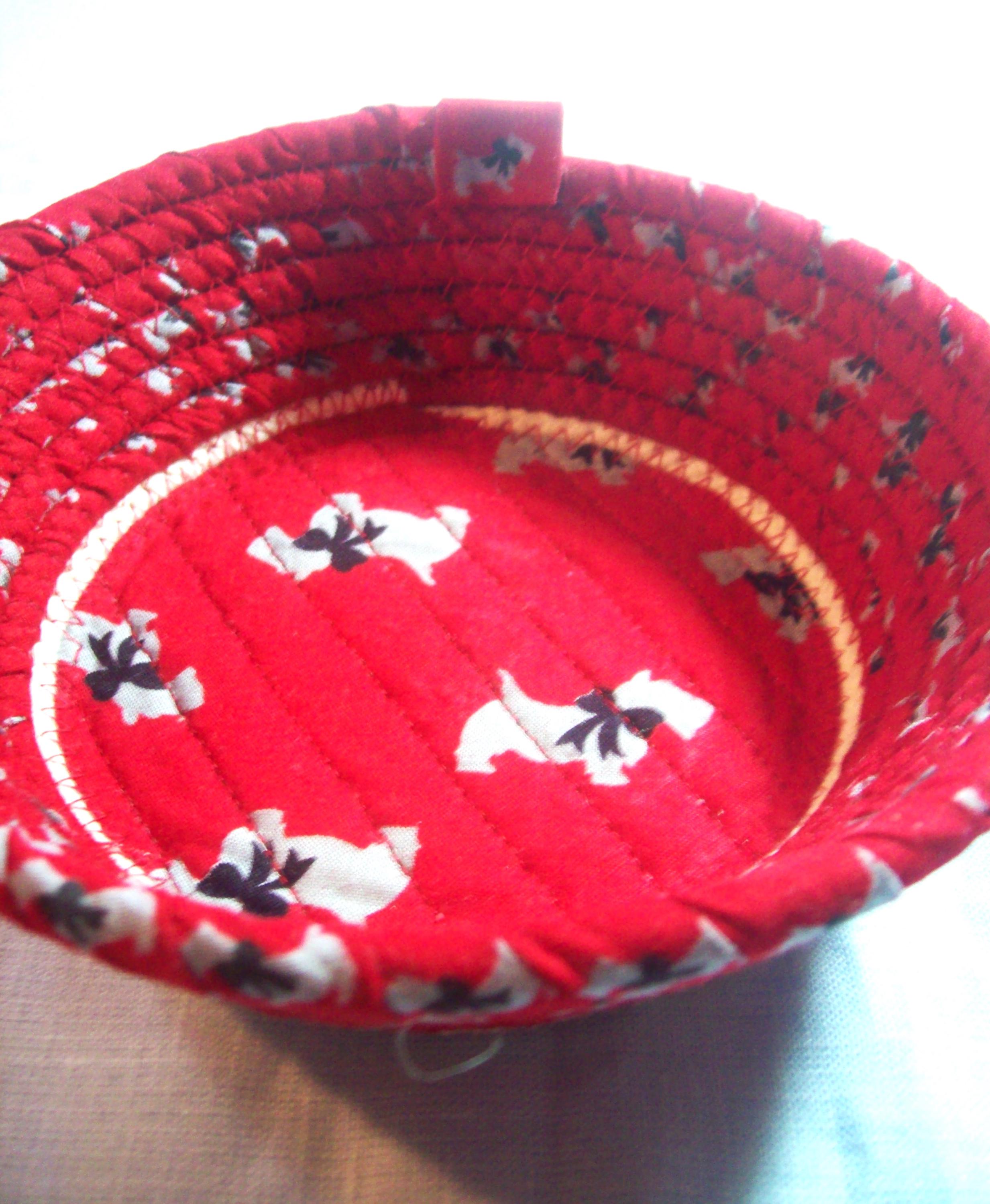 **I have sewn the center of this bowl with a channel quilting method. This gives you a chance to see what the fabric design looks like, plus keeps it nicely secured to the rope base.