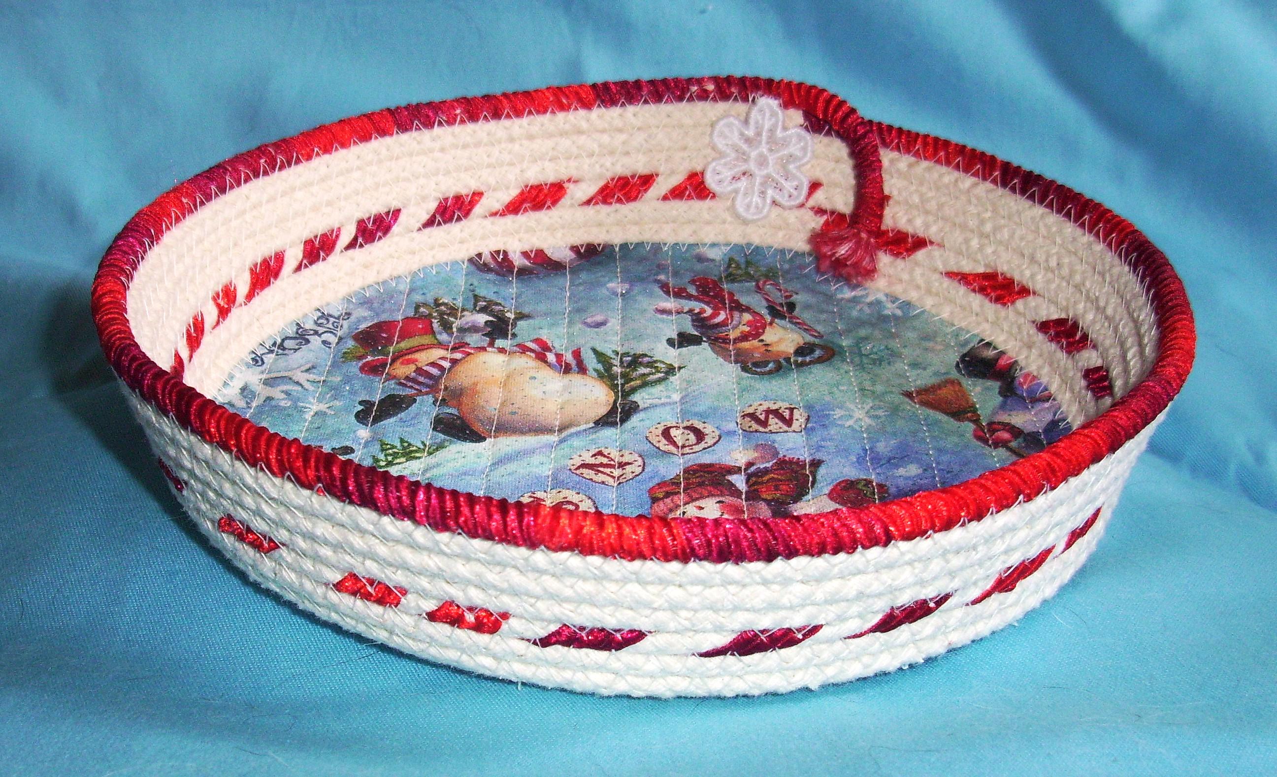 I have hand coiled this bowl and then used a zigzag stitch to stabilize it. I use a channel quilting stitch to secure the fabric to the base of the bowl. This keeps it flat without puckering. To finish off the design, I have added flat ribbon to make the candy cane effect inside the bowl and again, around the top edge by wrapping it much closer. I have made a small stiff lace snowflake, on my home embroidery machine, as the final touch.