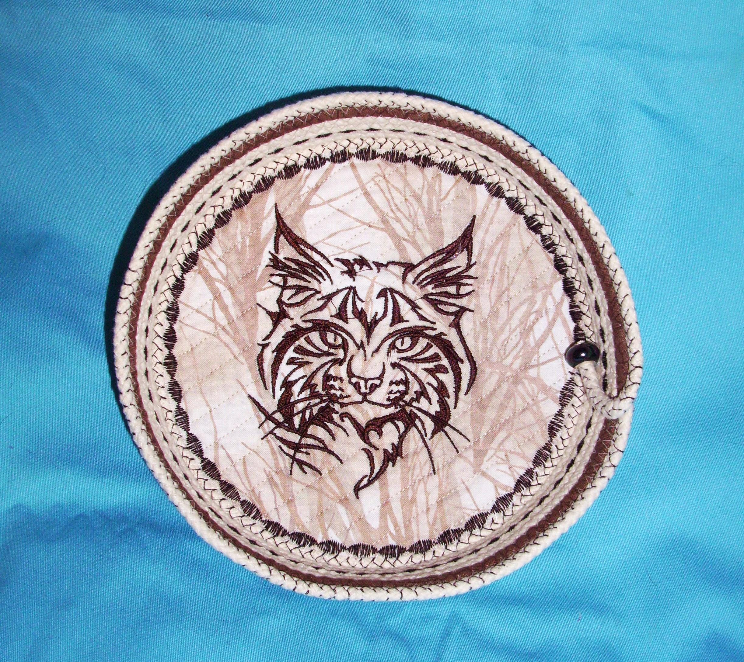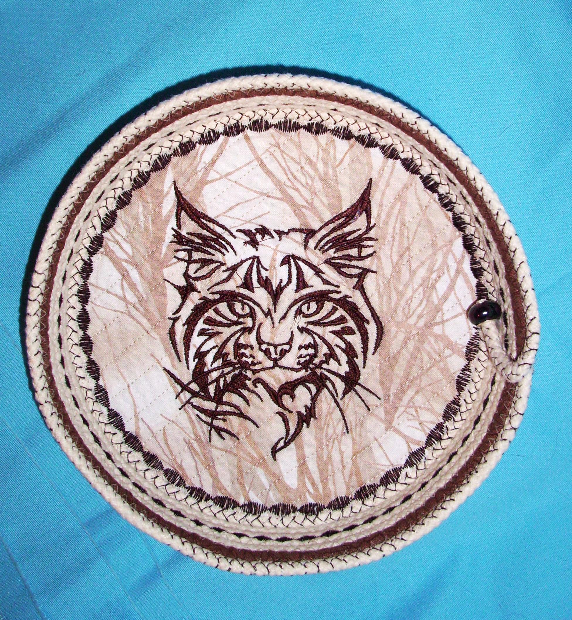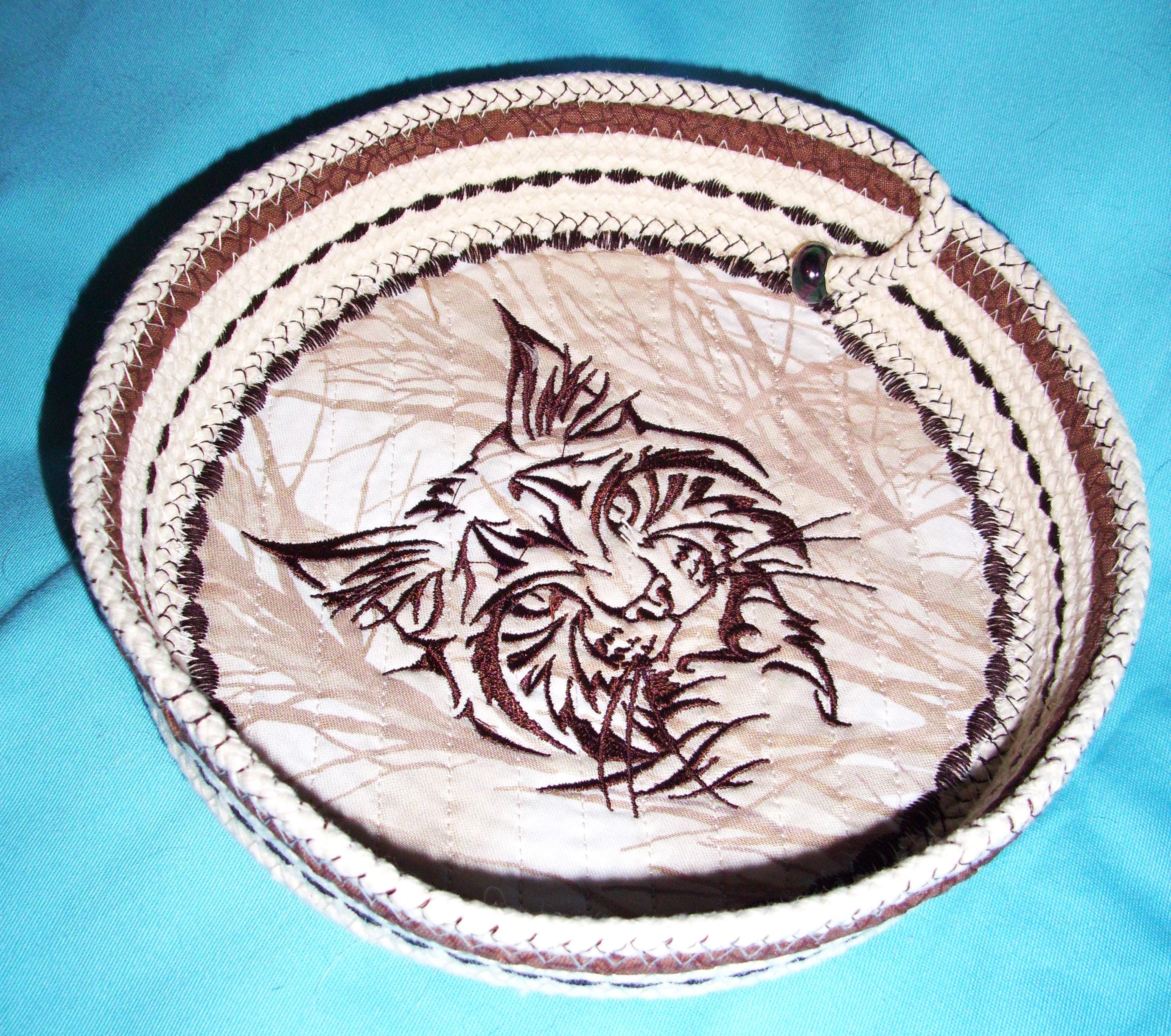 I have hand coiled the base of this cotton rope basket and then machine zigzagged it to make the bowl. I then used channel quilting to attach the "twig" print fabric to the base upon which the lynx was machine embroidered. Extra decorative brown stitches were used to add a finishing touch.