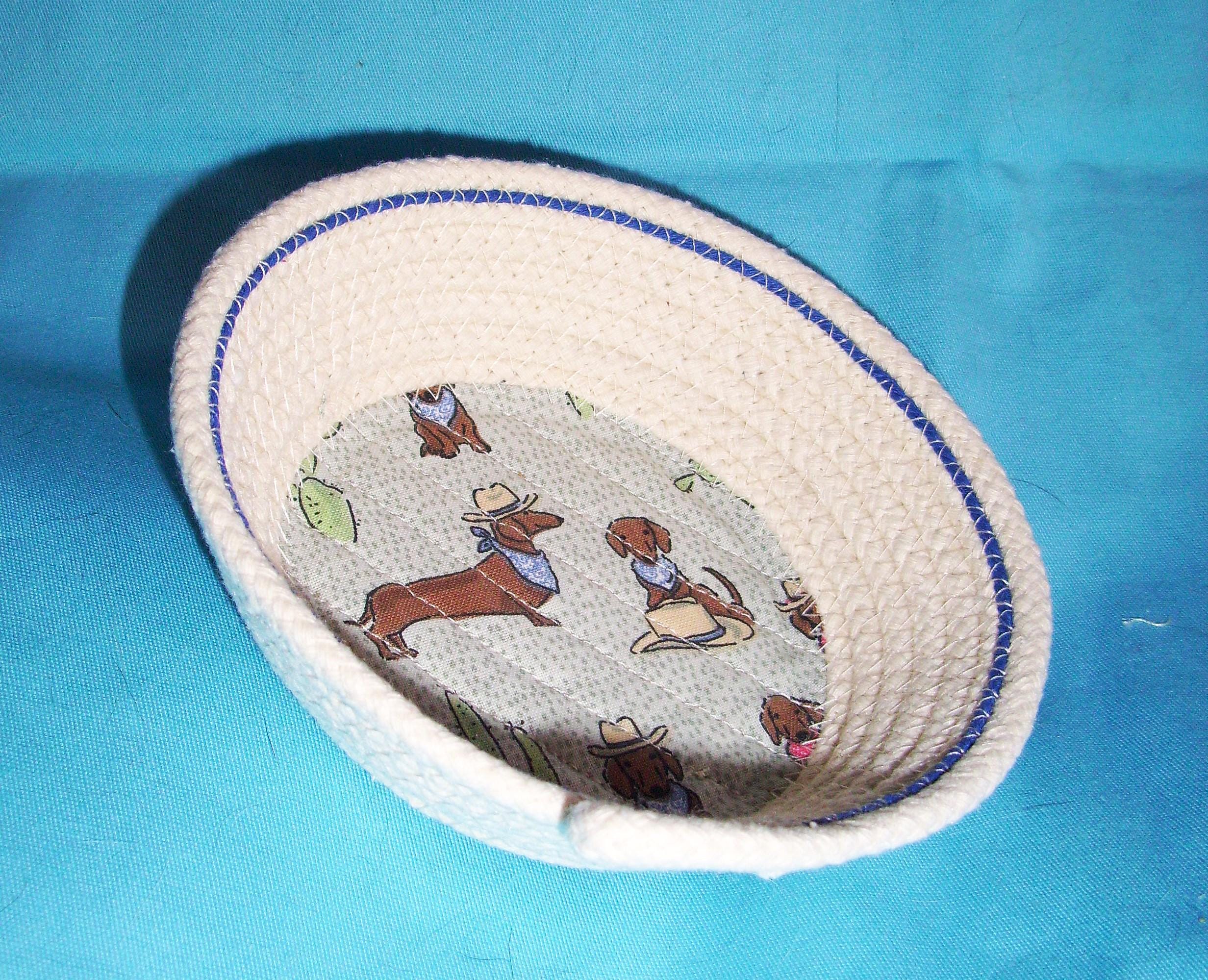 Natural USA made cotton clothesline rope is used to make this cute little bowl. I have added the fabric to the bottom by stitching it directly to the base of the bowl. The edges of the fabric is tucked between the rope and sewn securely so it lays flat in the bottom.
