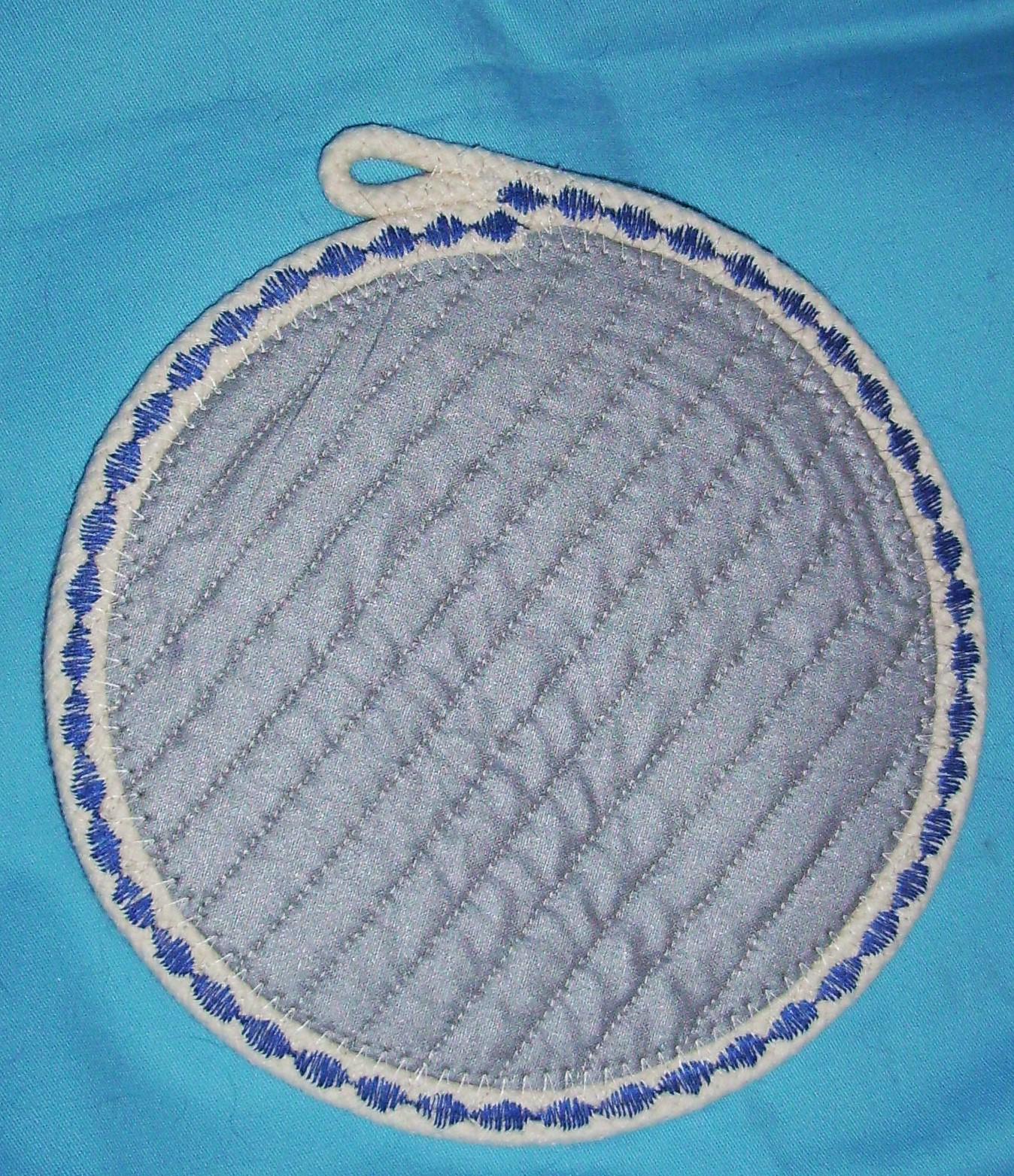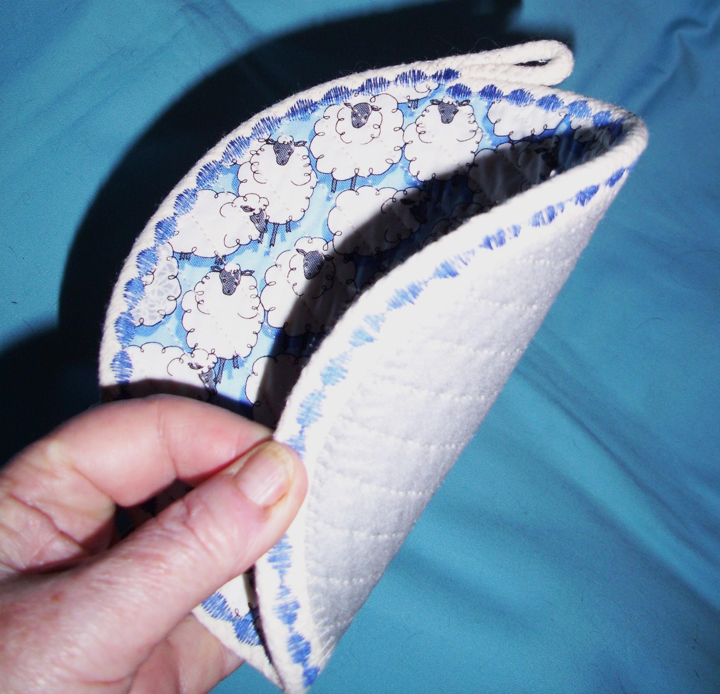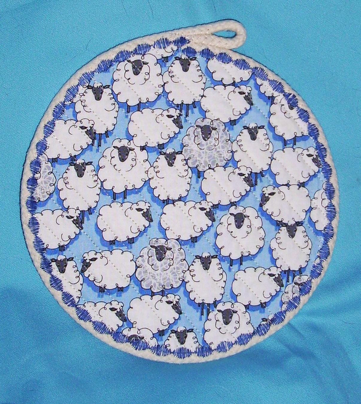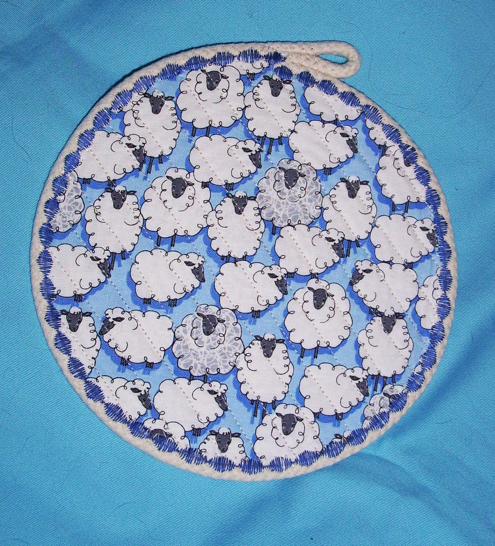 Use this farm and country circular hot mat when serving any hot beverage. It is channel quilted to keep it sturdy, with a herd of blue sheep on one side and silver heat-resistant fabric on the other. Other uses are to protect your furniture from scratches, heat or water marks, such as a candle mat, potted plant pad, or as a mug rug or large coaster.