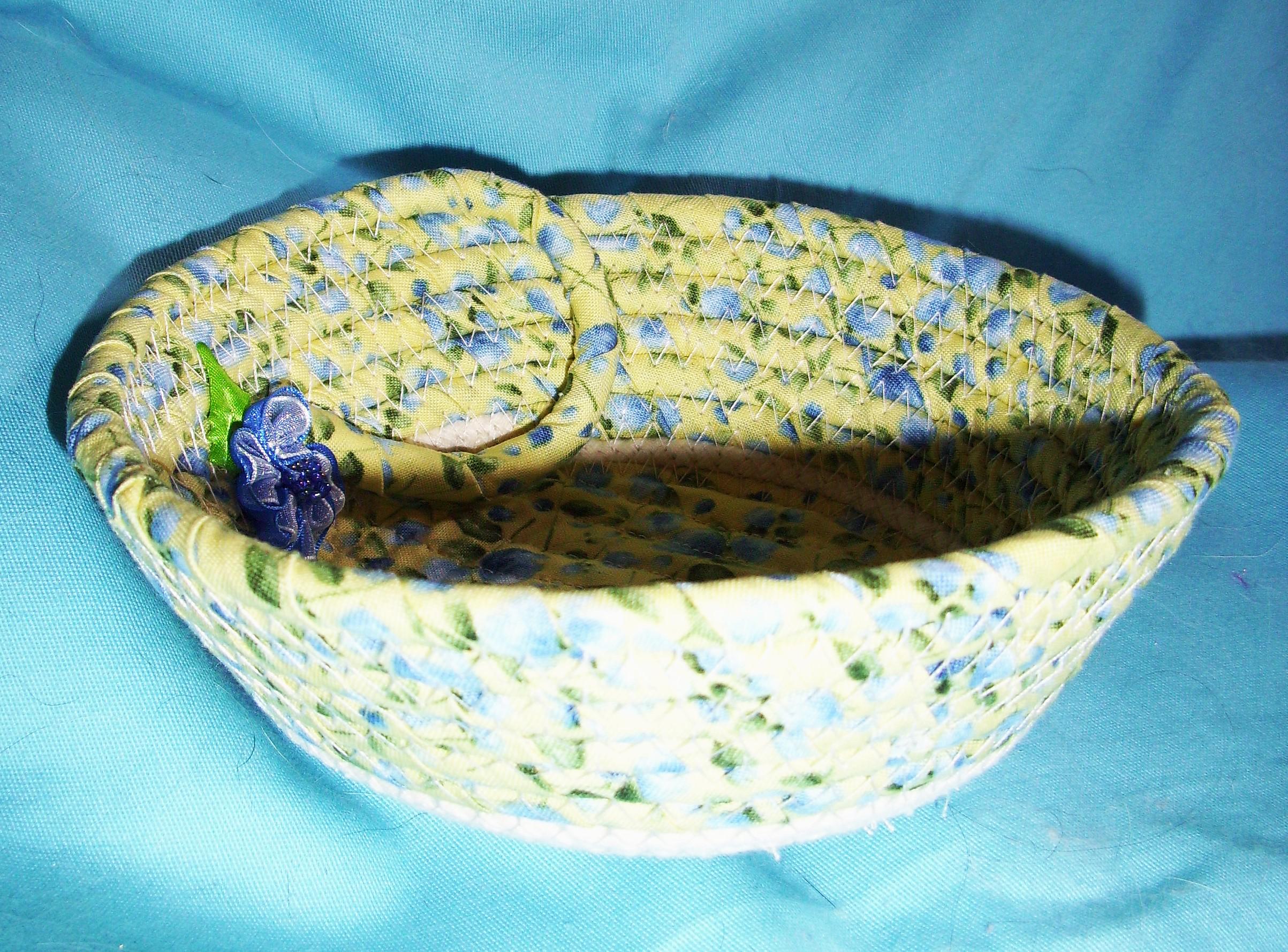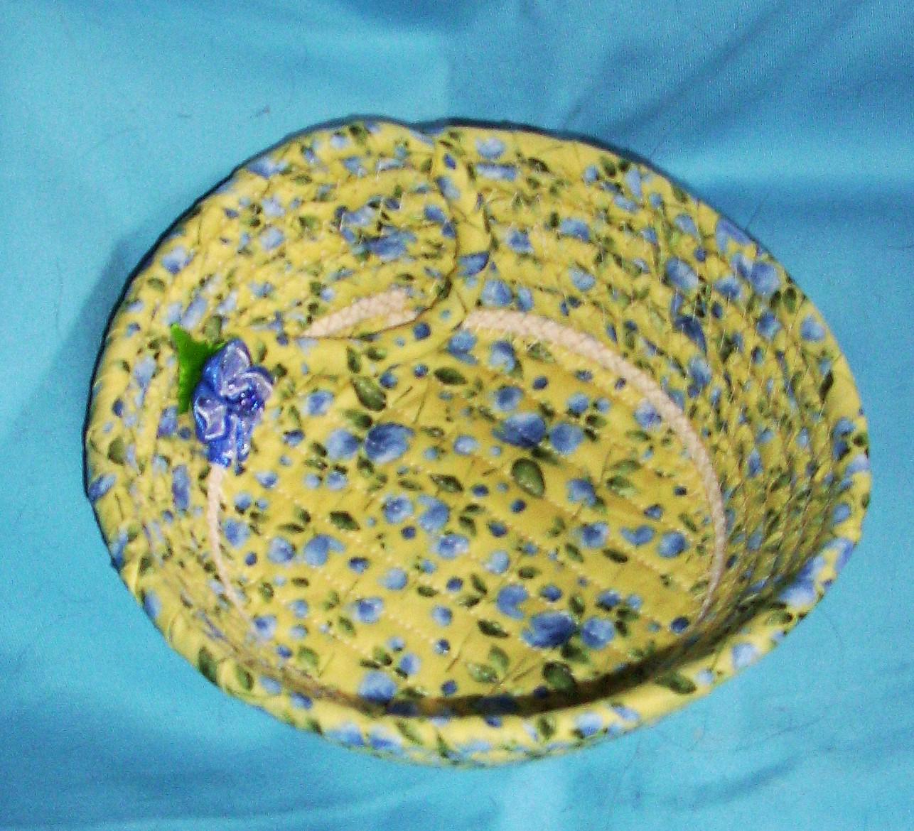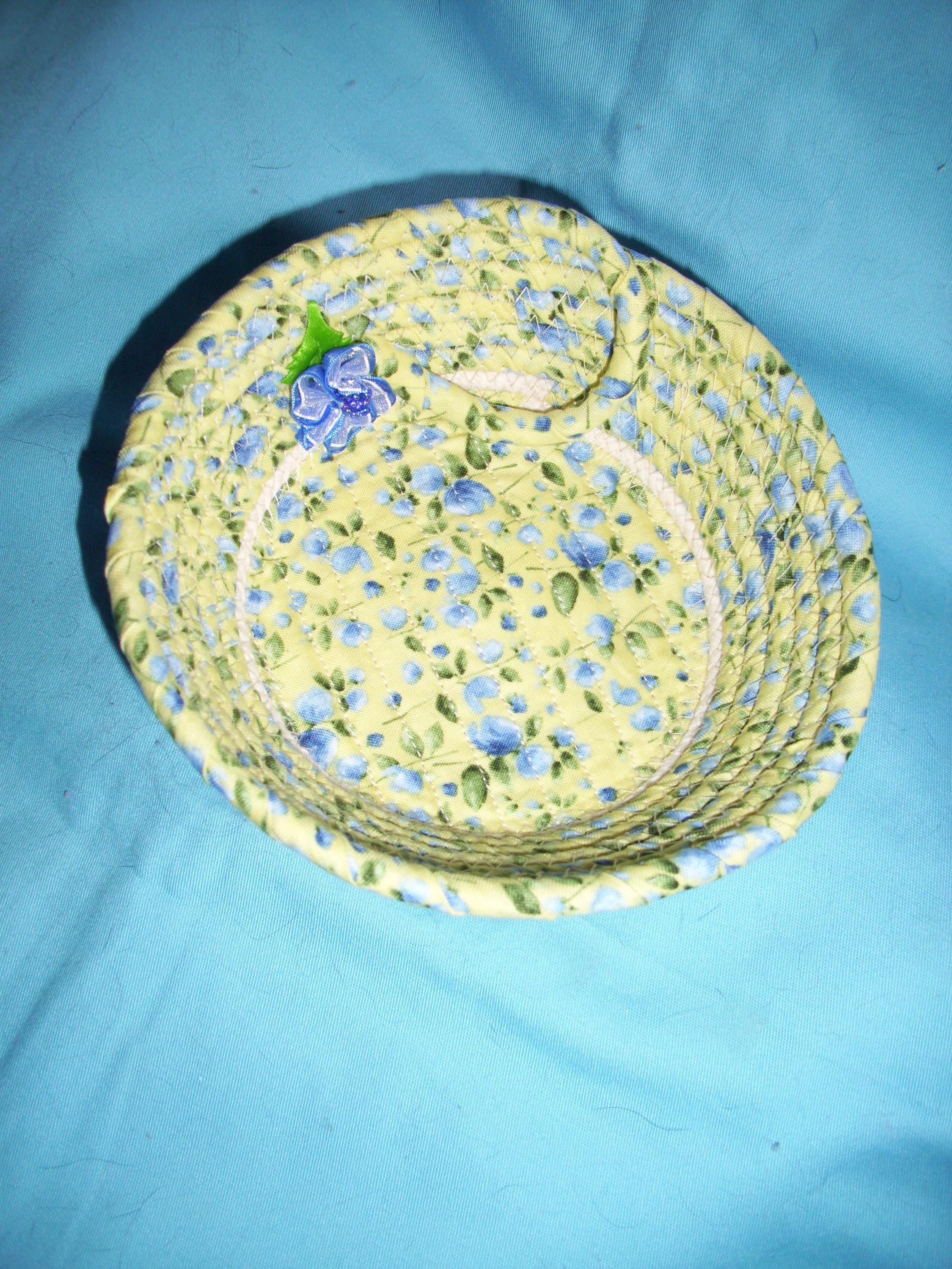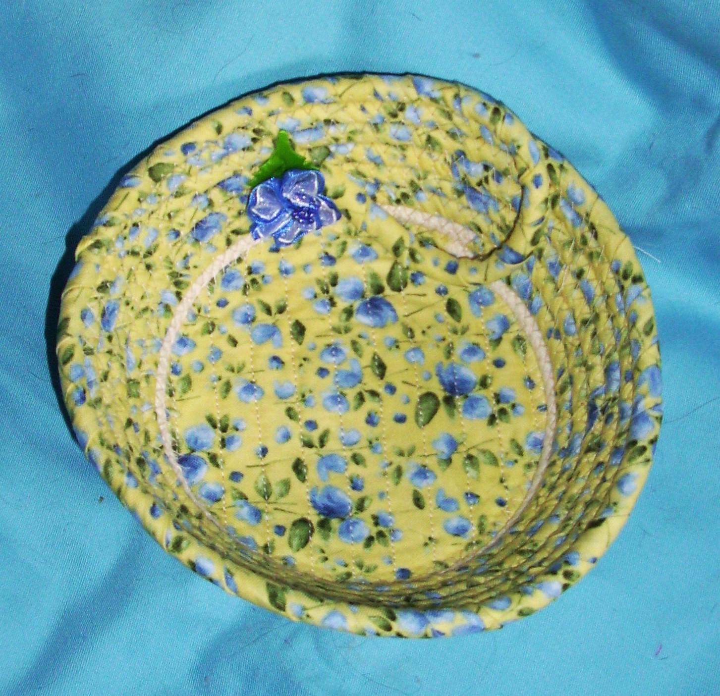 Small, but cute! I have coiled the cotton rope for the base and then covered it with a floral fabric. Channel quilting is added to the top of the base as a finishing touch.