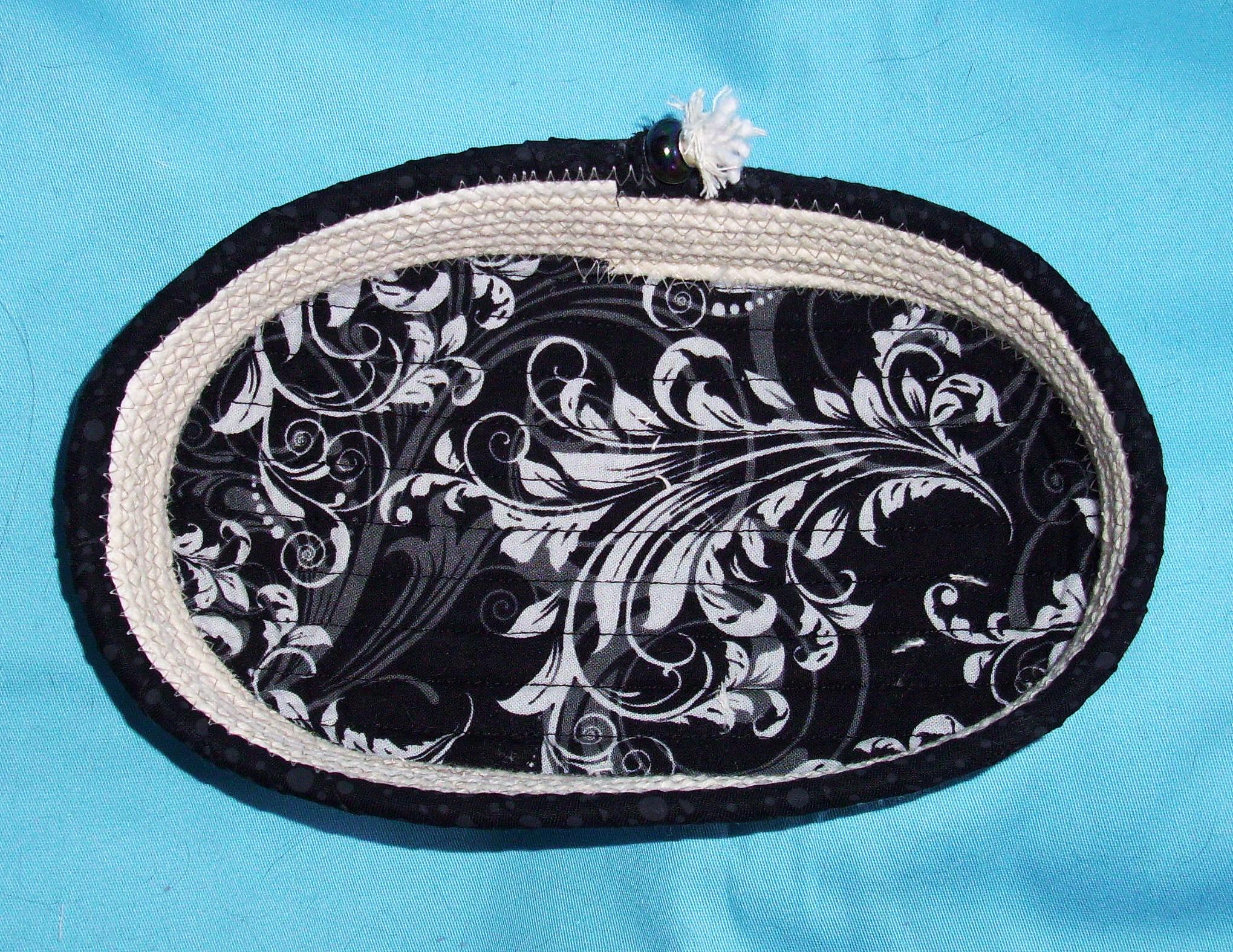 Seven rows of cotton braided rope are zigzagged into place with my home sewing machine. Matching cotton fabric is wrapped around the last upper cord row and a porcelain black bead is held into place at the end of the cord by fraying it.