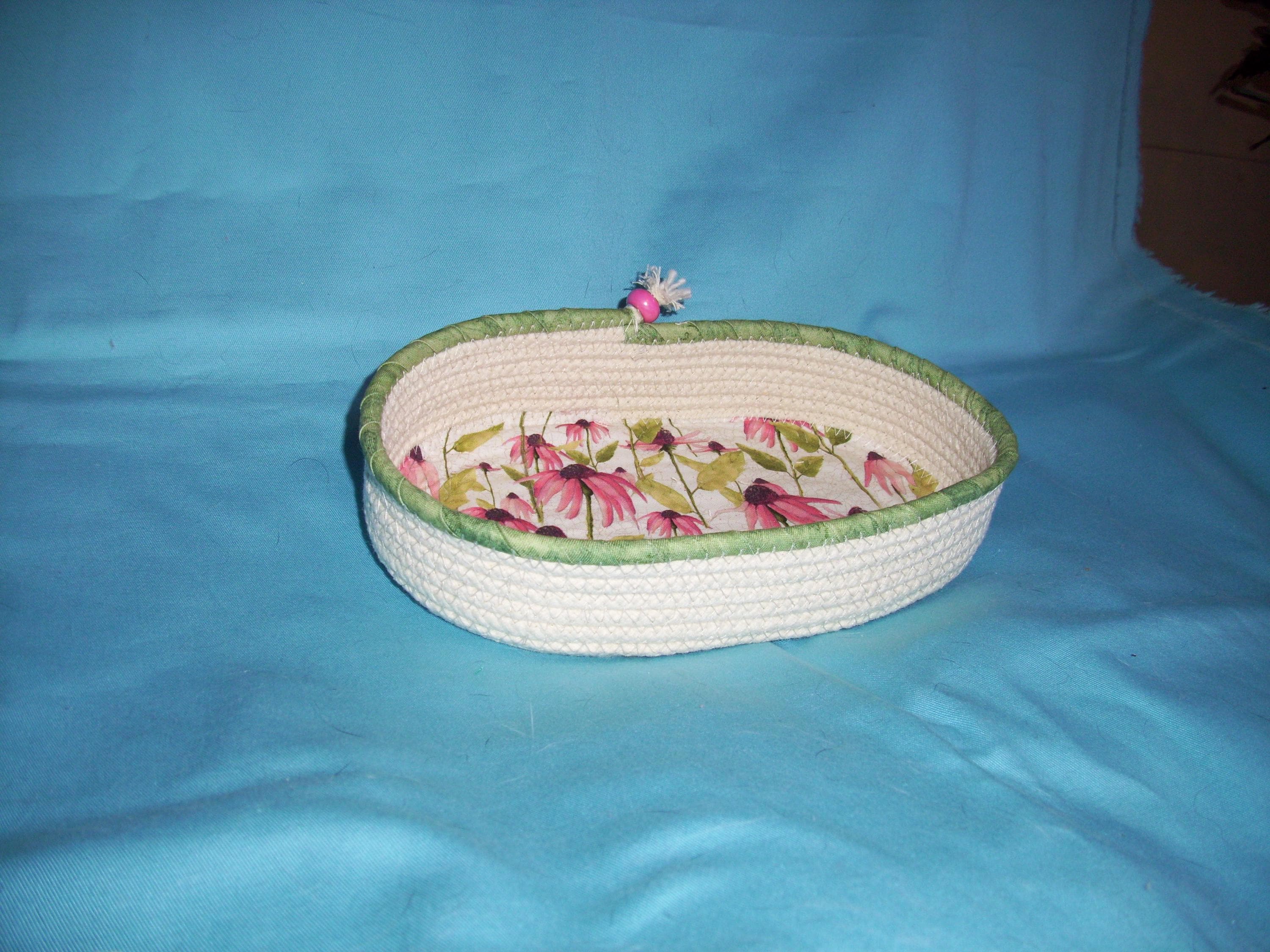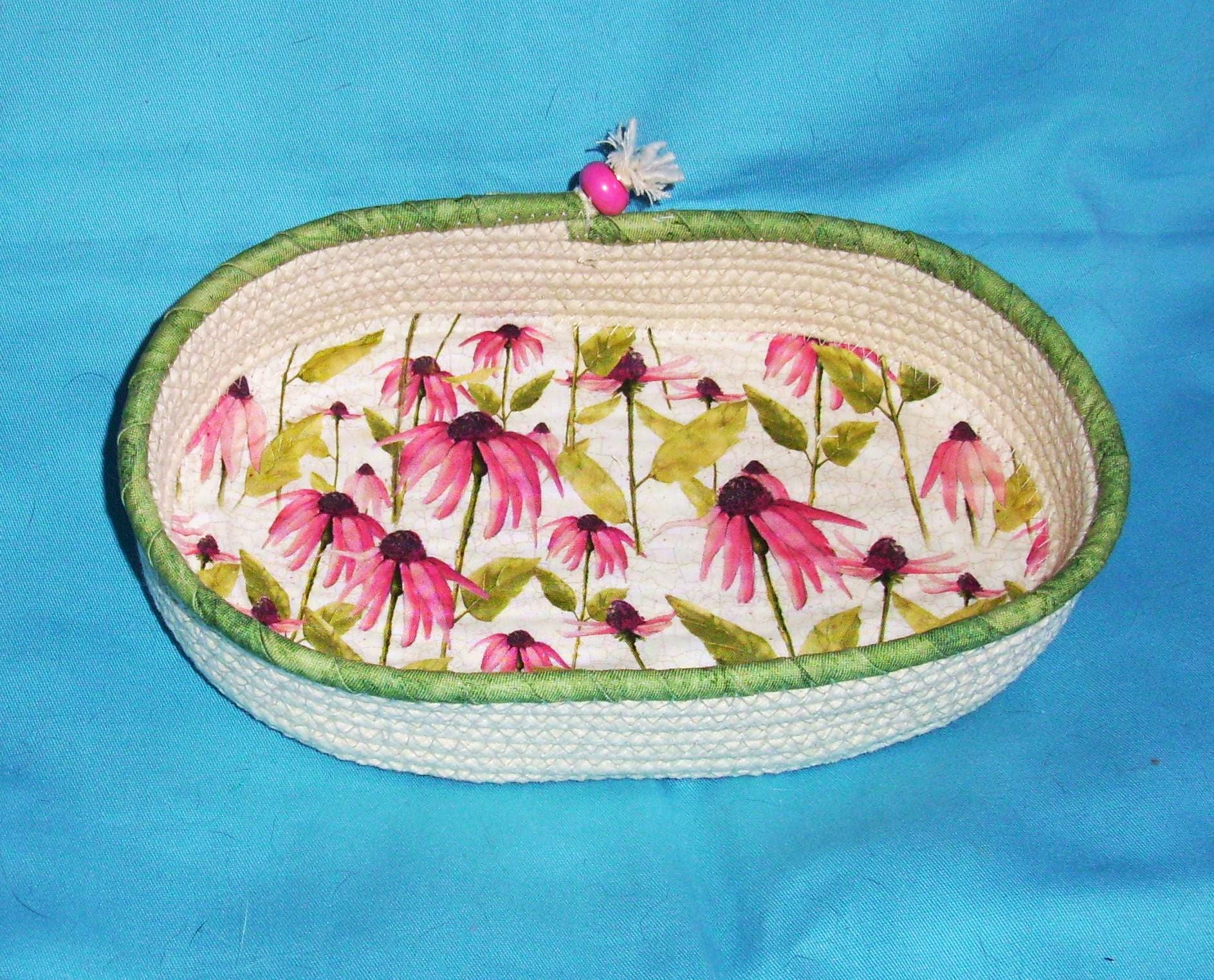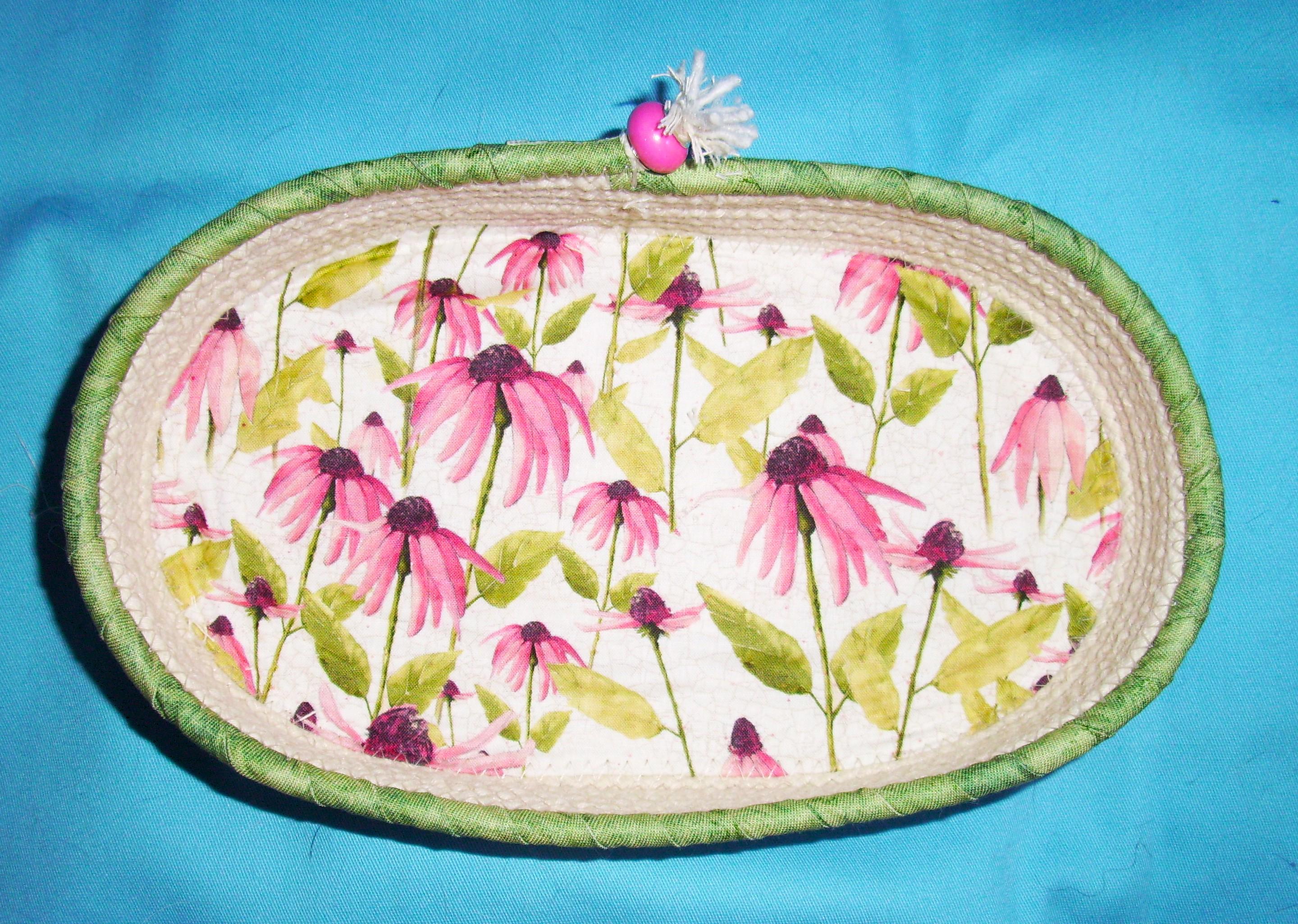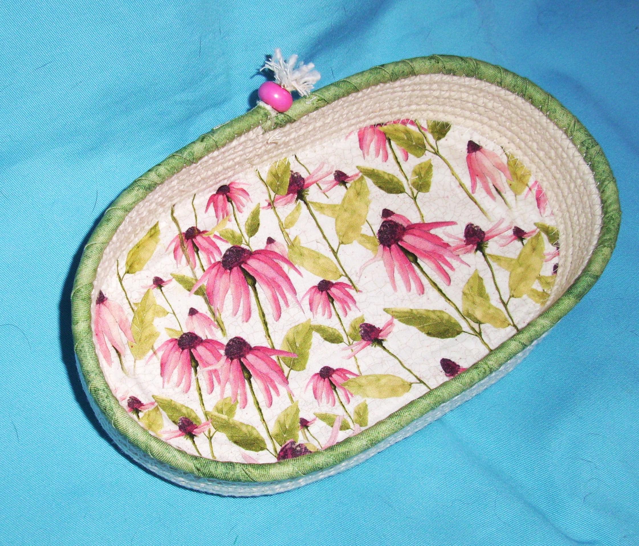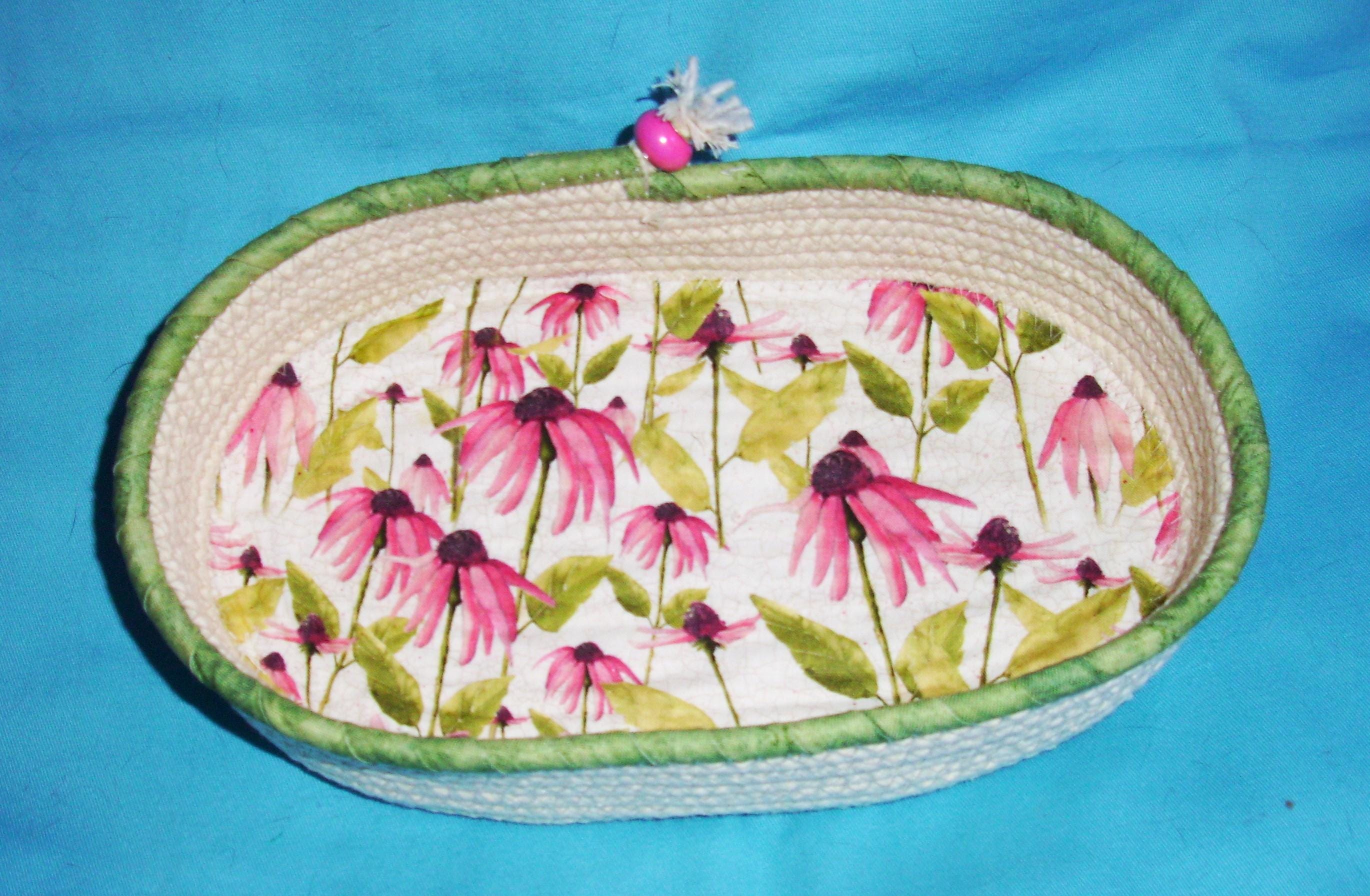 Bright colorful coneflower cotton print fabric is channel quilted to the base of the bowl, giving it a nice textured look. The top round of cord is hand wrapped with a spring green fabric and stitched into place. A pretty pink porcelain bead tops off the cord ending as a finishing touch.