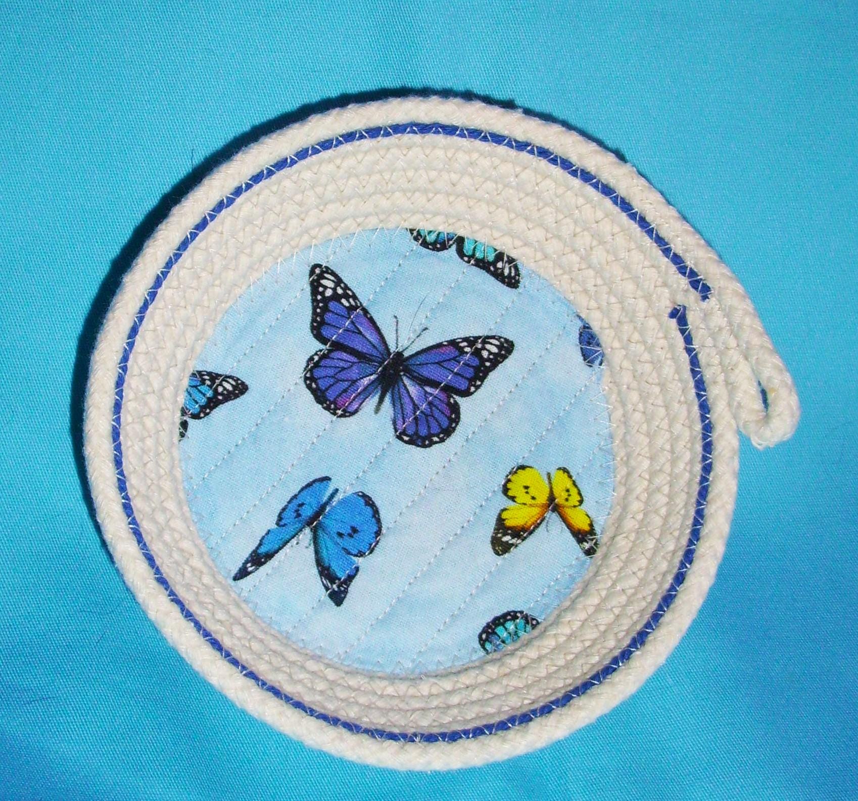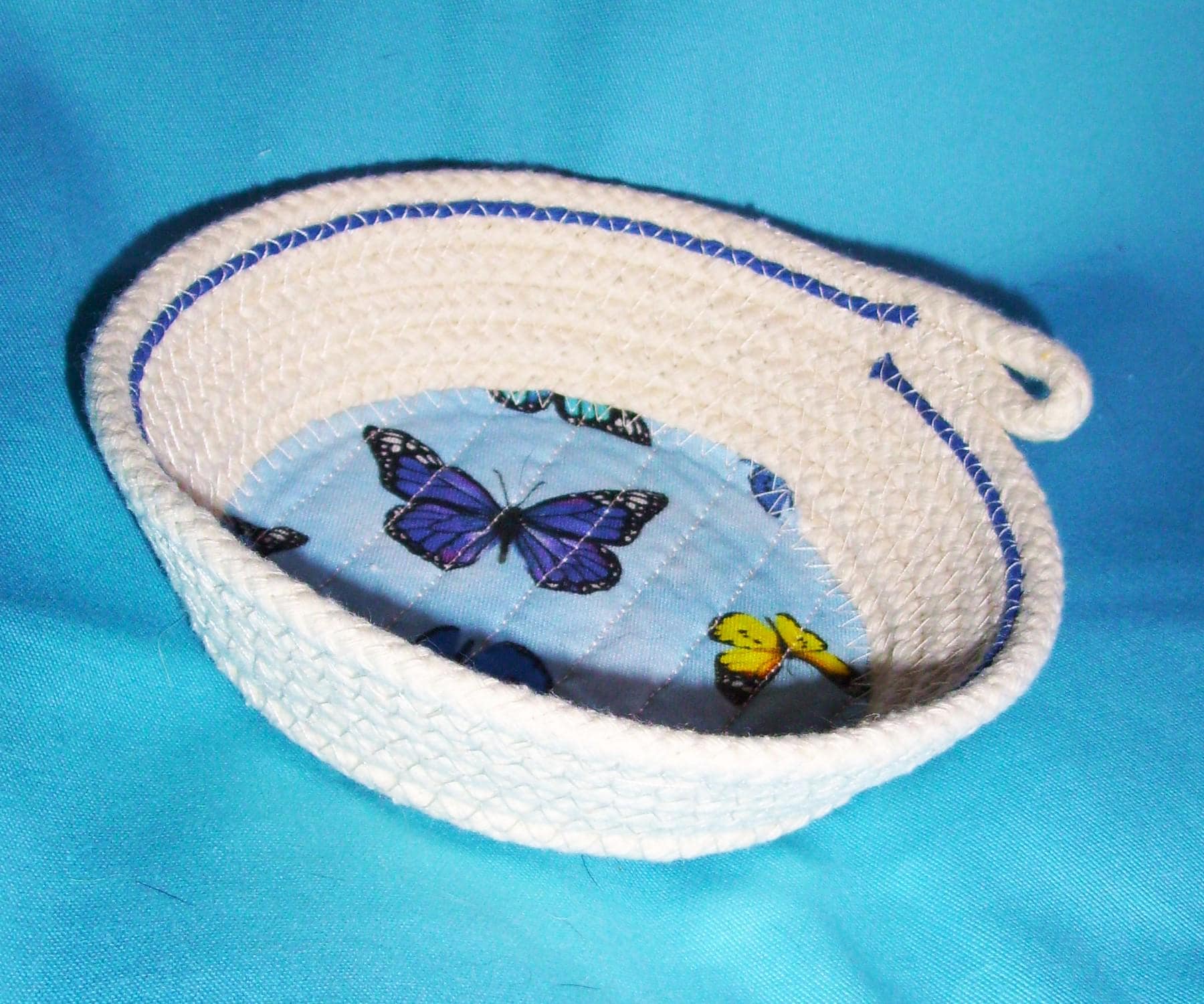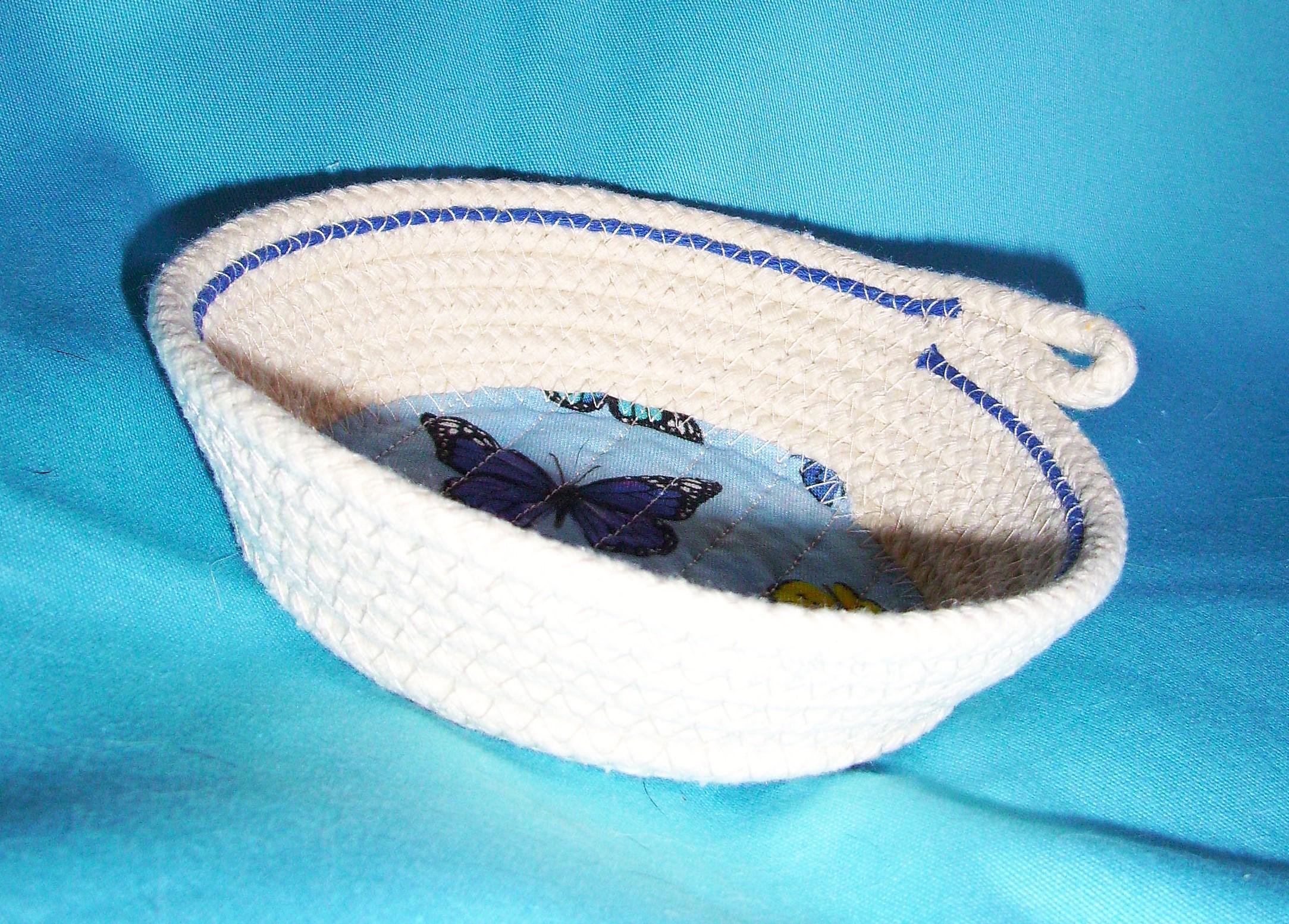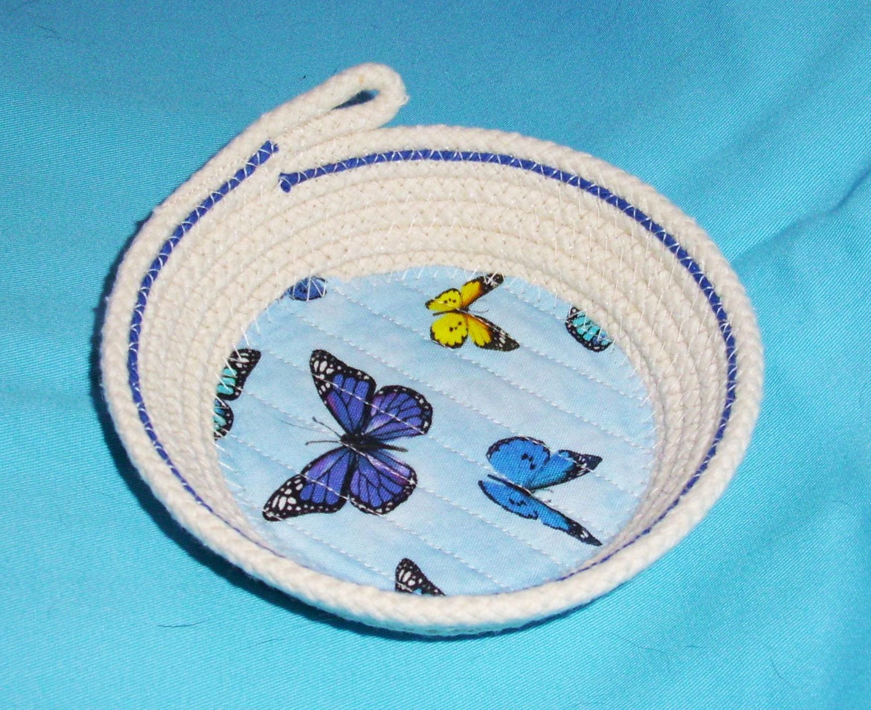 I take great pride in making my bowls. I channel quilt the fabric to the base to prevent puckering. I place a bright blue cotton cord towards the inner top of this cute bowl to finish off the design. I use cotton thread in a zigzag stitch to make the coiled side of the bowl. No glue is used.