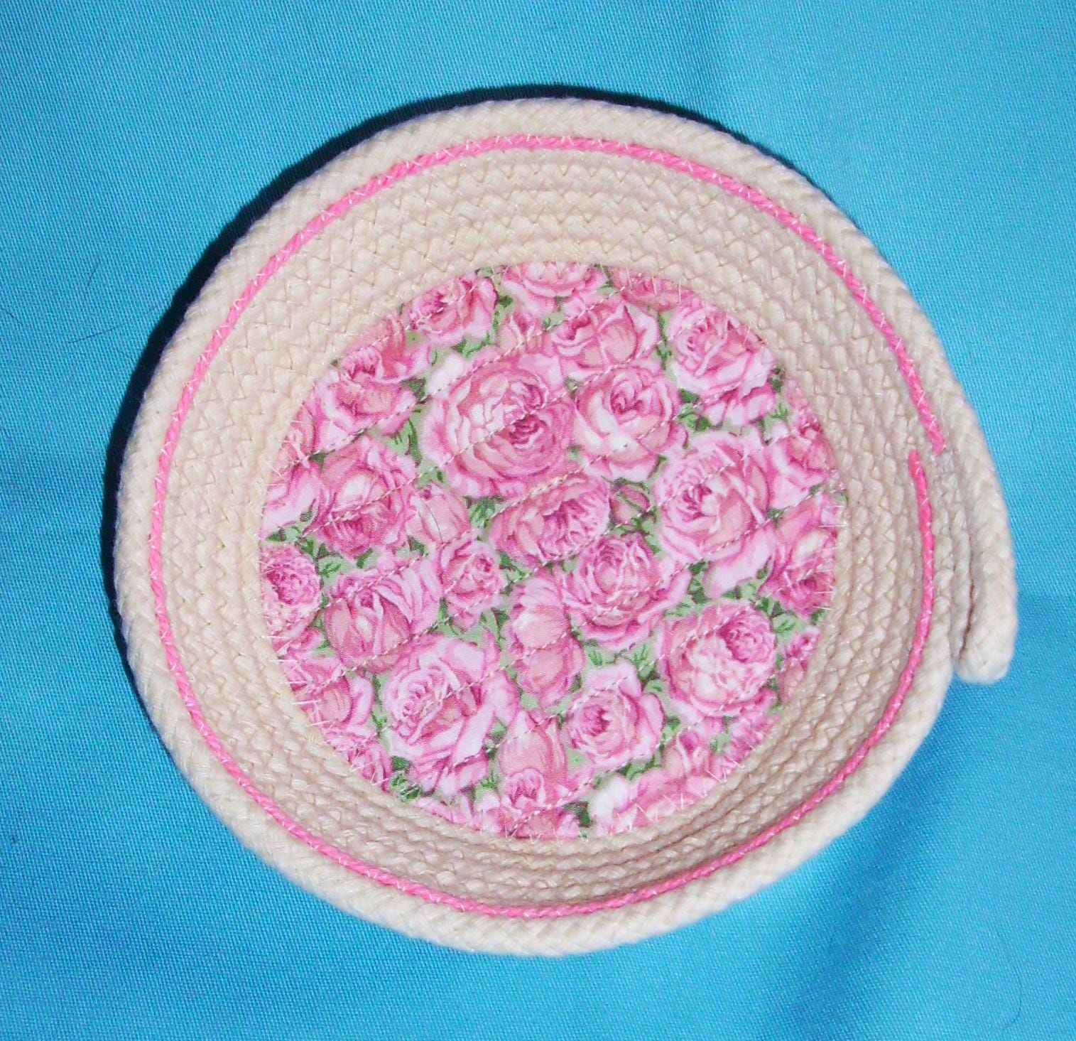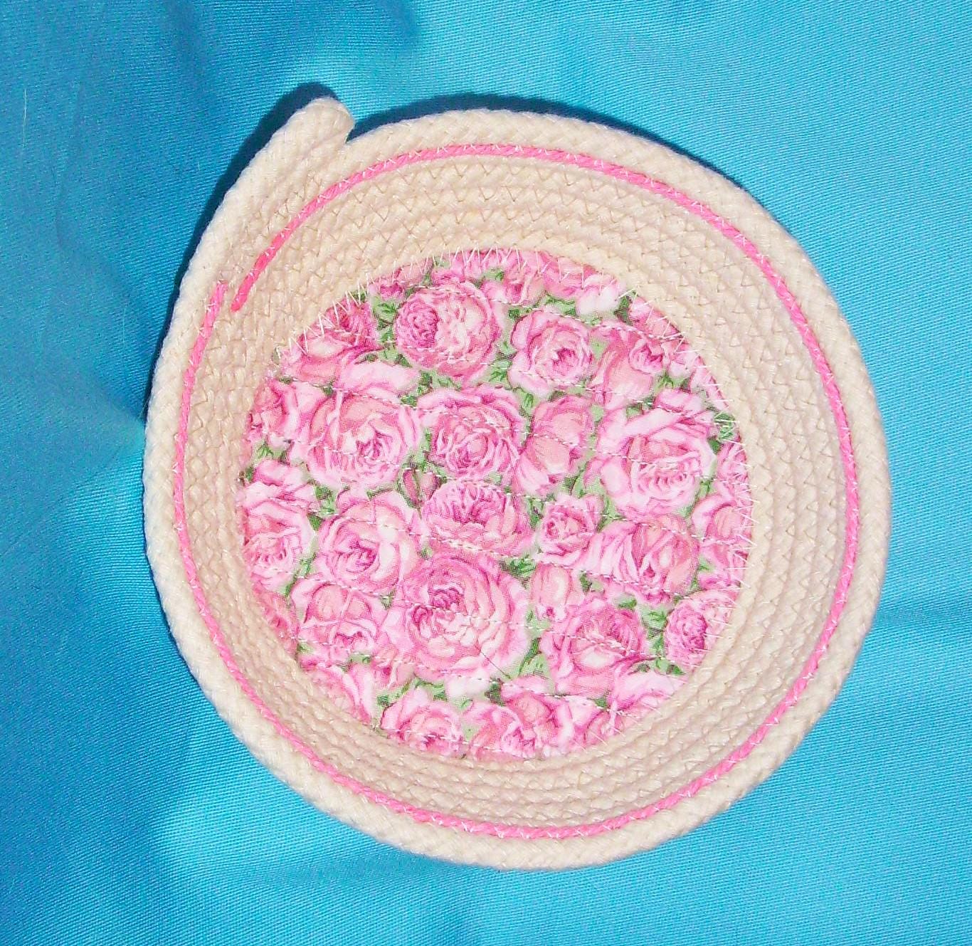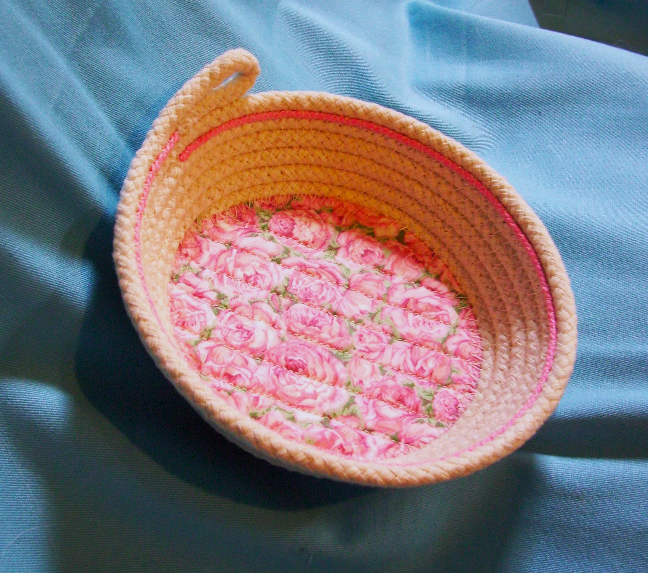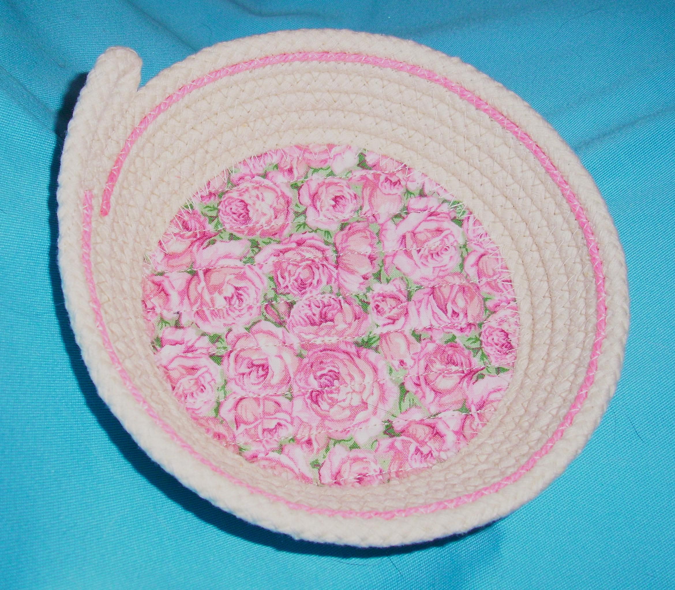 Old fashioned rose fabric in the bottom of this rope bowl makes a pretty gift for that special person. I have channel quilted the roses to give it more stability.