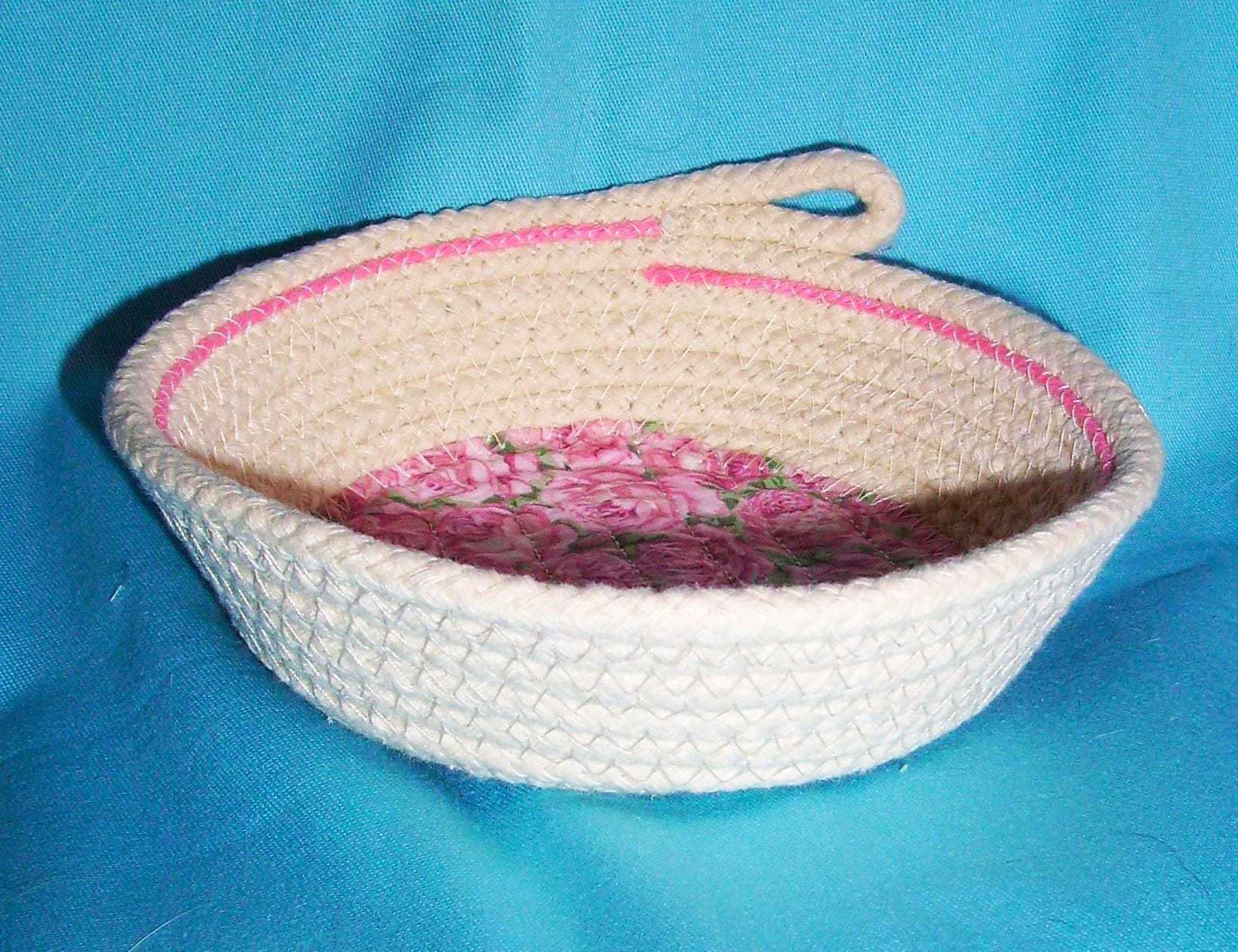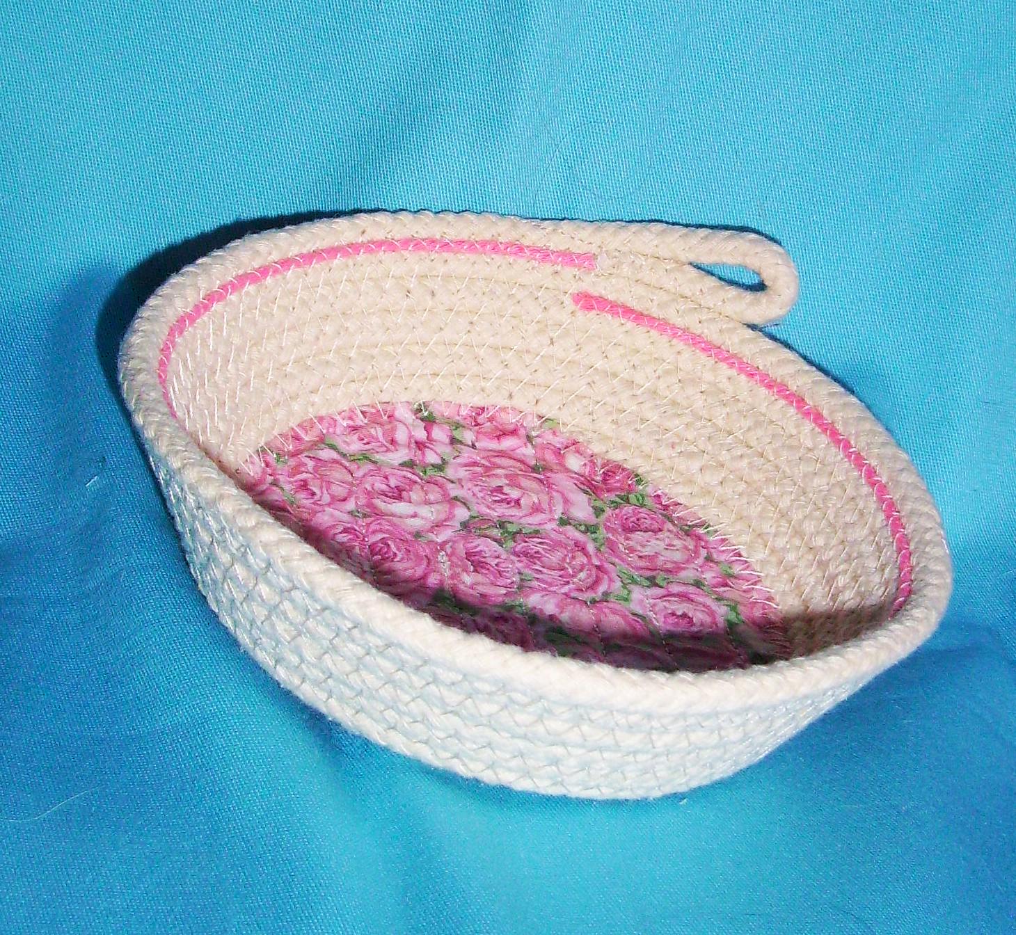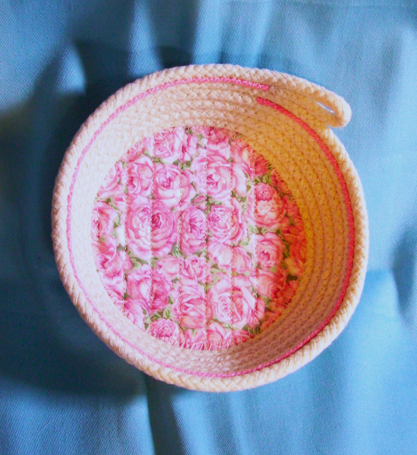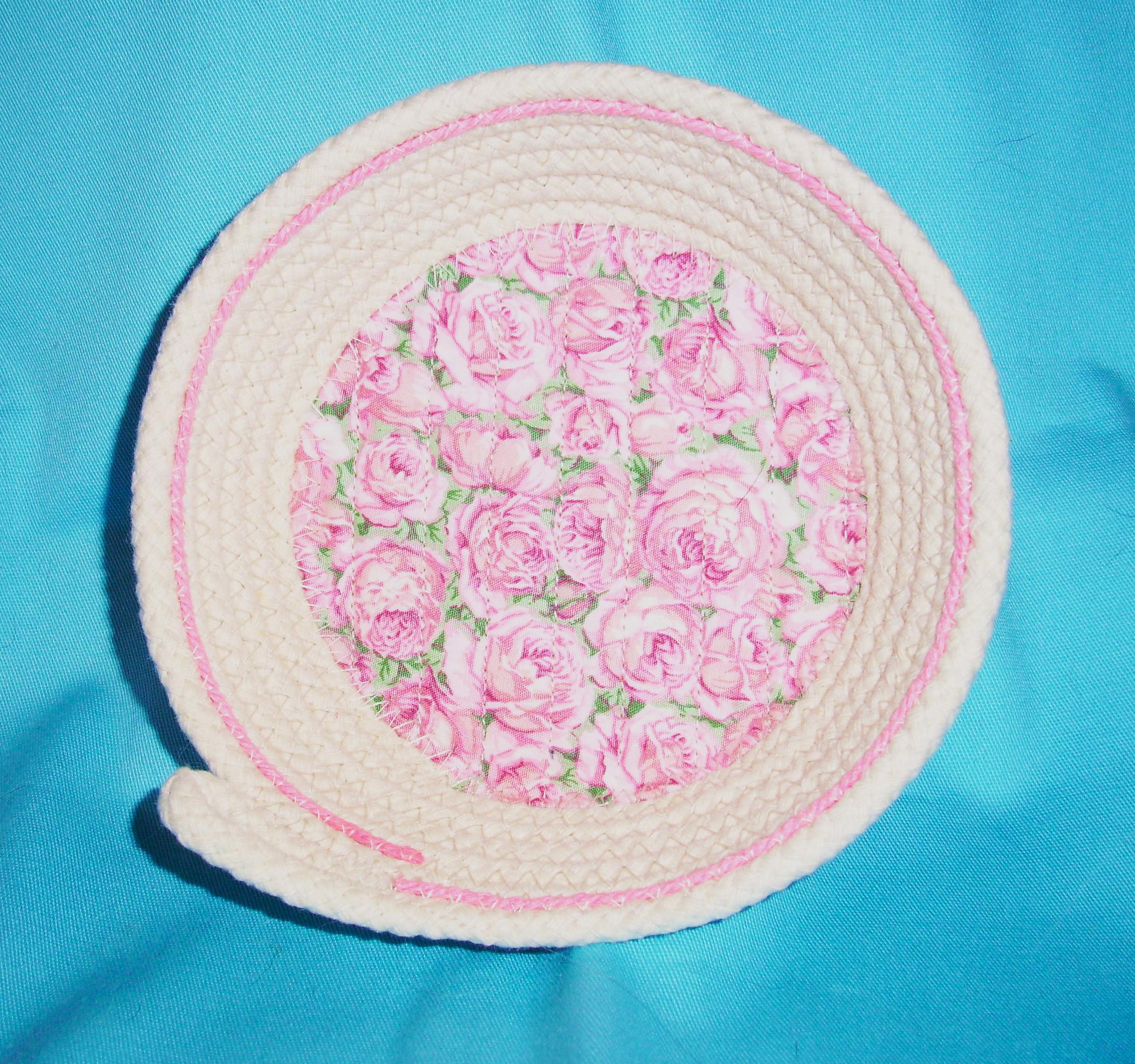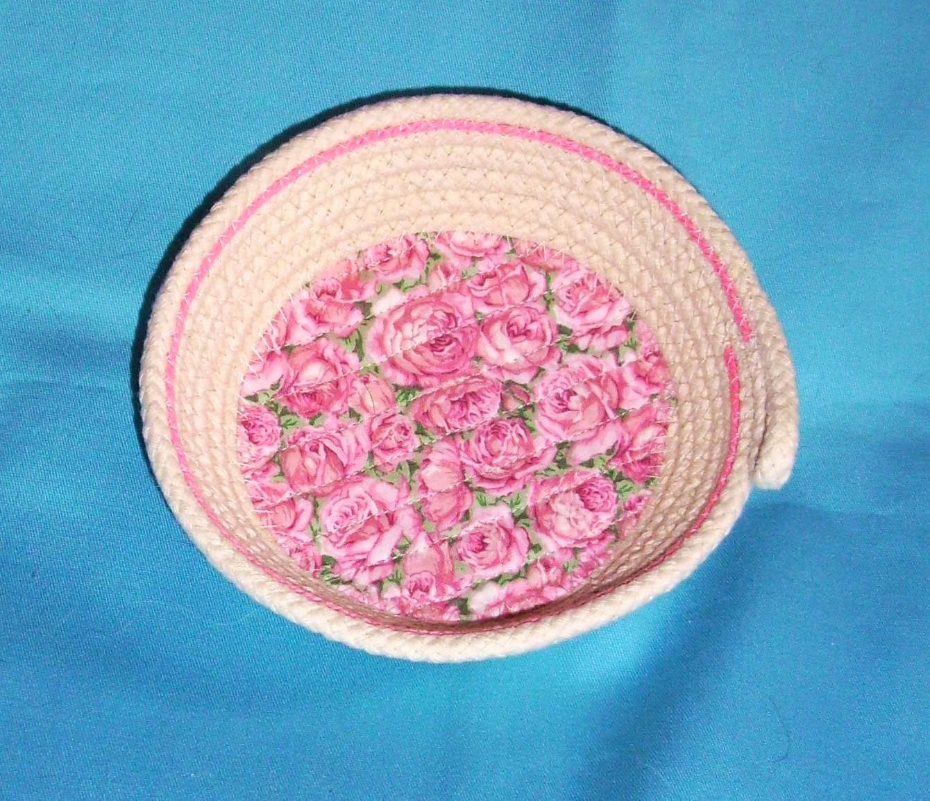 Old fashioned rose fabric in the bottom of this rope bowl makes a pretty gift for that special person. I have channel quilted the roses to give it more stability.