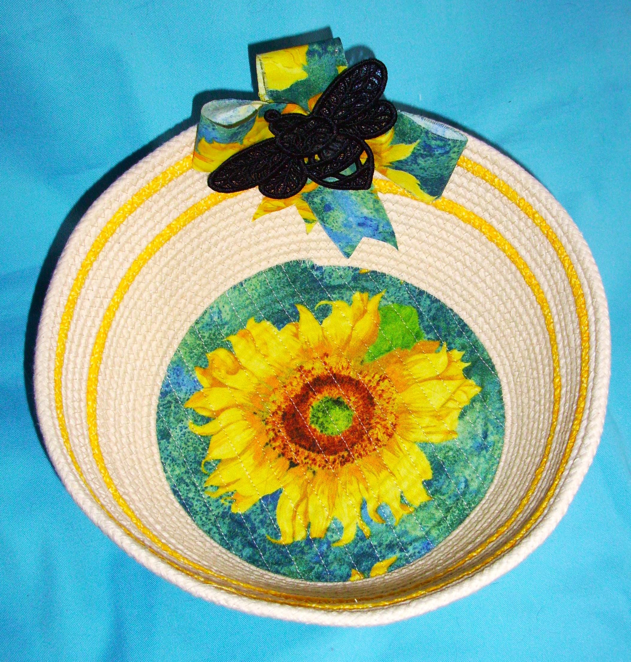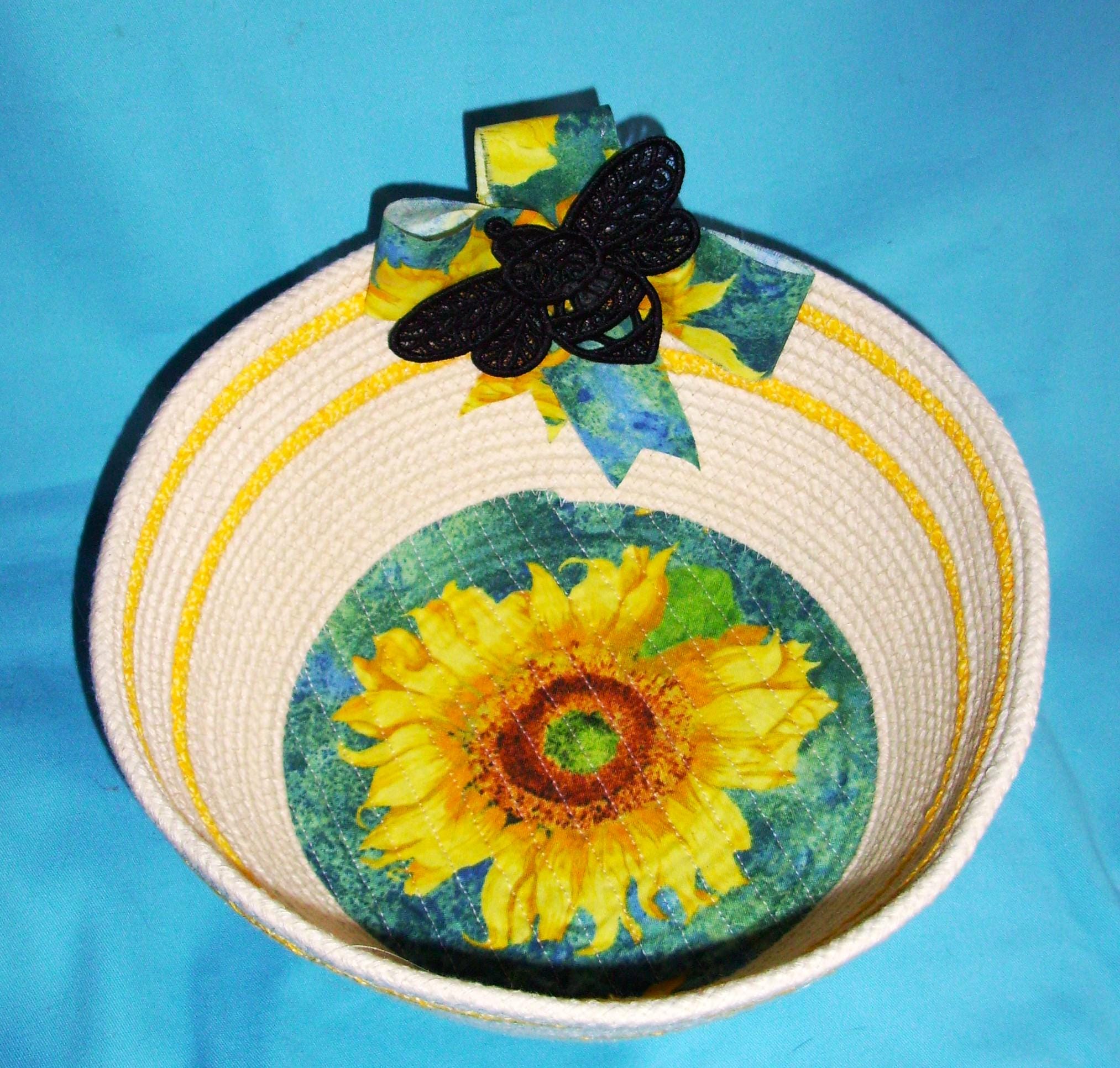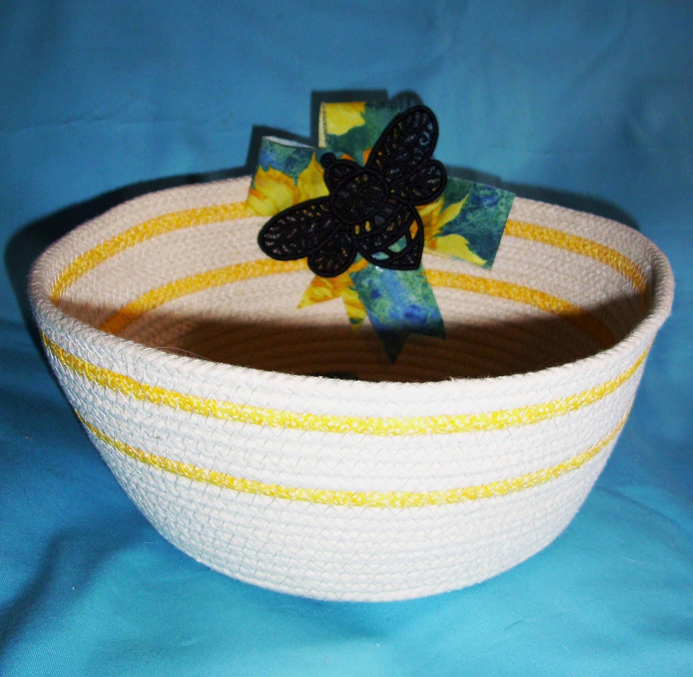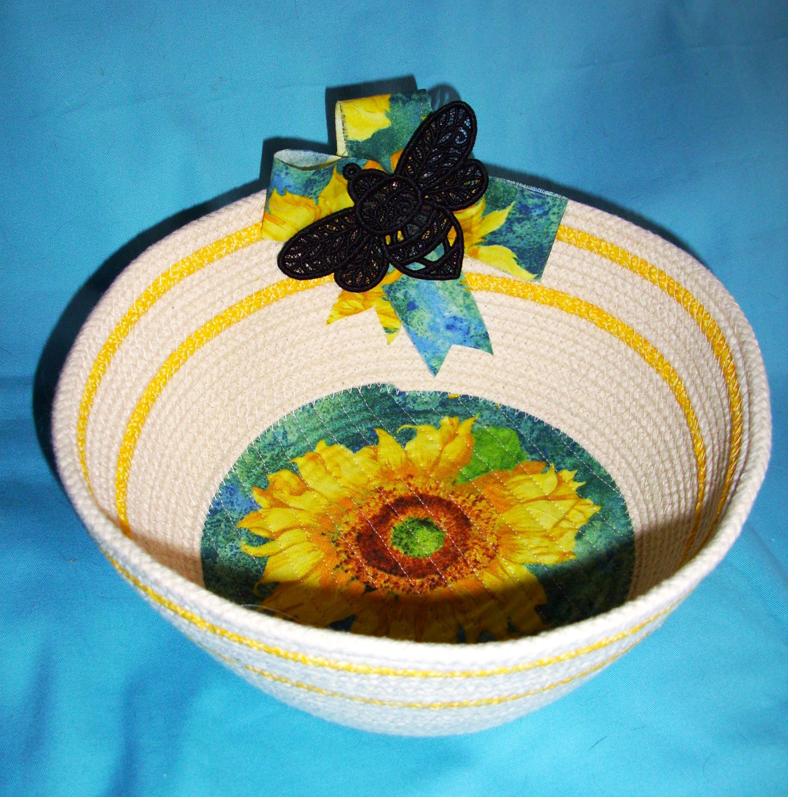 Sunflower Bee Medium Basket SIZE: 9" rim, 6 1/2" base, 4" deep