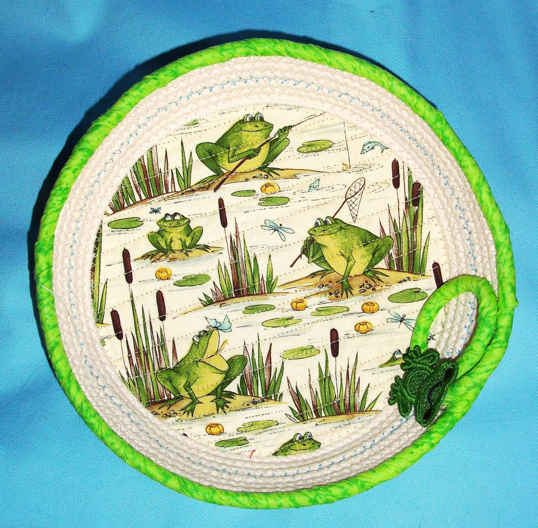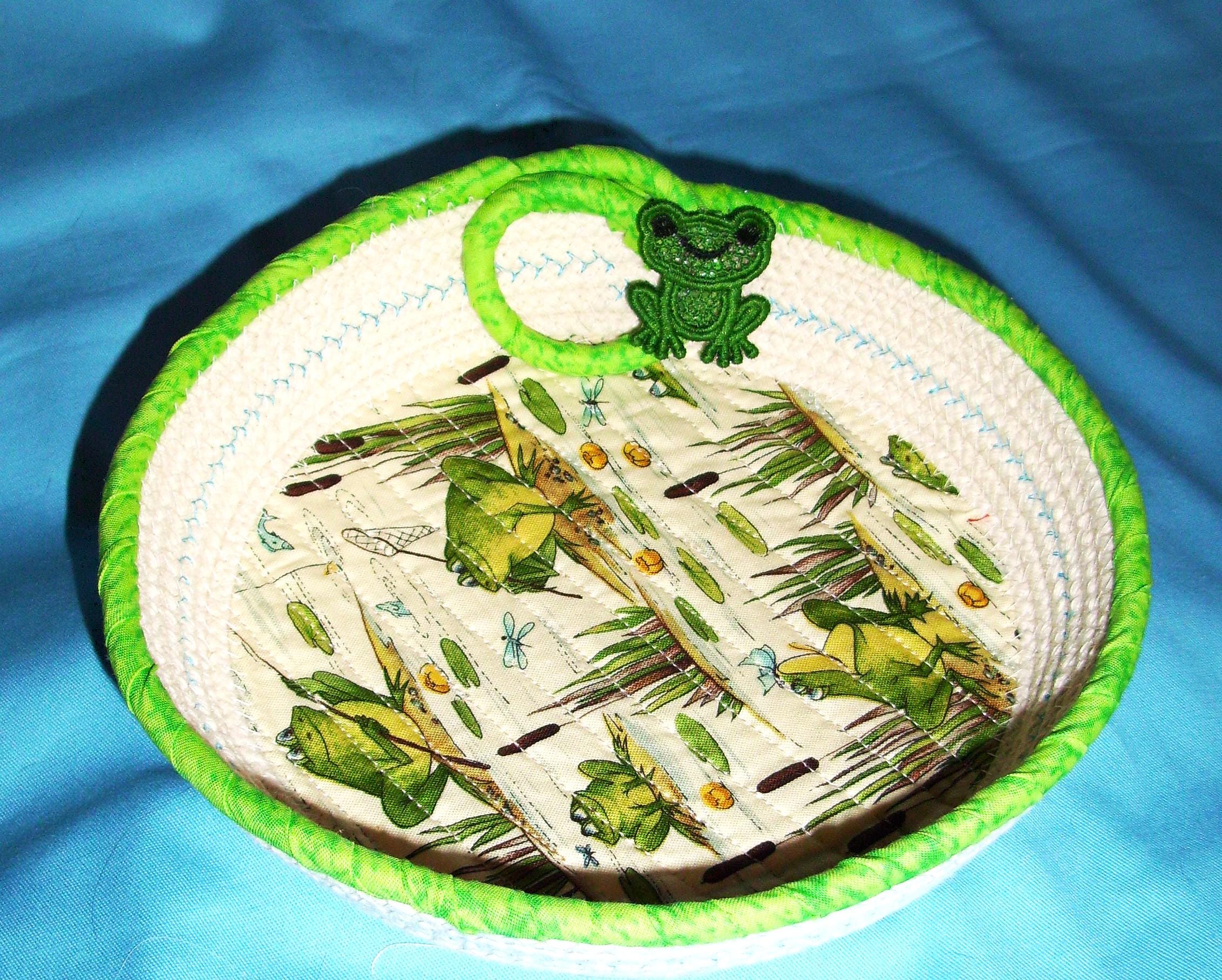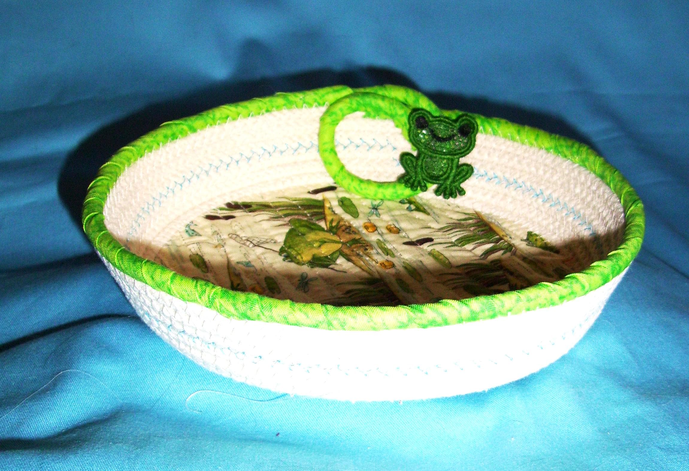 I have channel stitched the fabric to the cord base to give it a quilted look. The little green frog was made out of thread and then stiffened. It was made on my home embroidery machine.