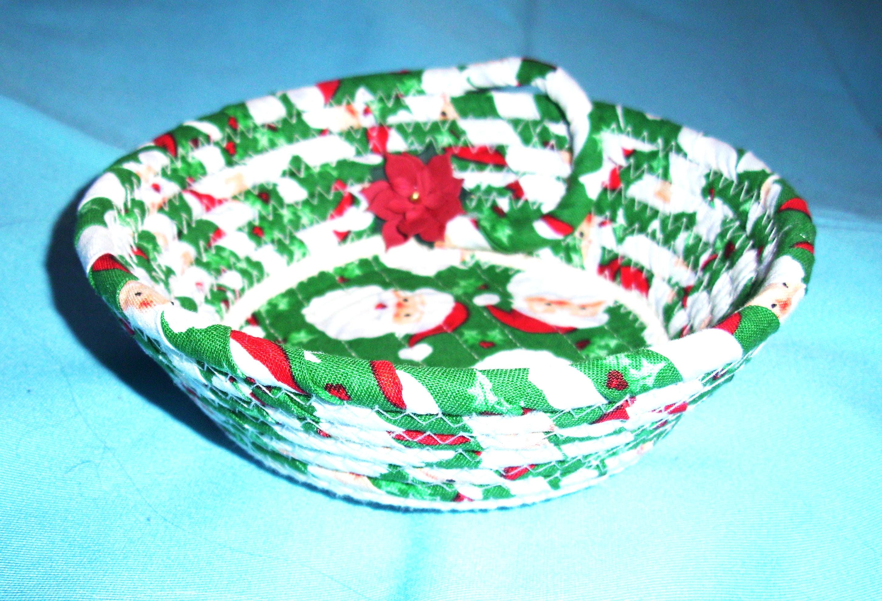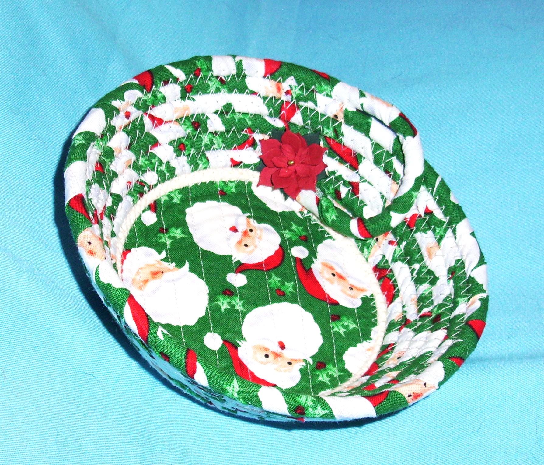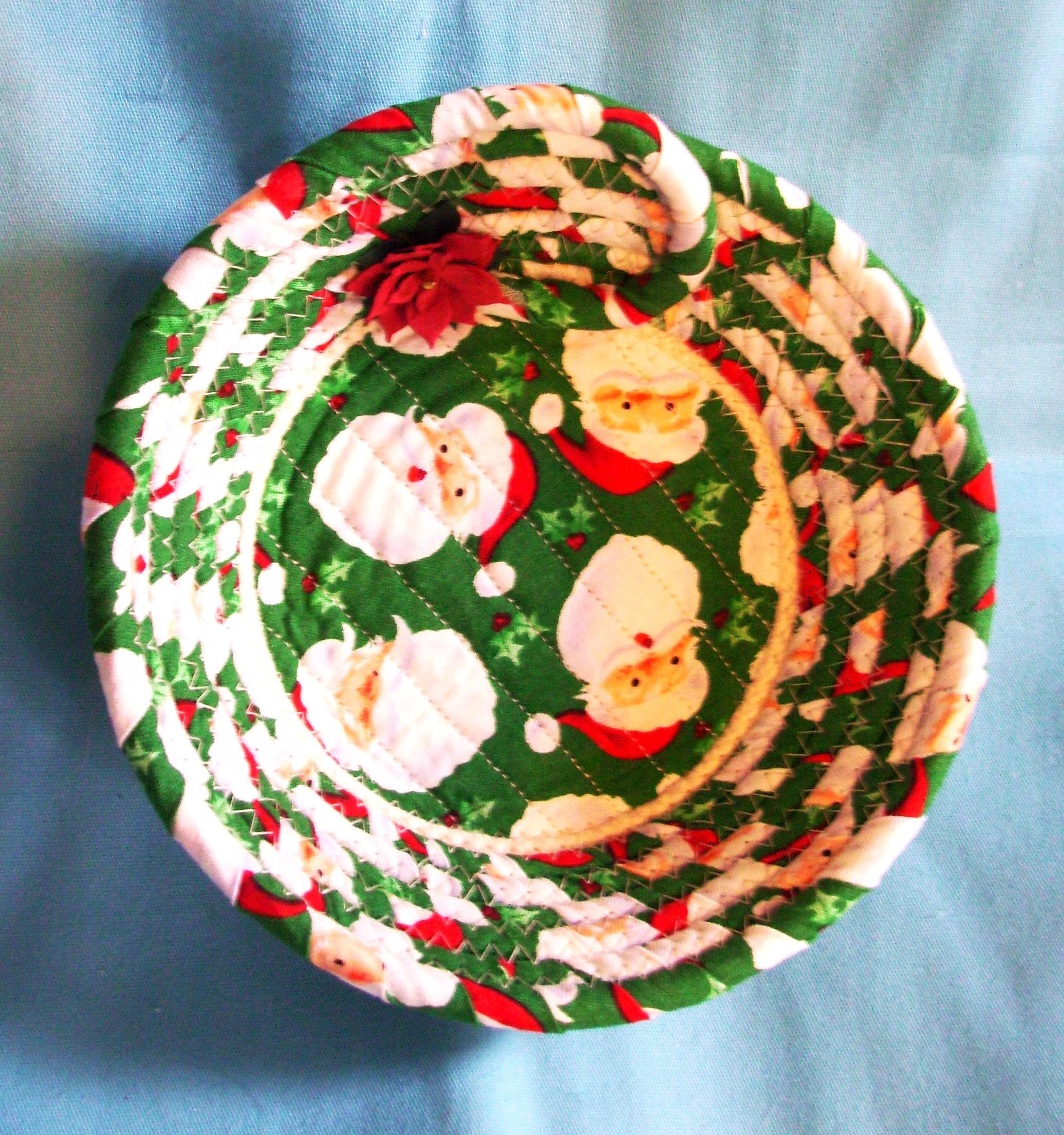 I hand wrap with fabric and then coil the cord into the shape of a bowl. I use my sewing machine to zigzag stitch it together. I have topped it off with a stiff fabric poinsettia.
