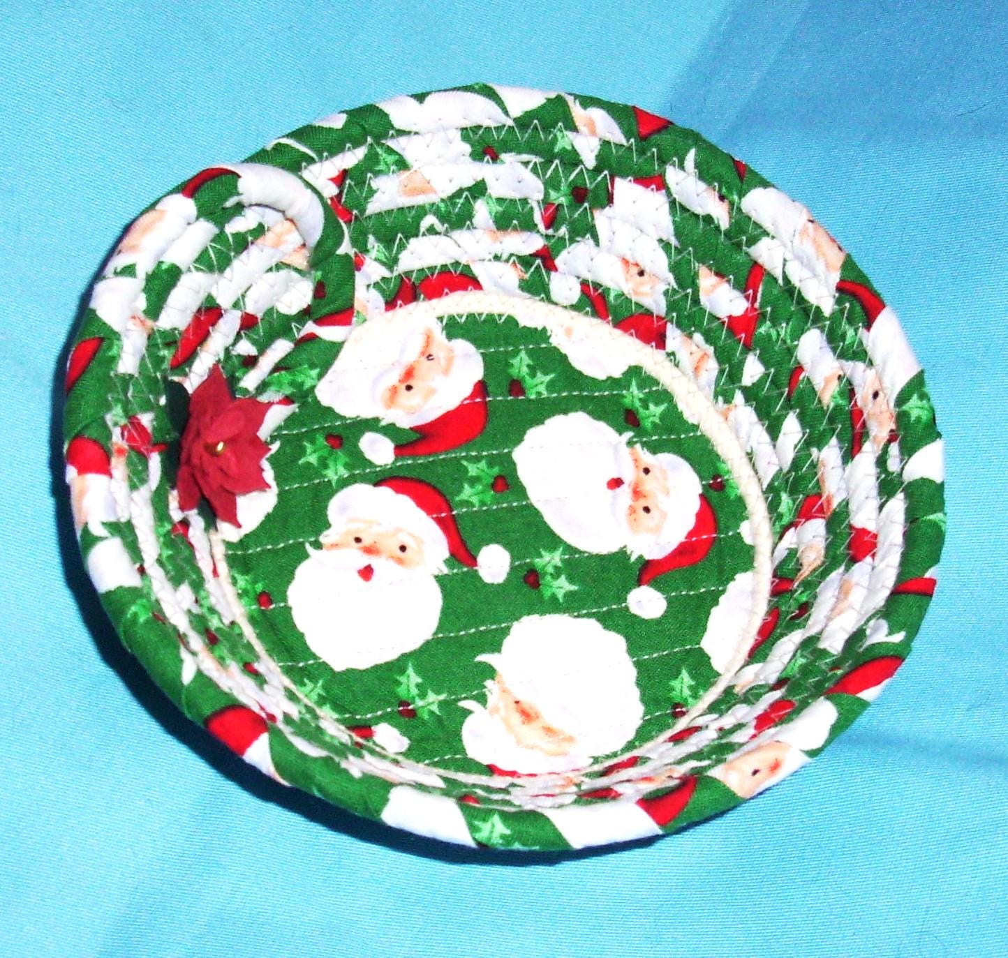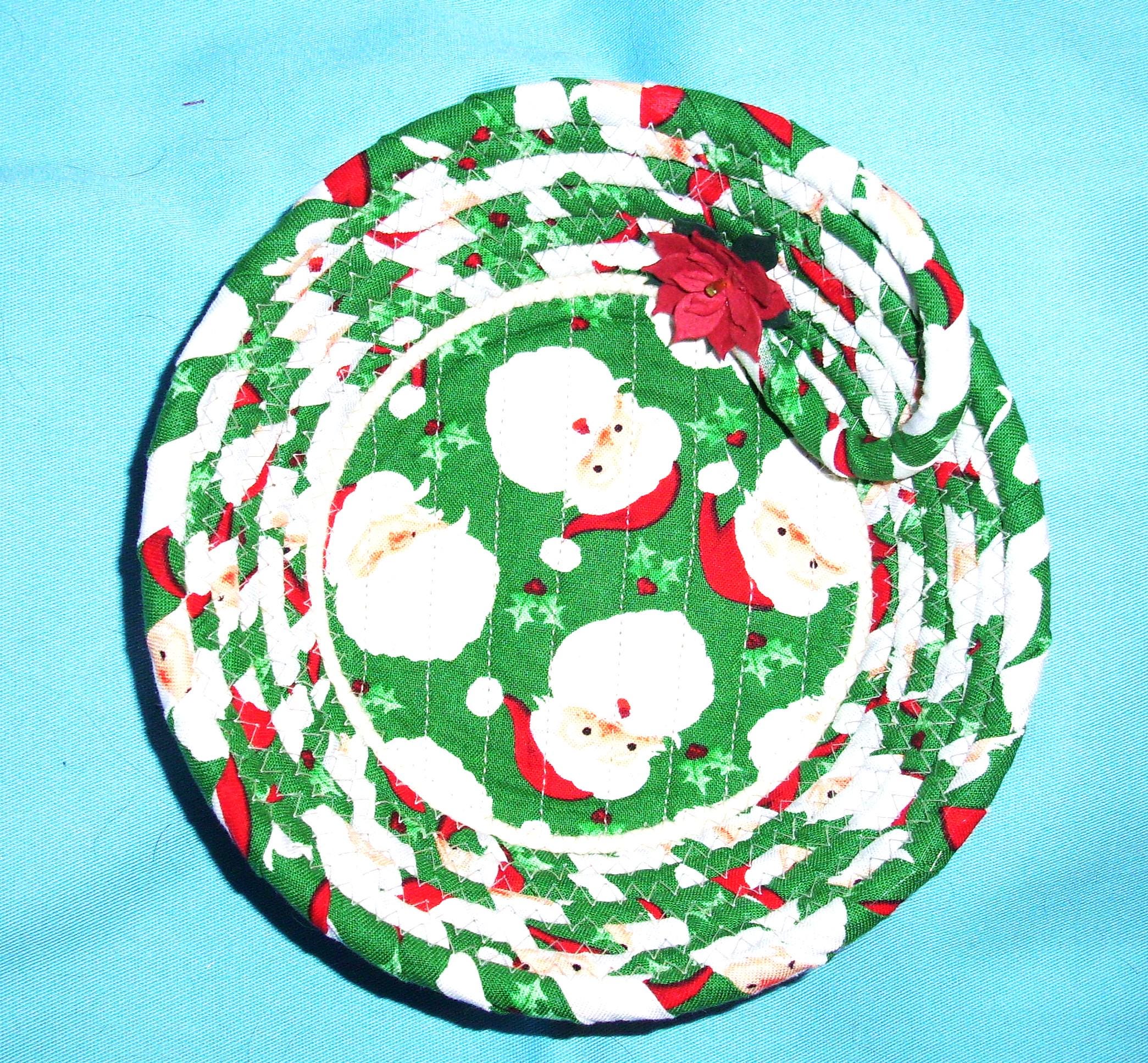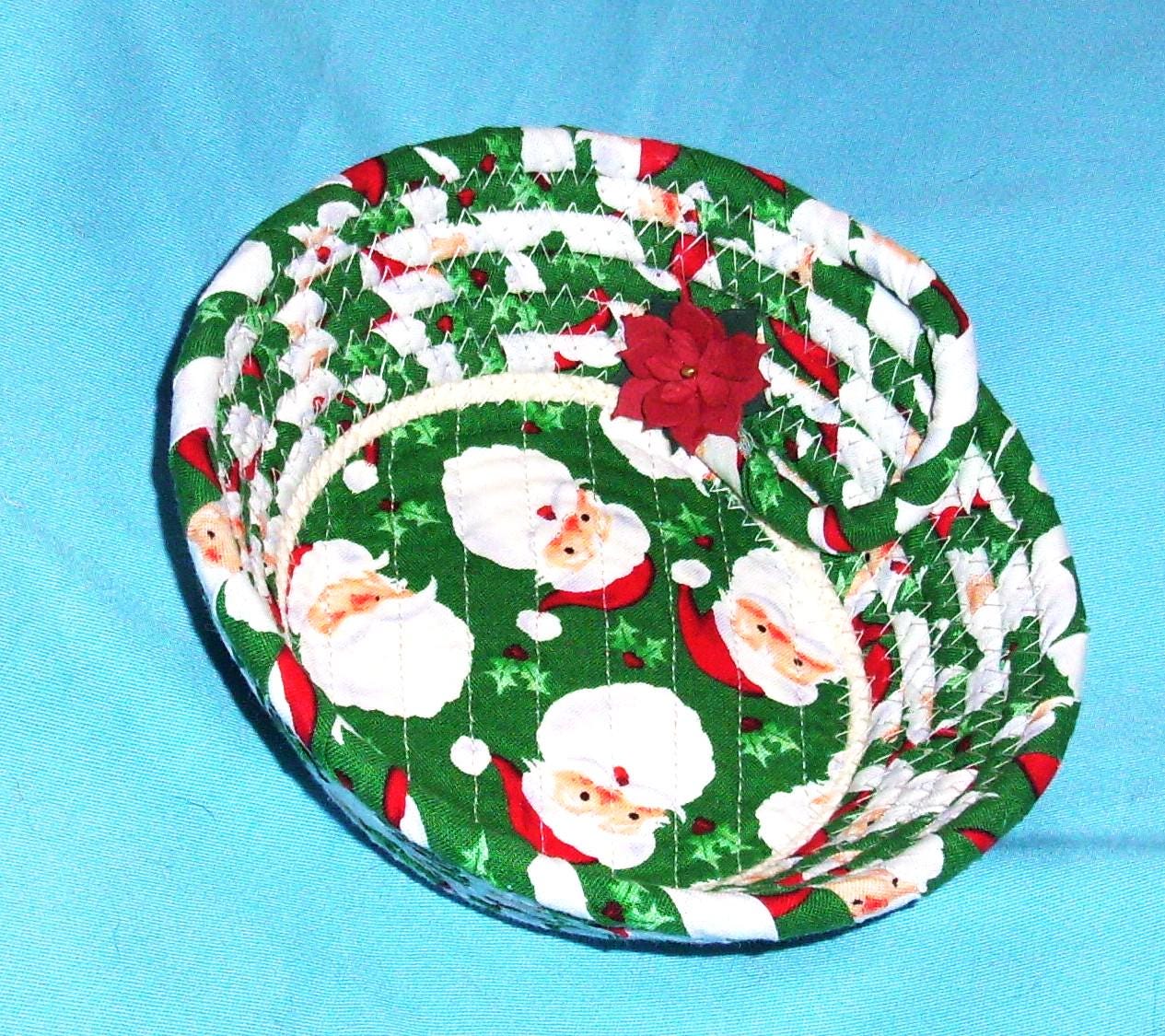 I hand wrap with fabric and then coil the cord into the shape of a bowl. I use my sewing machine to zigzag stitch it together. I have topped it off with a stiff fabric poinsettia.
