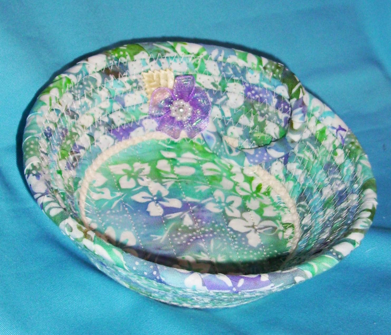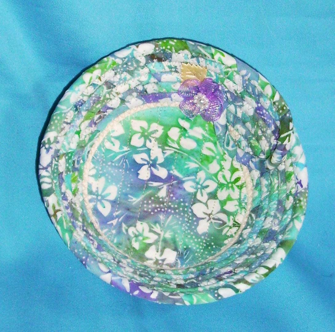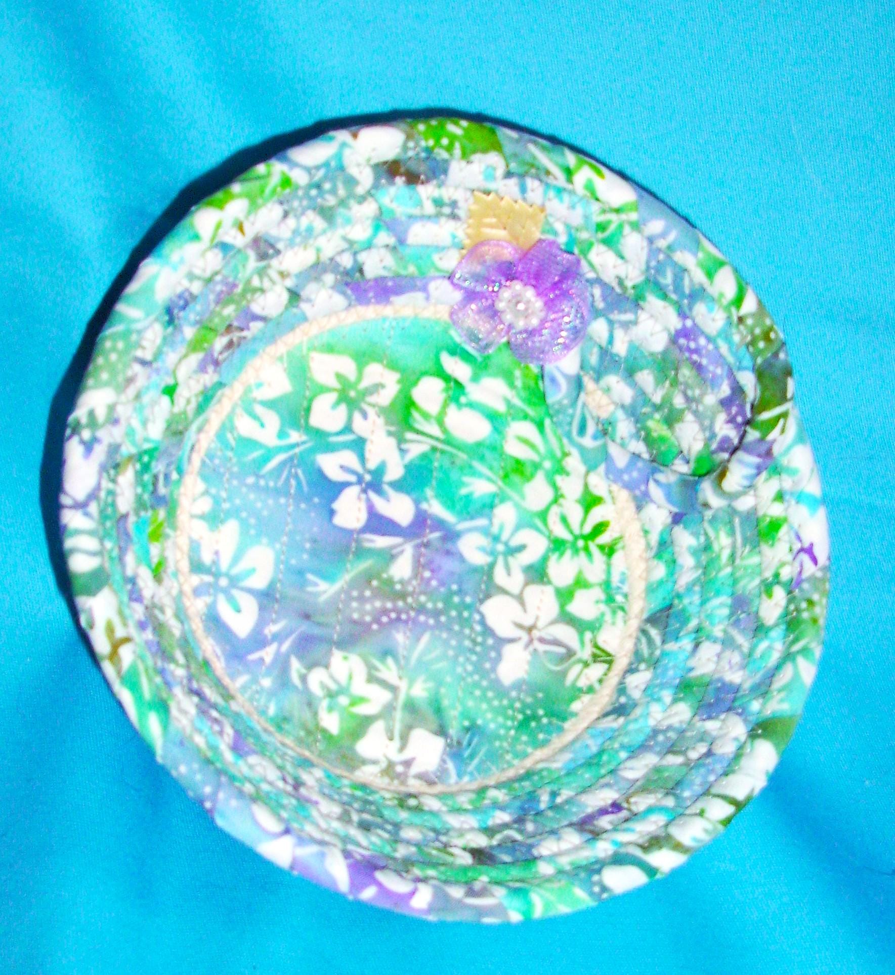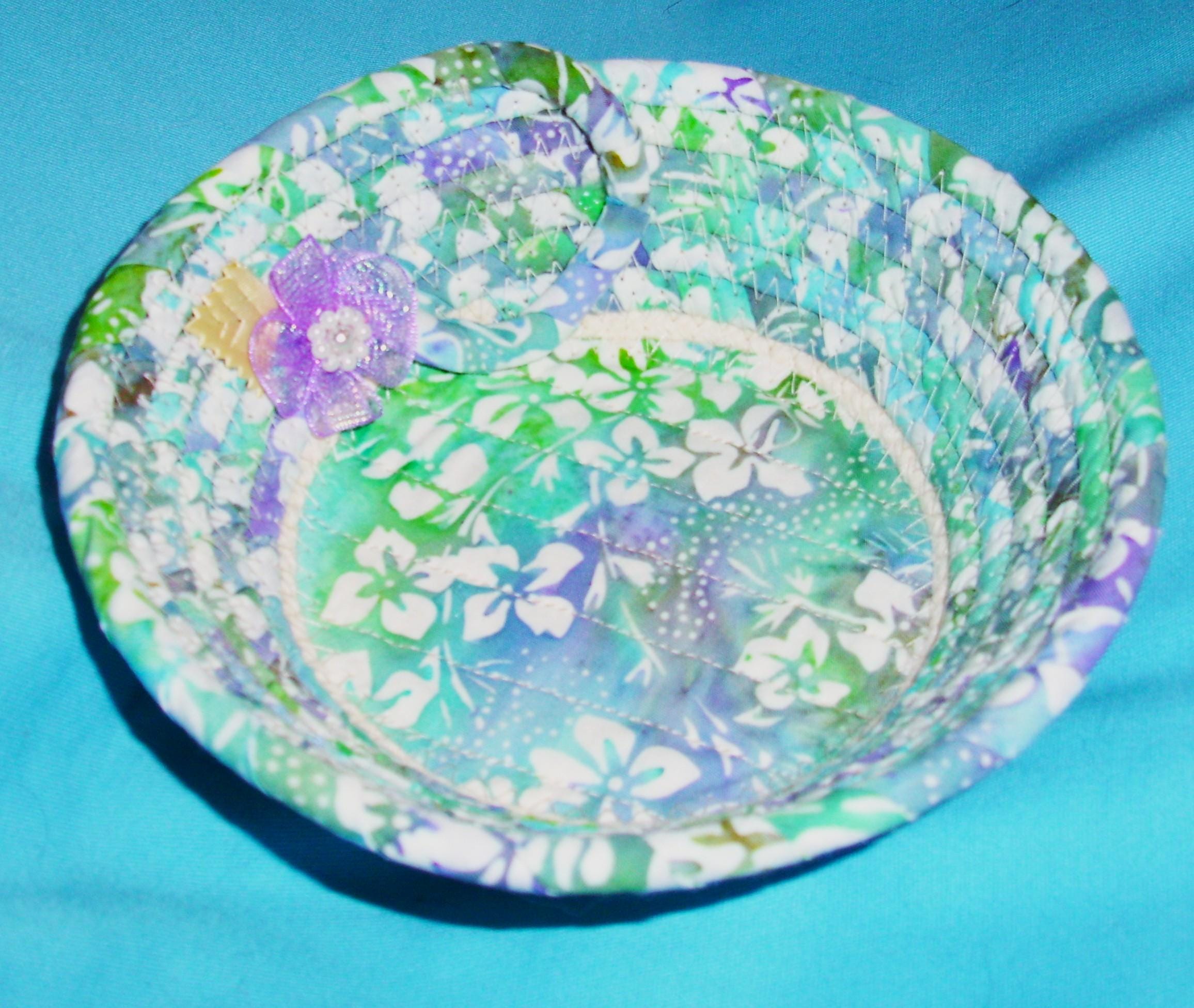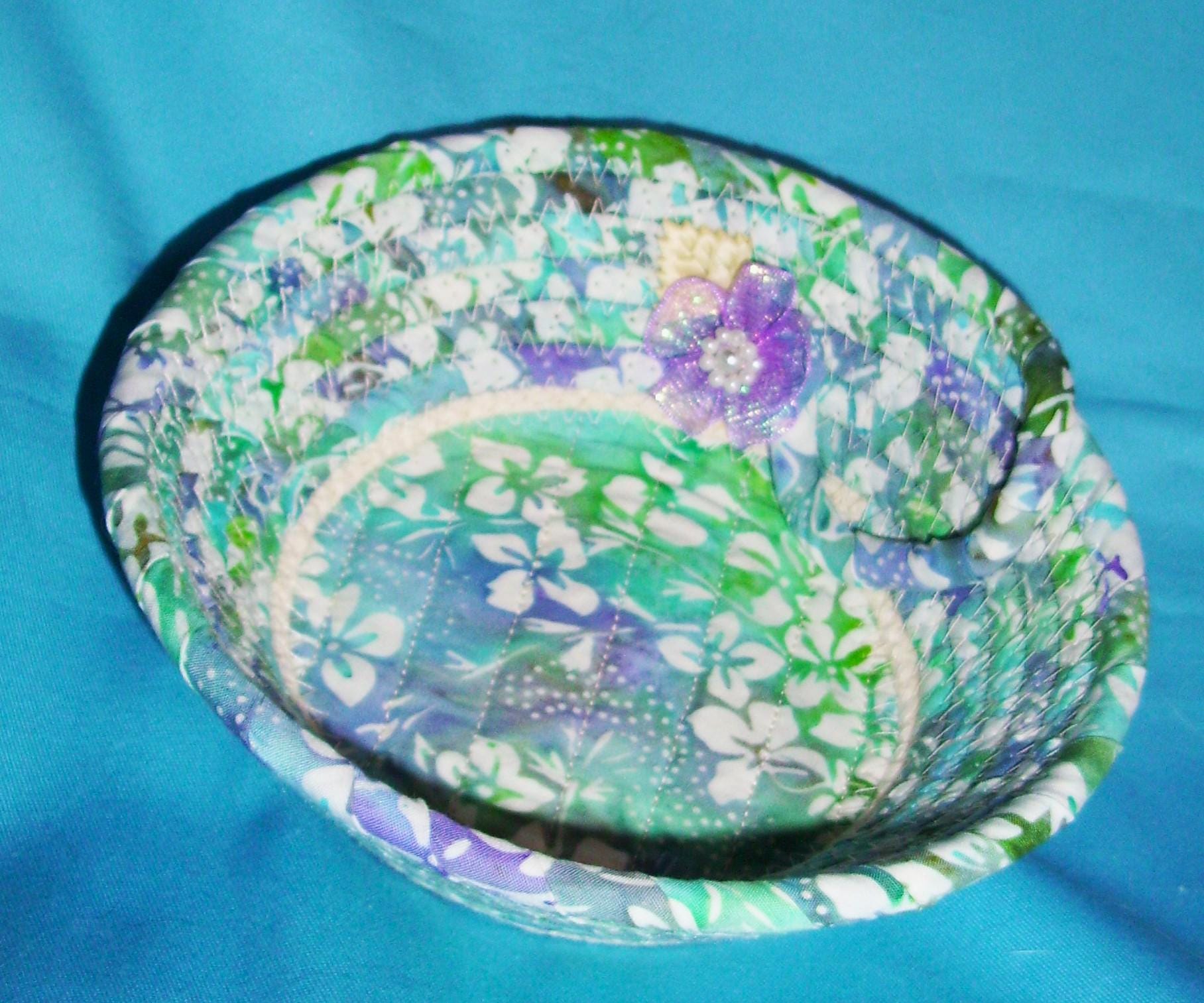 Small fabric wrapped rope bowl with a channel quilted base.